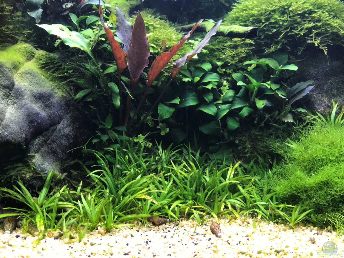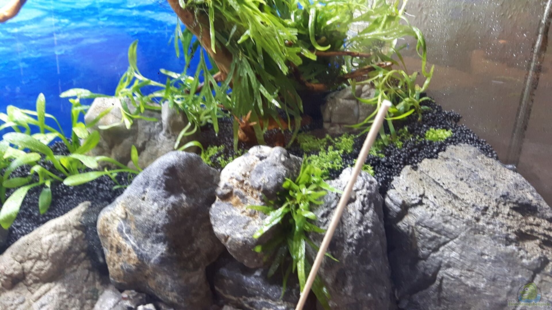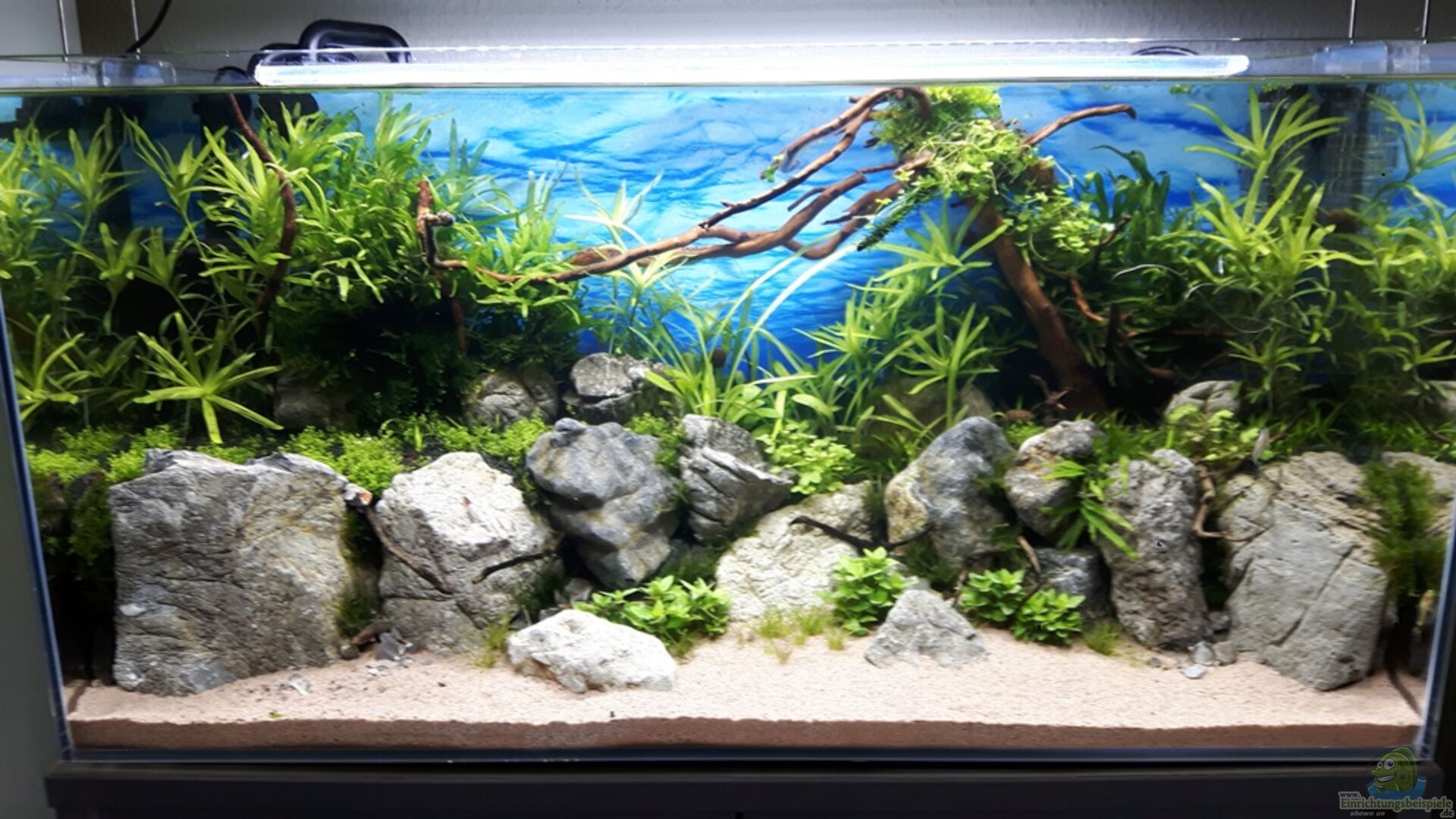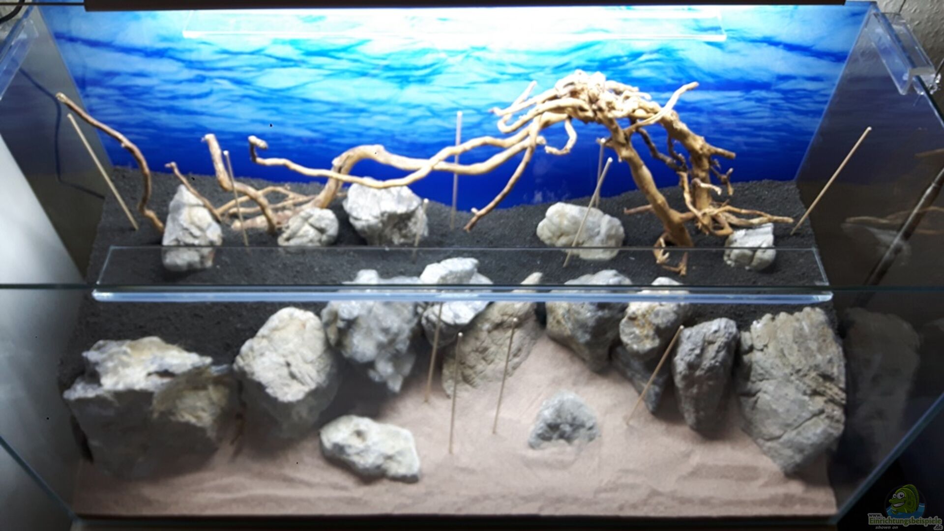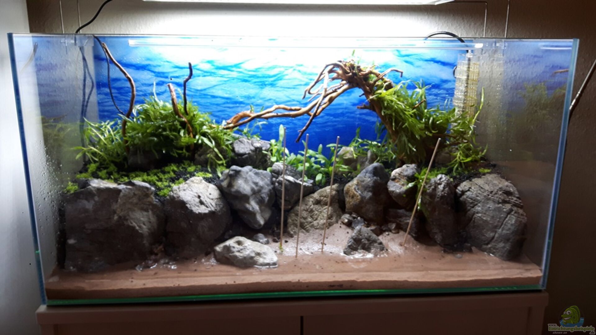Habe den vorderen Sand gegen ADA Colorado sand ausgetauscht und noch ein bisschen anders bepflanzt. In den hinteren Teil habe ich eine Straus an Talawa Wood mit einem Kabelbinder zusammengebunden und in die Bestandswurzel geklemmt um ein bisschen mehr Tiefe in das Becken zu bringen. Die blaue Rückwand habe ich entfernt.
