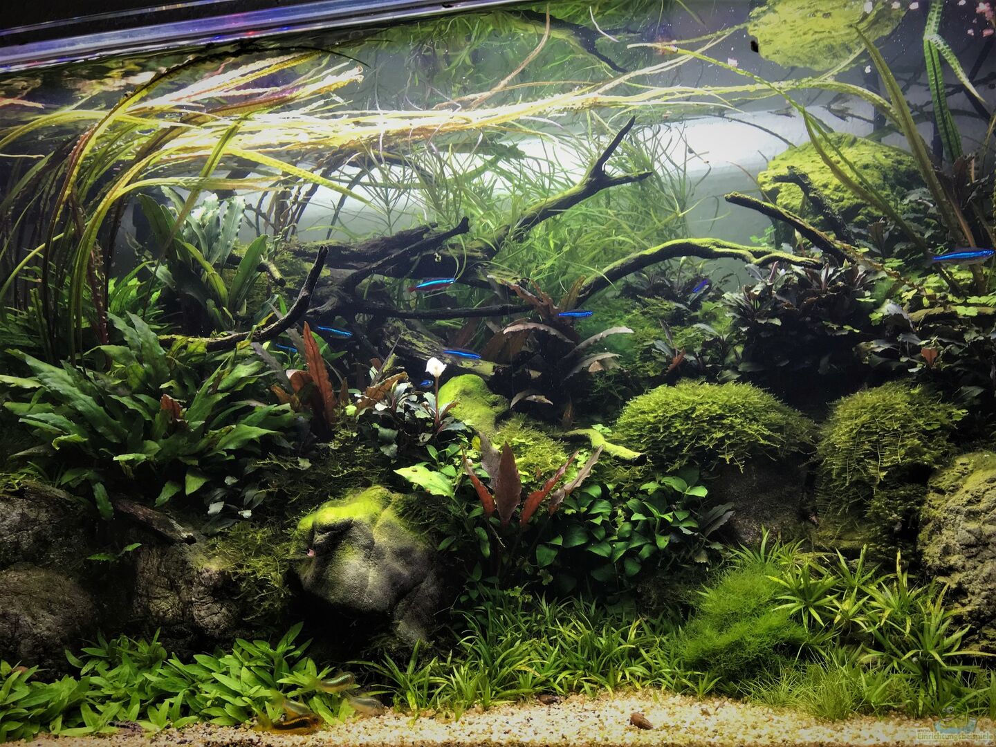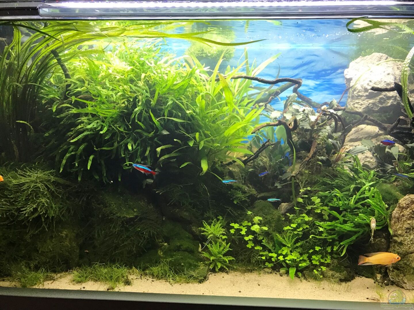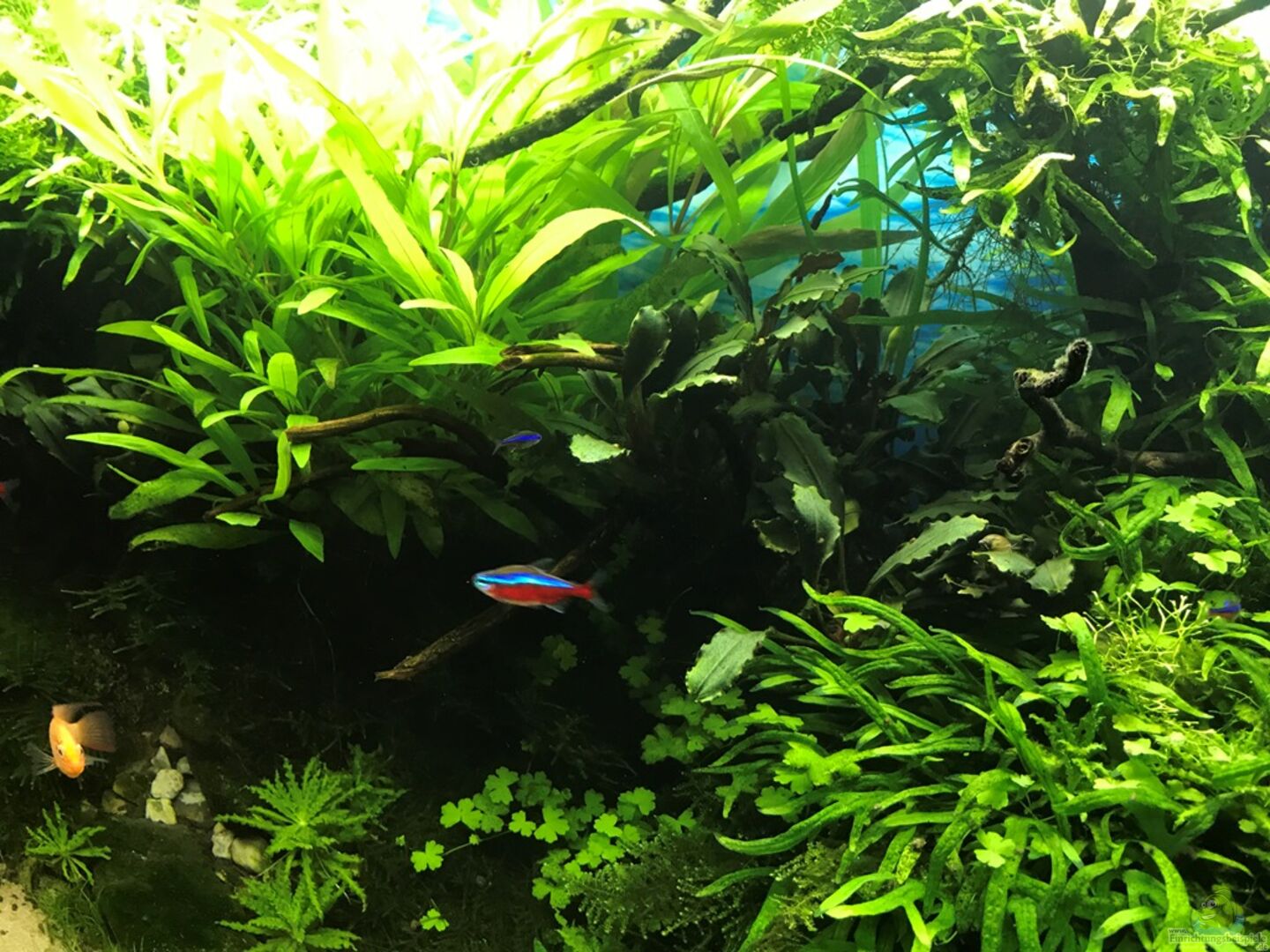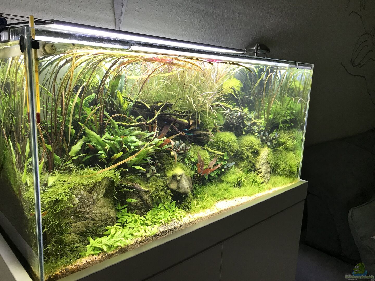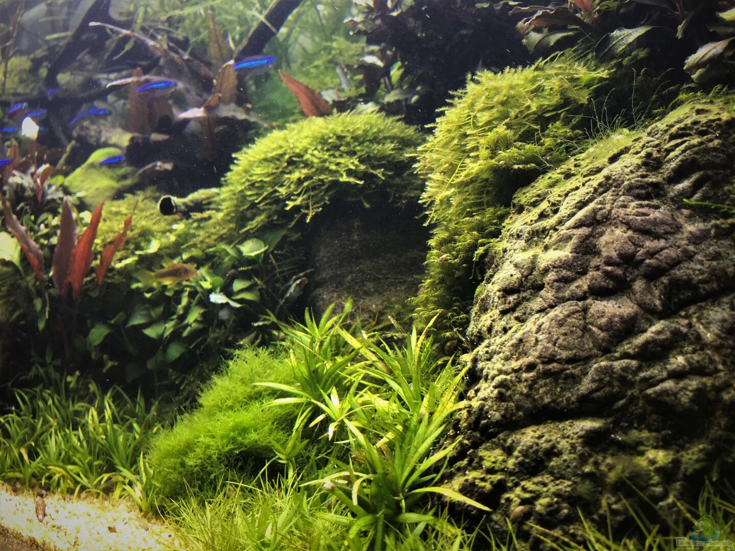 Habe den vorderen Sand gegen ADA Colorado sand ausgetauscht und noch ein bisschen anders bepflanzt. In den hinteren Teil habe ich eine Straus an Talawa Wood mit einem Kabelbinder zusammengebunden und in die Bestandswurzel geklemmt um ein bisschen mehr Tiefe in das Becken zu bringen. Die blaue Rückwand habe ich entfernt.