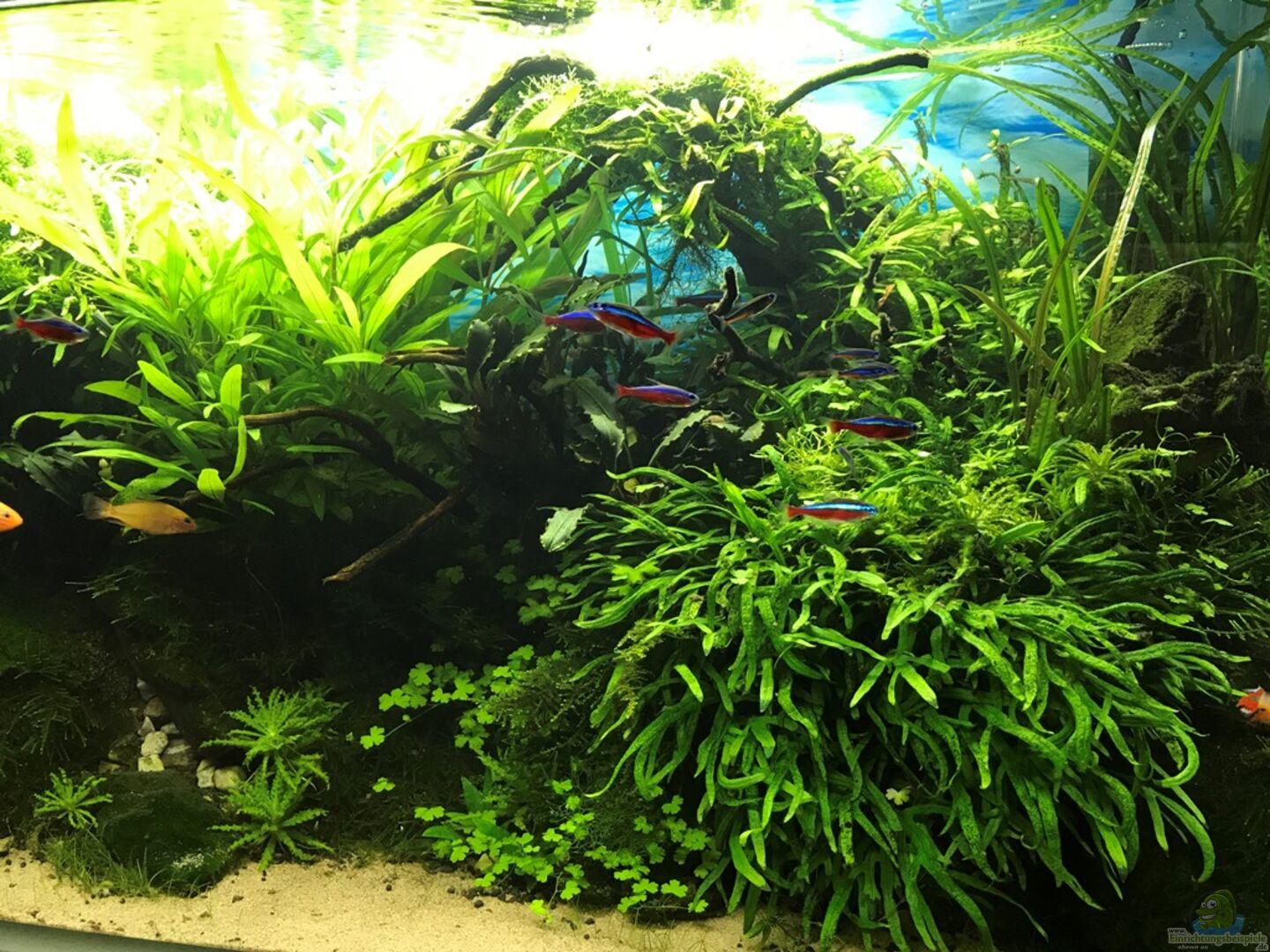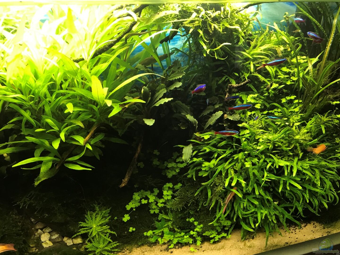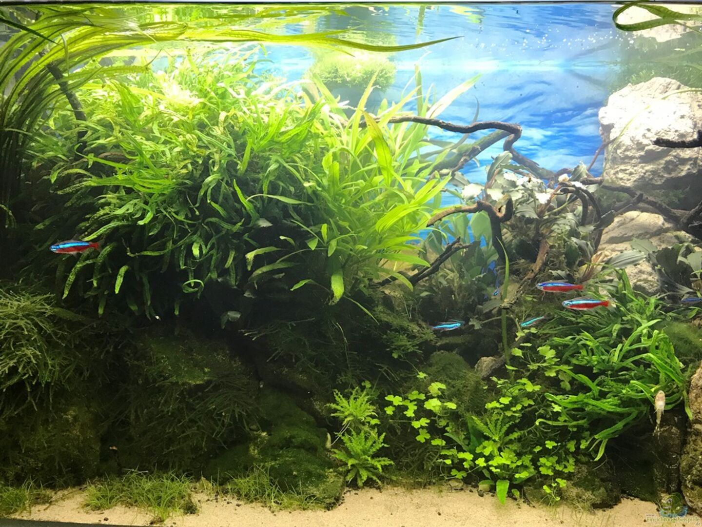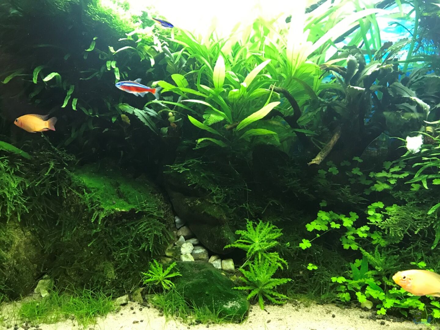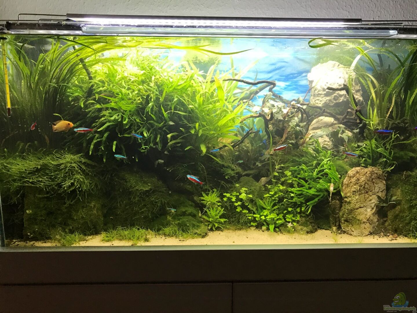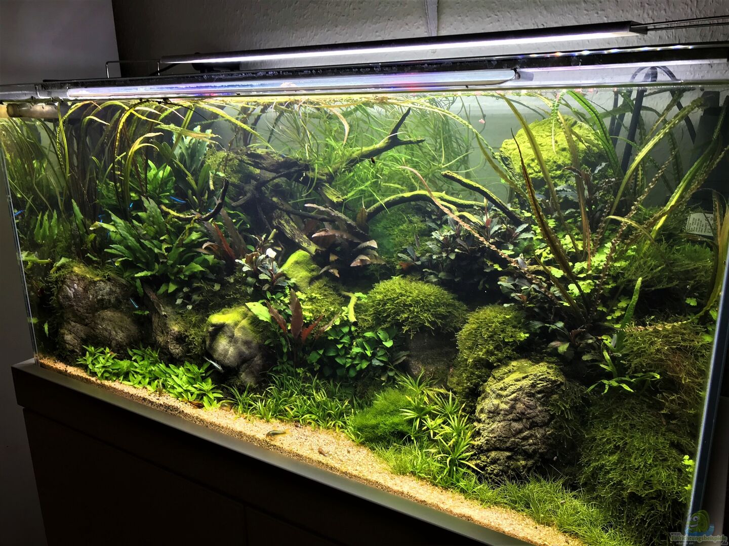 Habe den vorderen Sand gegen ADA Colorado sand ausgetauscht und noch ein bisschen anders bepflanzt. In den hinteren Teil habe ich eine Straus an Talawa Wood mit einem Kabelbinder zusammengebunden und in die Bestandswurzel geklemmt um ein bisschen mehr Tiefe in das Becken zu bringen. Die blaue Rückwand habe ich entfernt.