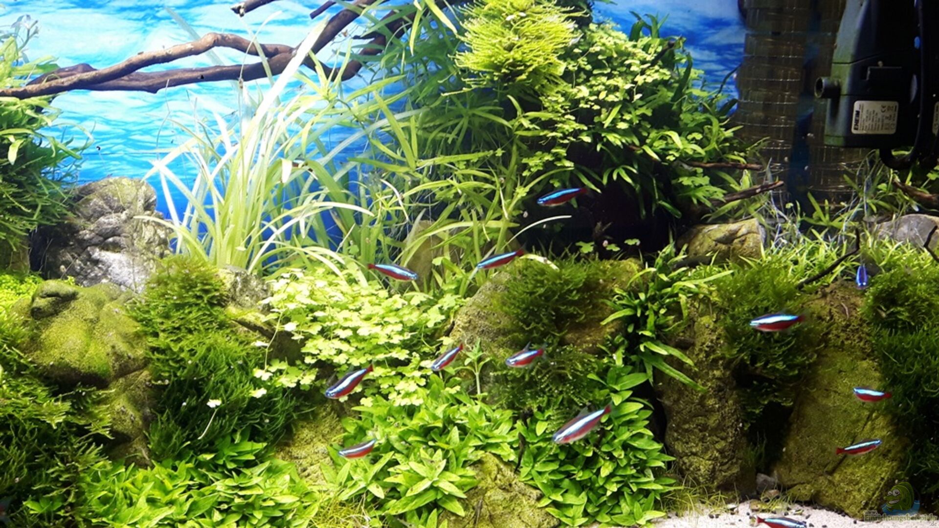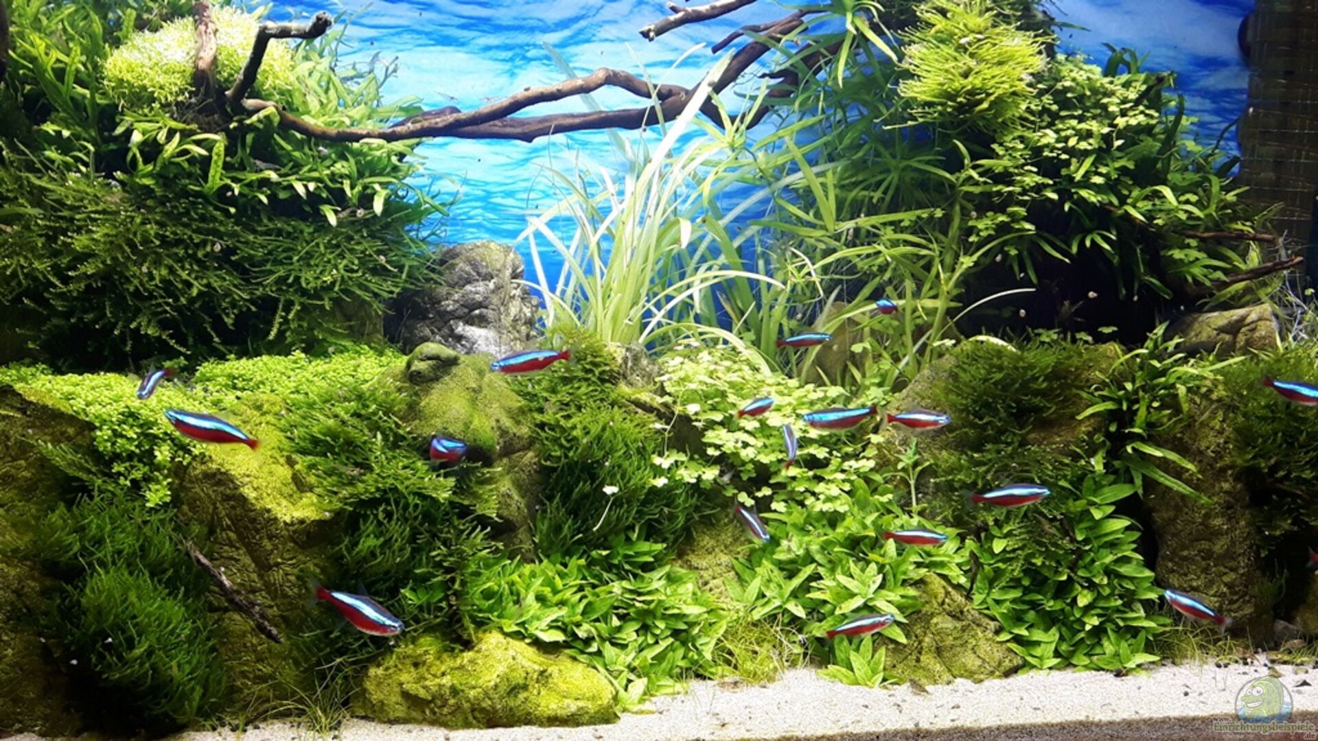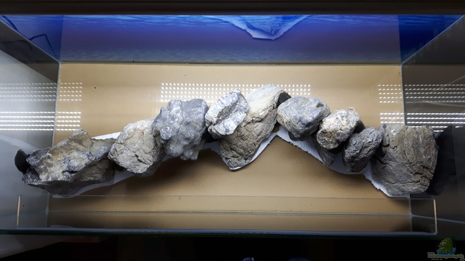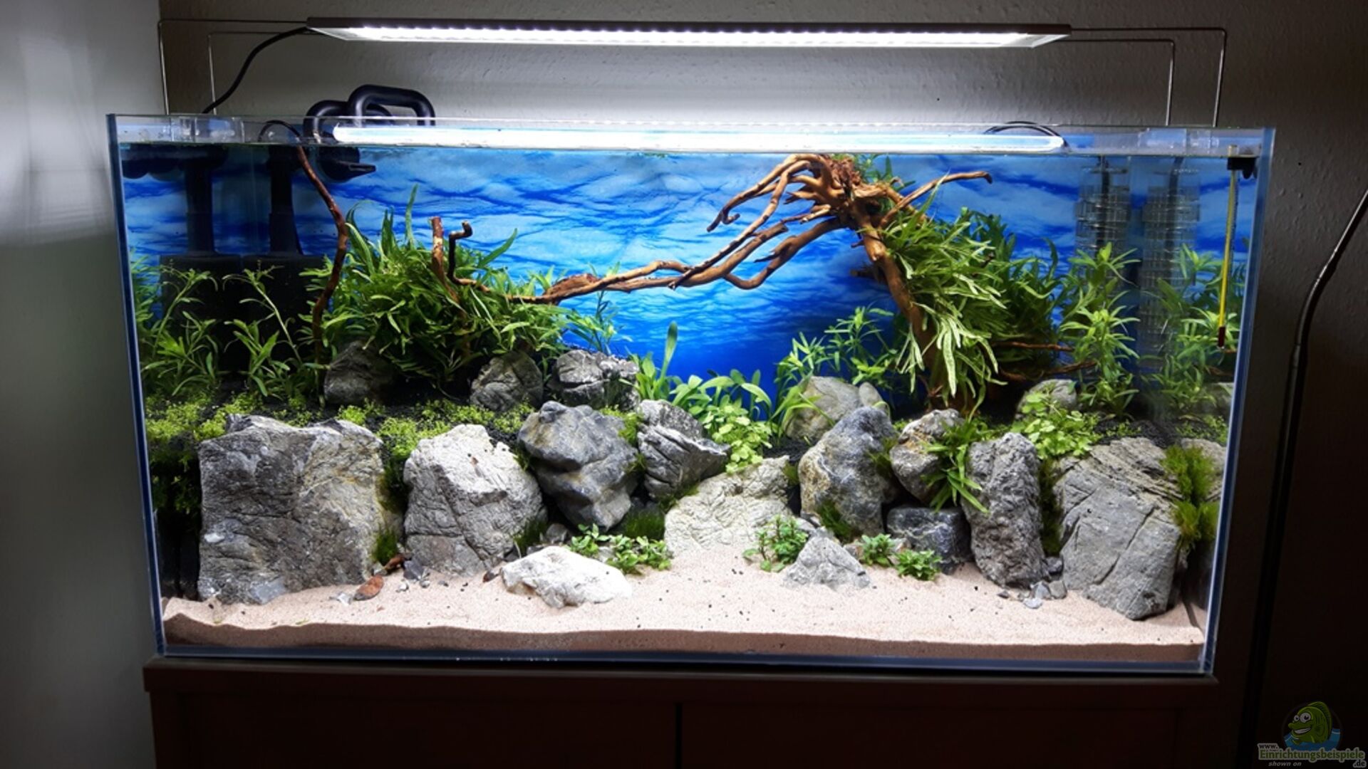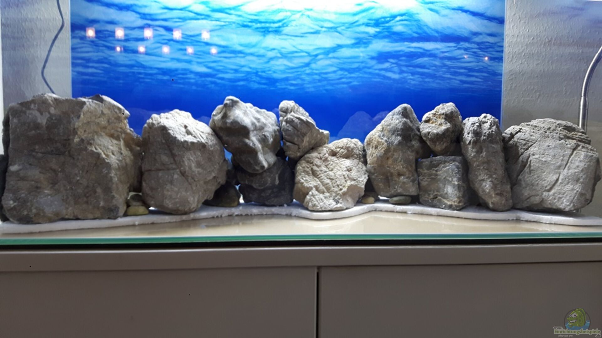 Ich habe versucht eine Küstenzone nachzustellen. Vorne der Sandstrand. In der Mitte die Steilküste, die teilweise überwuchert sind und im Hintergrund der dichte Dschungel.. Als Hintergrundfolie habe ich eine mit Wasser angebrachte blaue "Unterwasserfolie" ausgesucht. Das tiefe Blau gibt dem Aquarium zusätzlich mehr Tiefe. Den Aquariumunterschrank habe ich mir extra in einer Höhe von 1, 10 Metern vom Schreiner anfertigen lassen, da ich recht gro?? bin und ich beim Säubern des Aquariums immer ziemliche Rückenschmerzen bekommen habe. Ein weiterer Vorteil ist, dass ich das Aquarium auf "Augenhöhe" habe, wenn ich auf der Couch sitze.