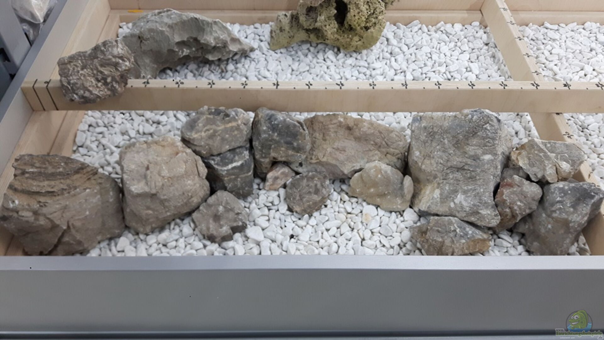 Ich musste um die Zwischenräume zwischen den einzelnen Steinen dicht zubekommen Filterwatte in die Räume stopfen sonst rieselt das Soil immer vom Hintergrund auf den feinen Sand in den Vordergrund. Die Filterwatte wurde dann mit kleinen Steinen kaschiert.