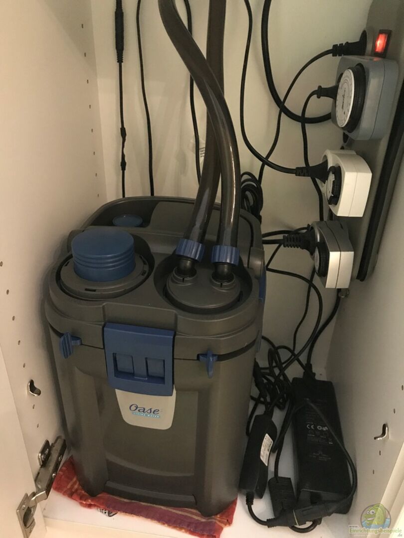 Oase BioMaster 250. Da ich das Soil extrem hoch im Hintergrund habe ansteigen lassen, war für das Einlaufrohr nur noch sehr wenig Platz. Also habe ich kurzerhand mit einer Säge das Rohr um circa 2/3 gekürzt. ??ber den Fangkorb am Einlaufrohr habe ich einen runden groben Filterschwamm, erst ausgehölt und dann darübergestülpt. Dies hat zwei Vorteile: