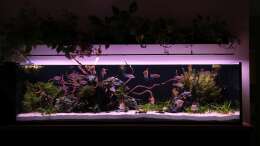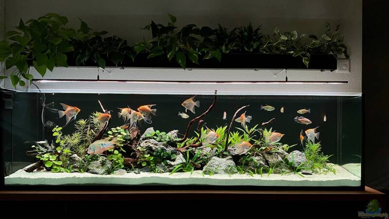 Mein Planungsziel war ein Becken, welches sich harmonisch in das Wohnzimmer integriert und aus der Platzsituation heraus auf Aussenfilter und CO2 verzichten muss. So habe ich einen Glasfilter eingeplant und bei der Pflanzenauswahl auf geringen CO2 Bedarf geachtet. Bei der Gestaltung habe ich mich von vielen Aquascape Beispielen inspirieren lassen, aber ohne den Anspruch zu besitzen dass mein Ergebnis allen Regeln entspricht. Daraus geworden ist ein grünes und modernes Becken mit vielen lebhaften Fischen an dem wir viel Freude haben.