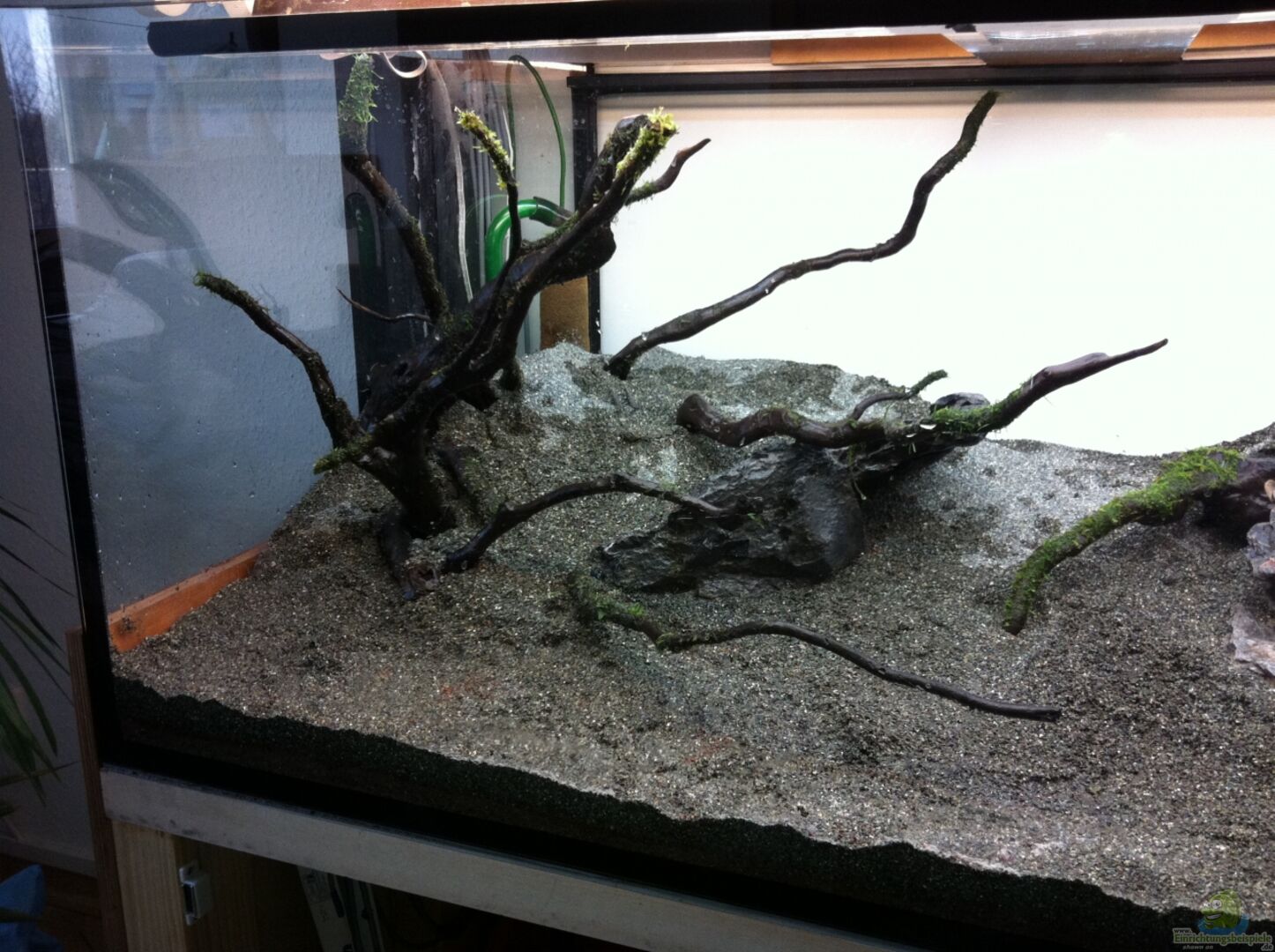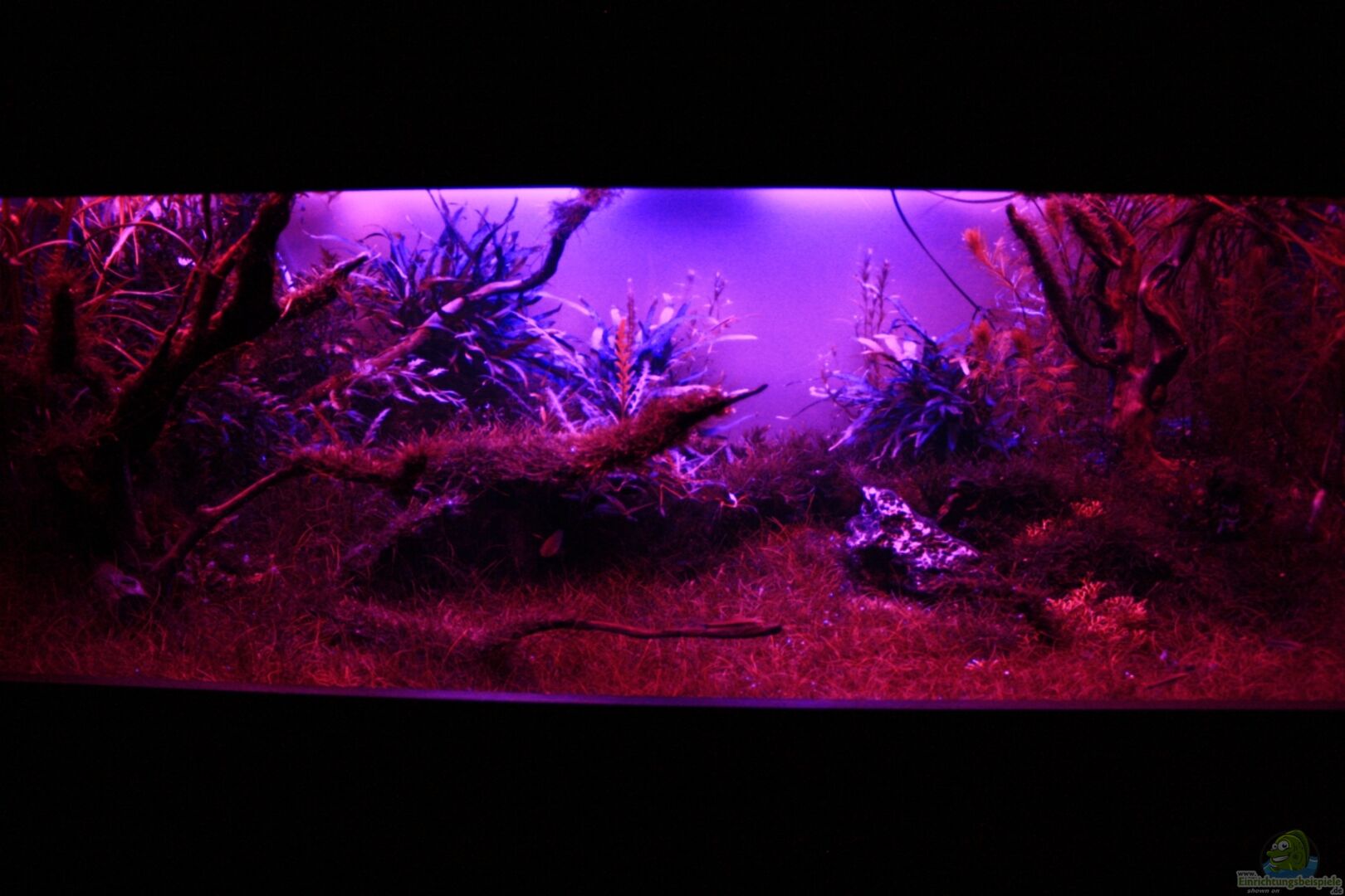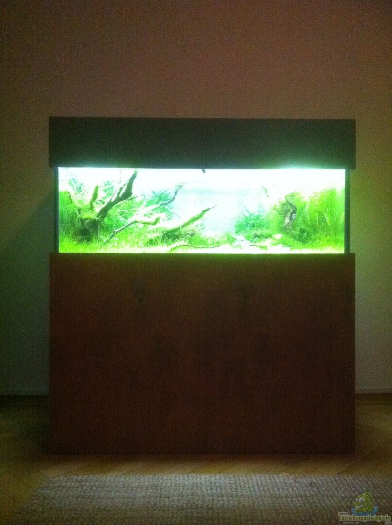 Auf die Nutzung einer Formenrückwand habe ich aus Platzgründen, aber auch vor allem aus ästhetischen Gründen verzichtet. Sattdessen gab es eine rein wei??e Platte, die jetzt von oben mit einer blauen LED IKEA-Leuchte angestahlt wird. Es gäbe auch die Möglichkeit das Weis durch eine aufgebrachte Milchglassfolie, die dann vonn hinten betraht werden könnte, zu realisieren. Dies hat aber den Nachteil, das der Hintergrund bei eventuellen Schäden oder Verunreinigungen und eingerichteten Aquarium schlecht zu reinigen oder zu wechseln wäre. Bei meinen Lösung schiebe ich einfach ne neue oder auch gereinigte Platte ein un fertig. Da ich gerne sehen möchte wie sich mein kleinen Biotop, mein eigenes Stück Natur, über Jahre entwickelt, finde ich meine Variante sicherer.