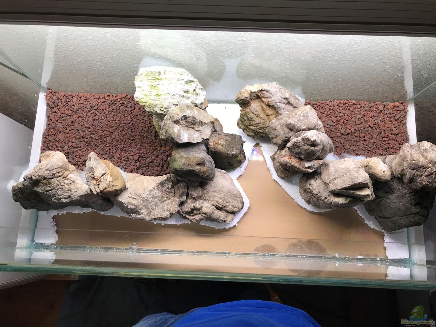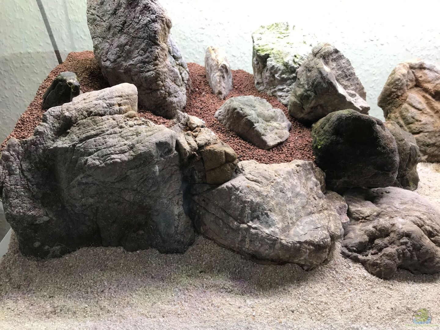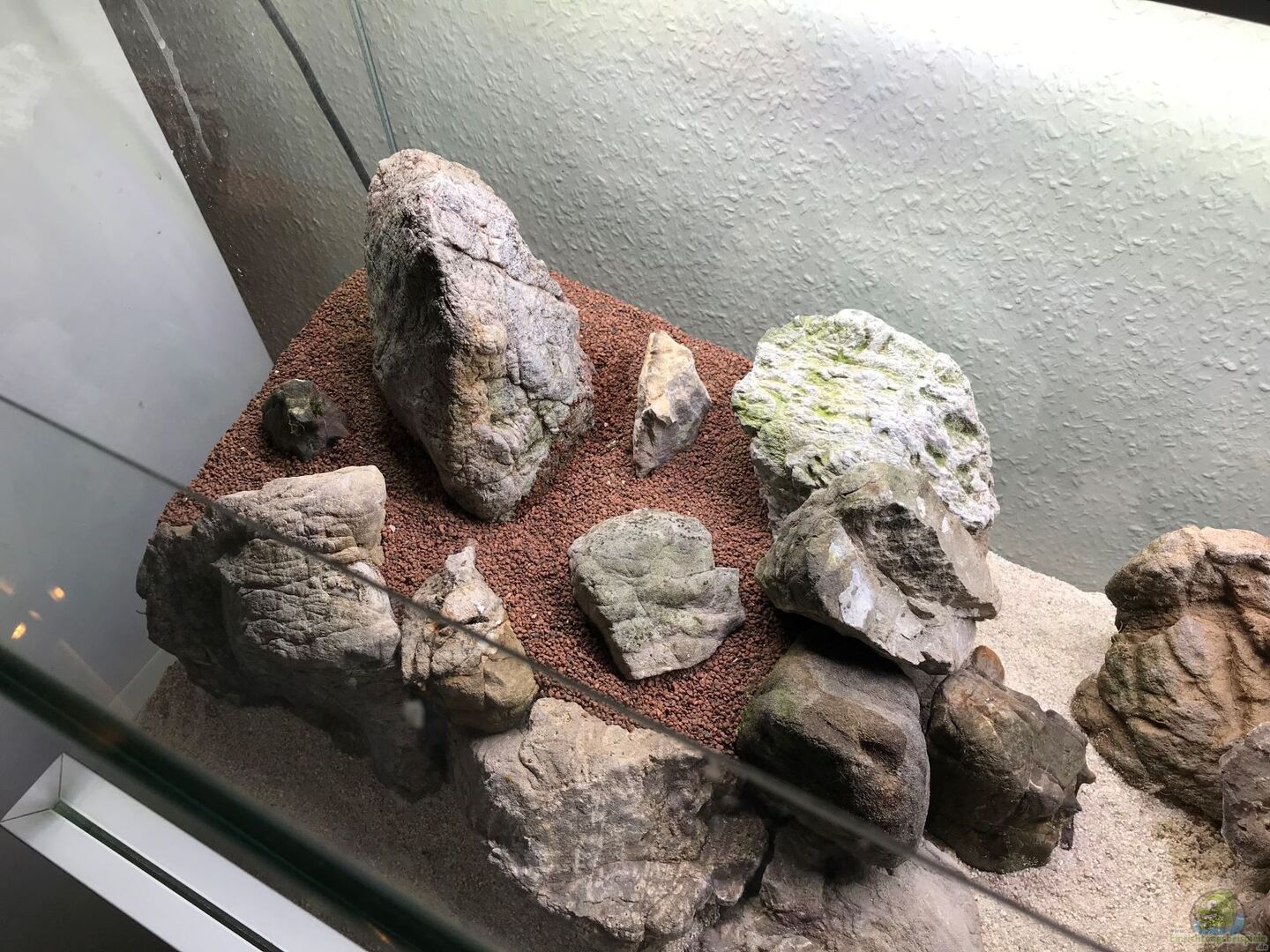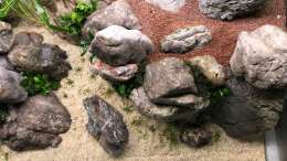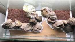 Der Bodengrund hinter den Steinen besteht aus JBL Volcano, dann eine Schicht Laterit zur Grundversorgung. Abgedeckt habe ich dann mit JBL Manado. Die Steine habe ich auf eine Styroporplatte gesetzt, um die Bodenplatte zu schützen. Danach habe ich die Platte abgeschnitten und nur unter den Steinen belassen. Die zweite Ebene habe ich mit Dennerle Substratdüngeboden ausgekleidet. Danach habe ich eine ca 2cm dicke Schicht ADA La Plata Sand eingefüllt. Bis jetzt kann ich berichten , da?? die Zwergnadelsimse das alles gut mitmacht und zufriedenstellend wächst. Wenn ich mal eine paar Triebe rauszupfe , um nicht alles überwuchern zu lassen, ist der Substratboden sehr gut, da er eine ähnliche Färbung wie der La Plata sand hat.