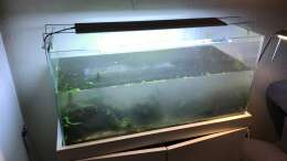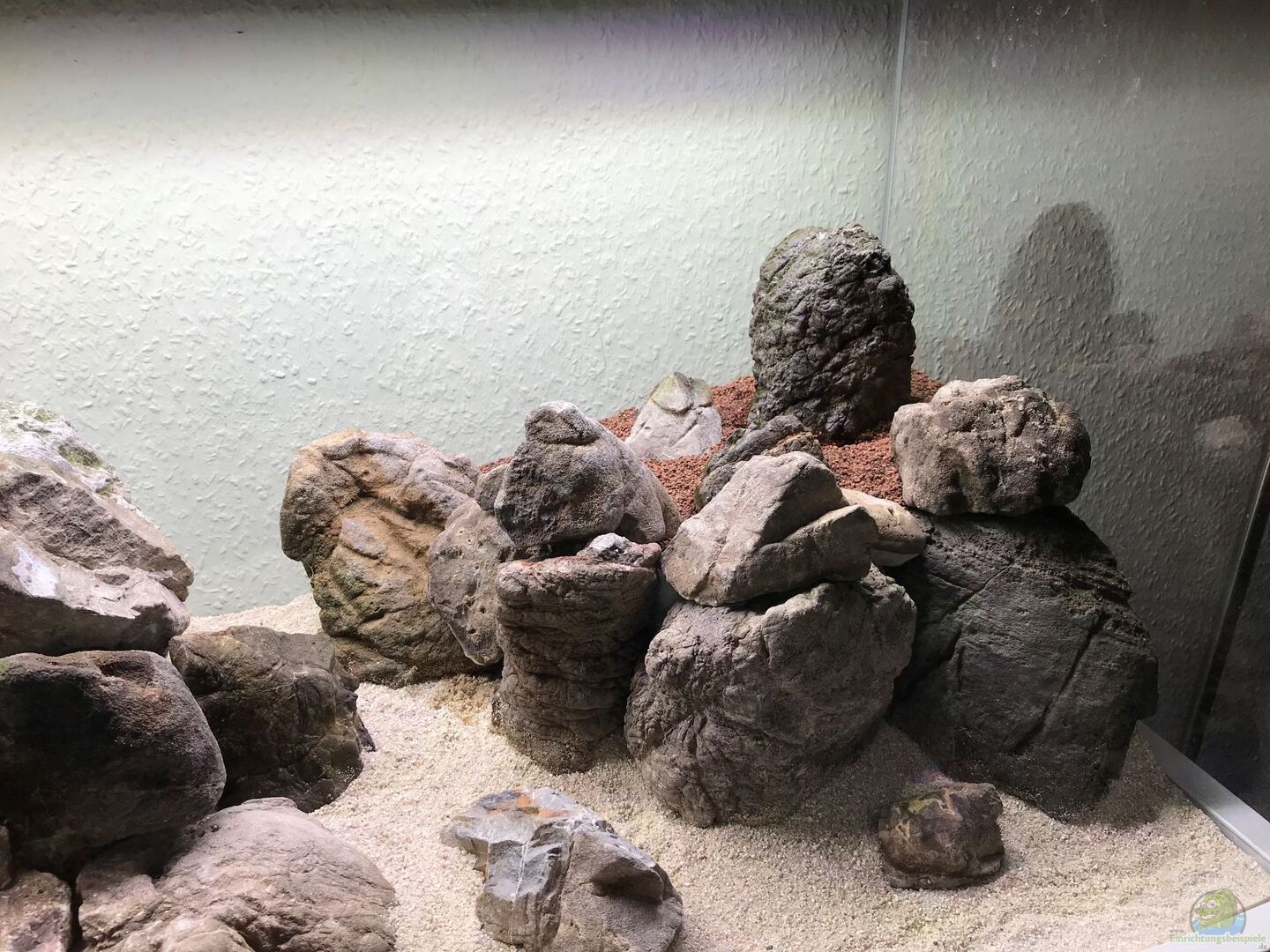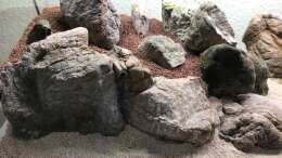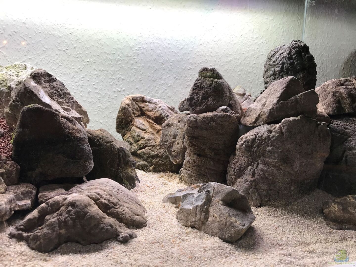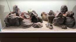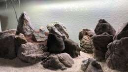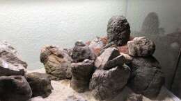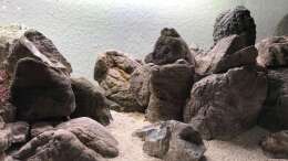Der Bodengrund hinter den Steinen besteht aus JBL Volcano, dann eine Schicht Laterit zur Grundversorgung. Abgedeckt habe ich dann mit JBL Manado. Die Steine habe ich auf eine Styroporplatte gesetzt, um die Bodenplatte zu schützen. Danach habe ich die Platte abgeschnitten und nur unter den Steinen belassen. Die zweite Ebene habe ich mit Dennerle Substratdüngeboden ausgekleidet. Danach habe ich eine ca 2cm dicke Schicht ADA La Plata Sand eingefüllt. Bis jetzt kann ich berichten , da?? die Zwergnadelsimse das alles gut mitmacht und zufriedenstellend wächst. Wenn ich mal eine paar Triebe rauszupfe , um nicht alles überwuchern zu lassen, ist der Substratboden sehr gut, da er eine ähnliche Färbung wie der La Plata sand hat.