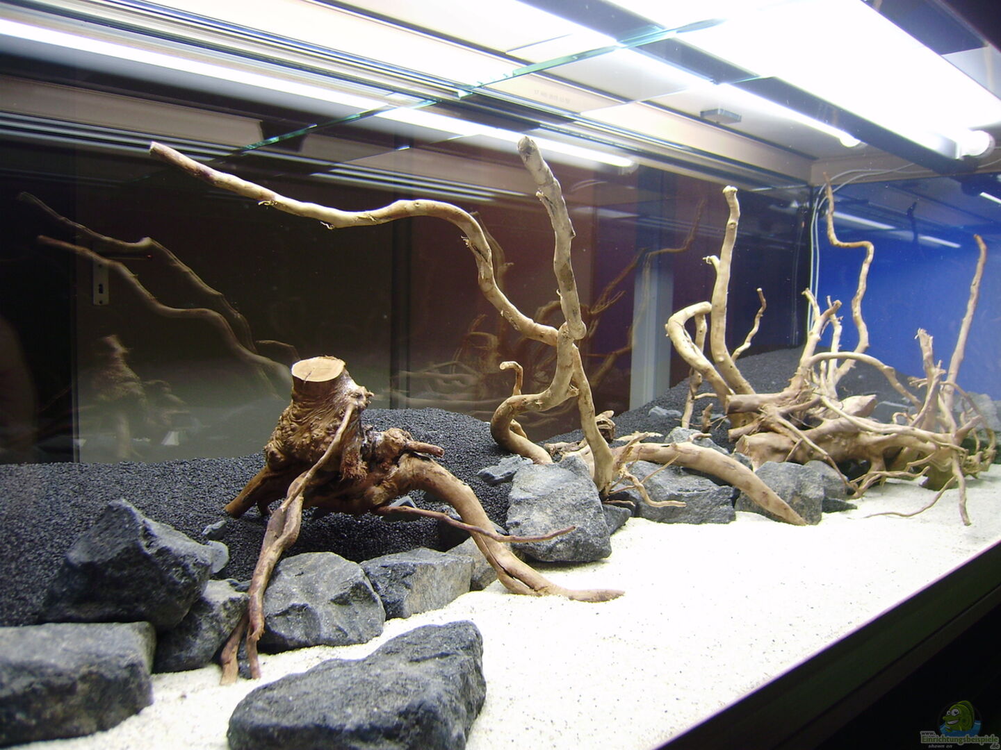 Die Abmessungen des Beckens sind entgegen dem aktuellen Aquascaping-Trend, bei dem die Becken eher hoch als breit sind, mit einer Tiefe von 50cm und einer Höhe von ca. 42cm genau richtig, zur Erzielung einer guten Tiefenwirkung.