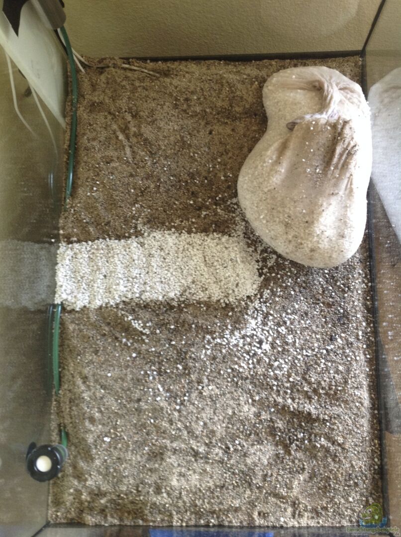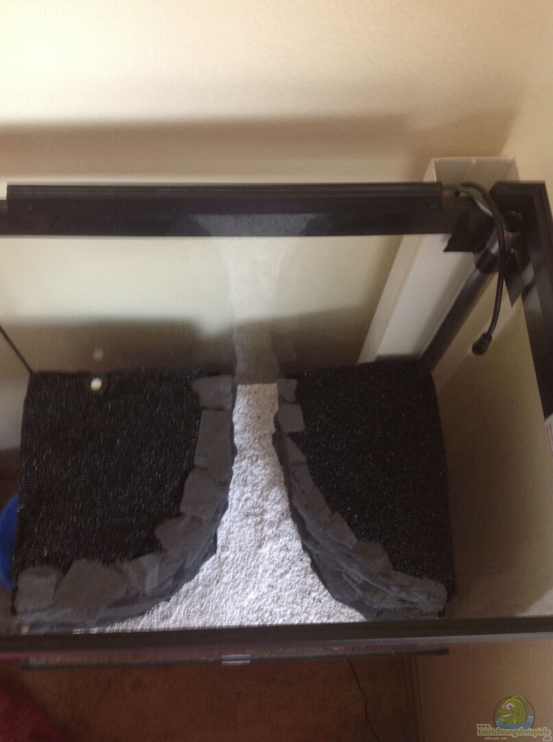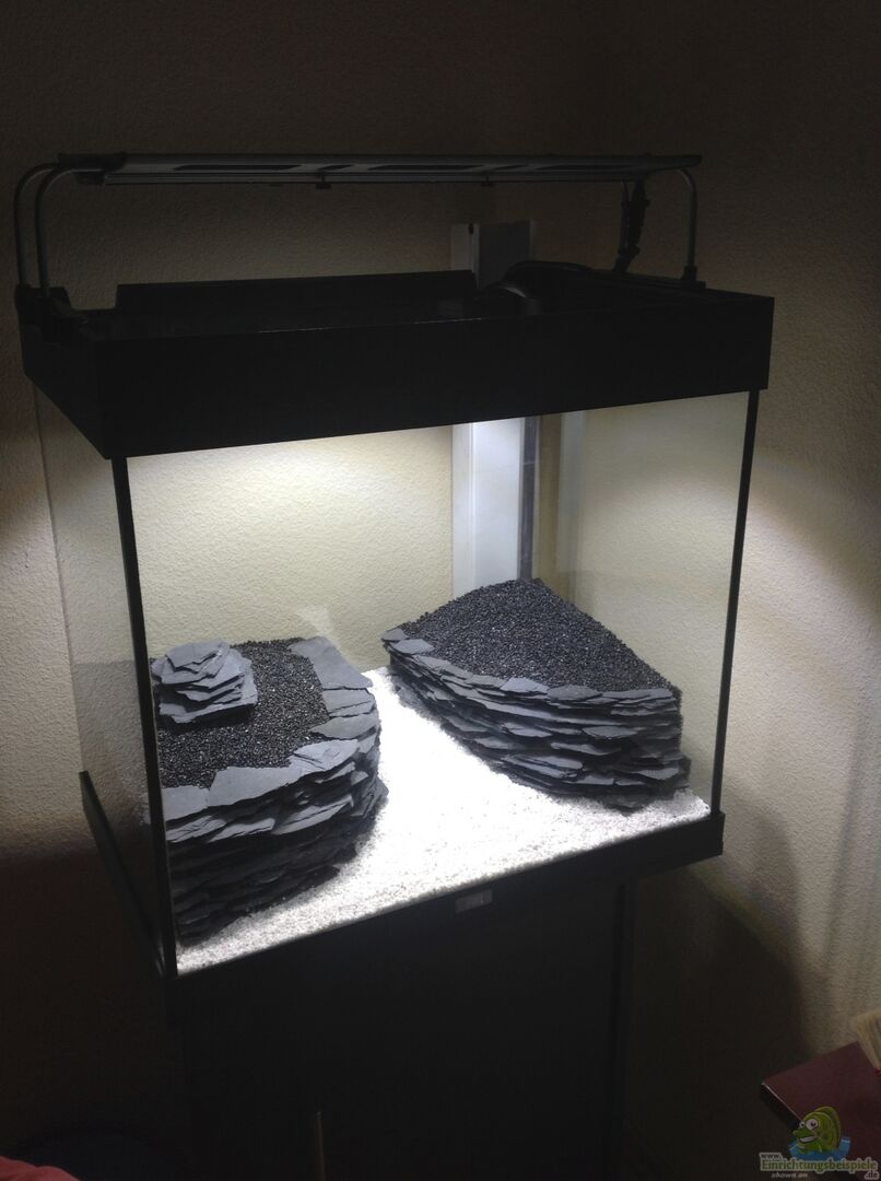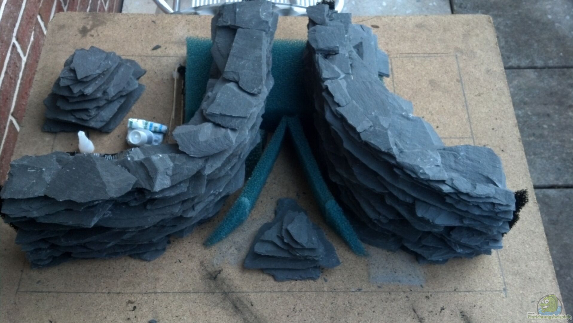 Naturschieferplatten aus Dachdeckereinkauf. Bearbeitet und mit Aquariensilikon verklebt. Dabei wurden nur Klebepunkte gesetzt um eine Sielbildung durch den Bodenheizer zu ermöglichen.