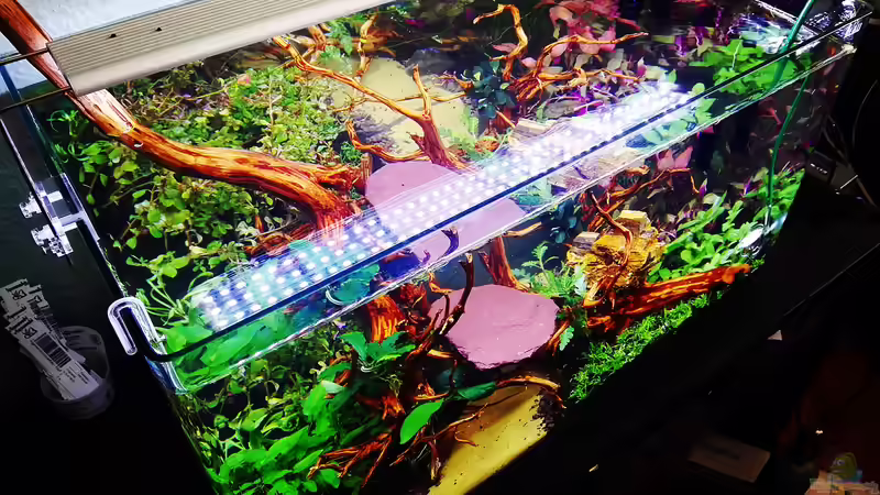 Zur Beleuchtung wird eine Chihiros Serie A A601mit einem LED System Edelstahlständer genutzt. Das LED System hat 39 W. Diese besitzt ca. 8000K und ca. 5800Lumen.