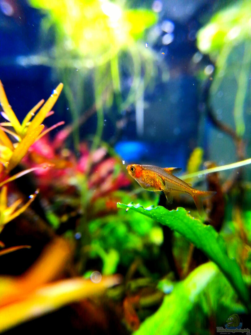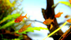 Die Fütterung der Funkensalmler erfolgt mit aquacando superColor, rote Mückenlarven und JBL Novo Color