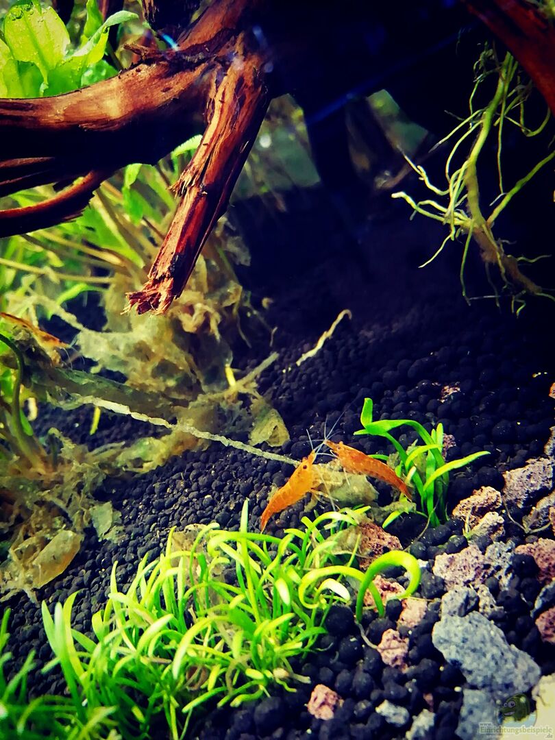 30 Orange Sakura Garnelen im Becken eingesetzt + Huminstoff hinzugefügt