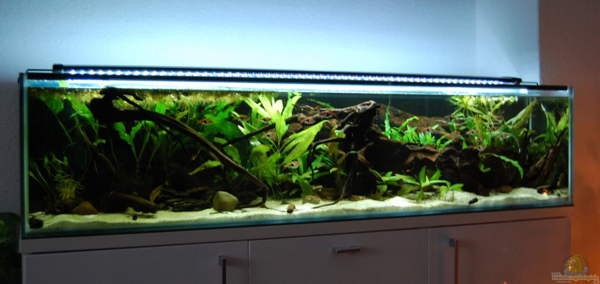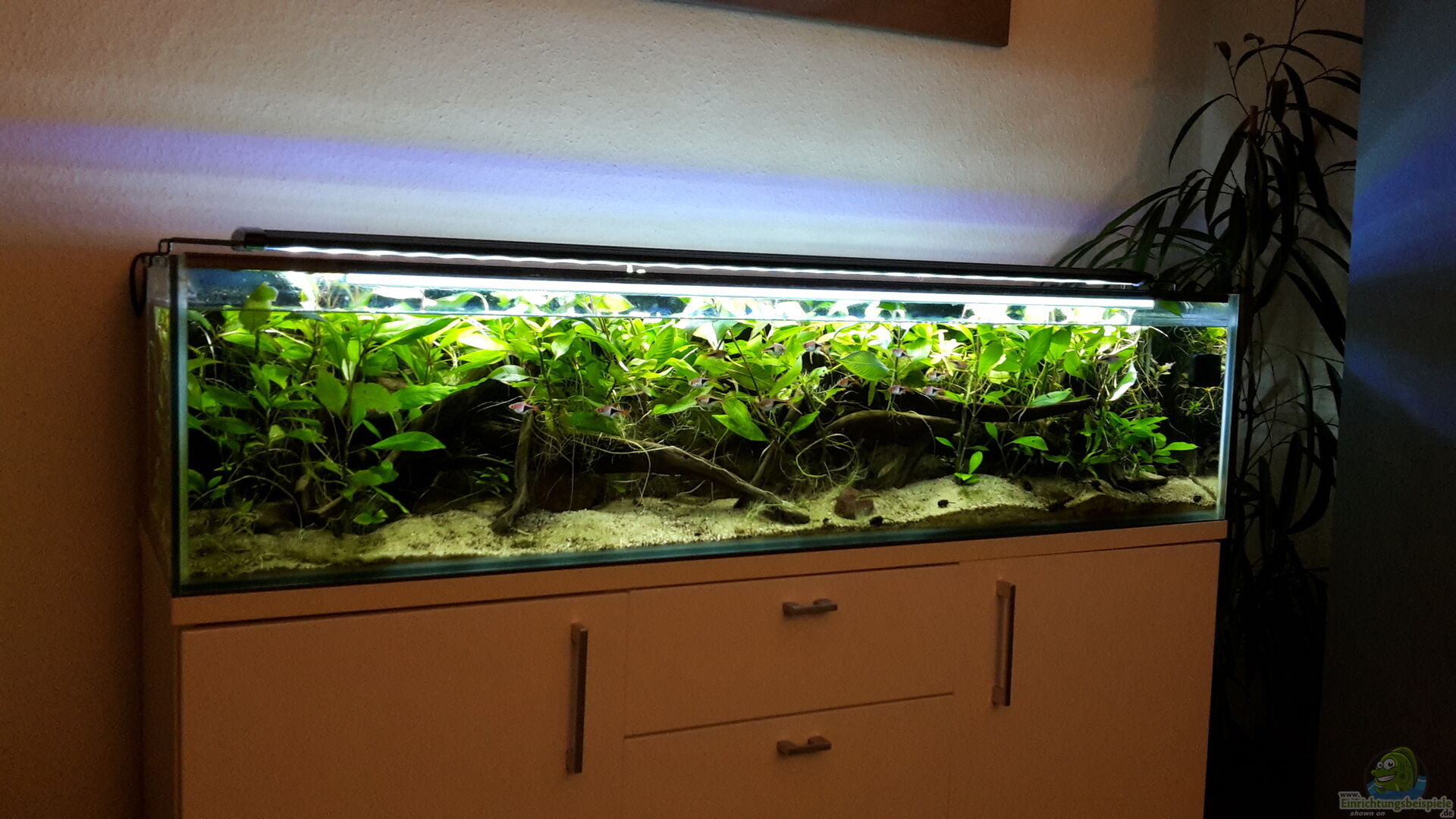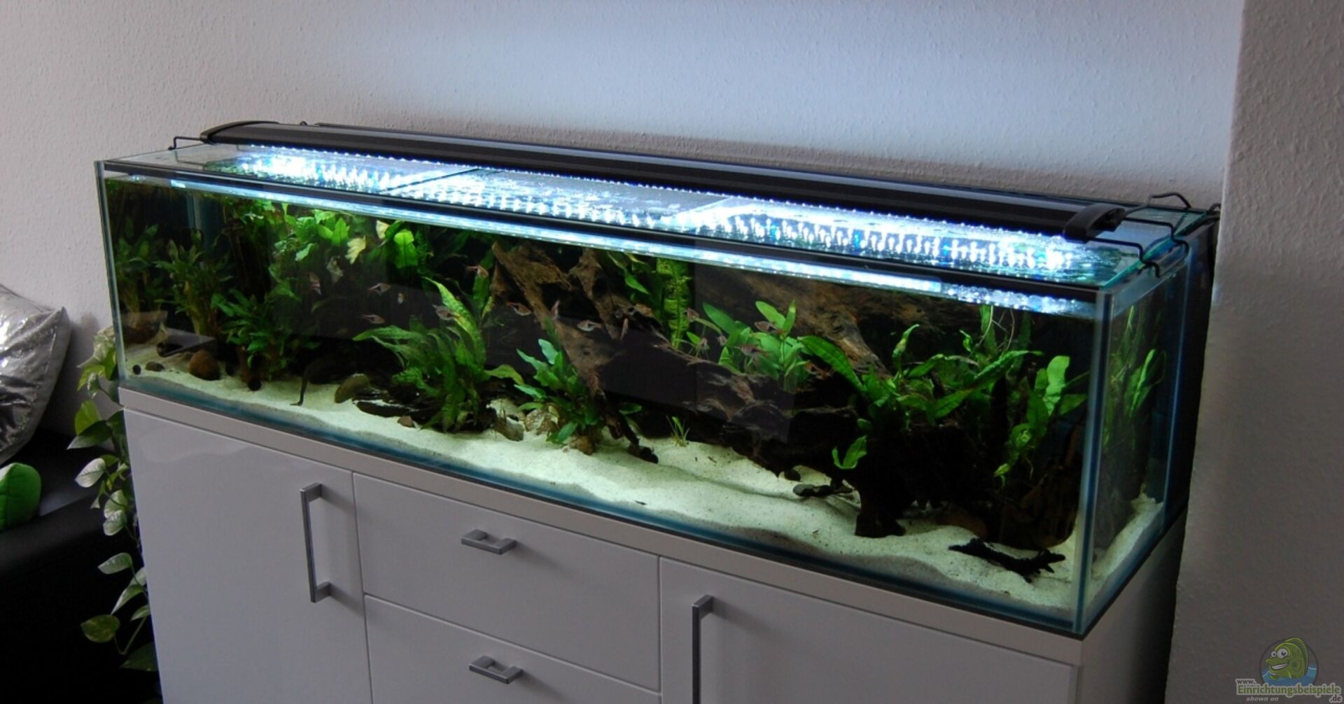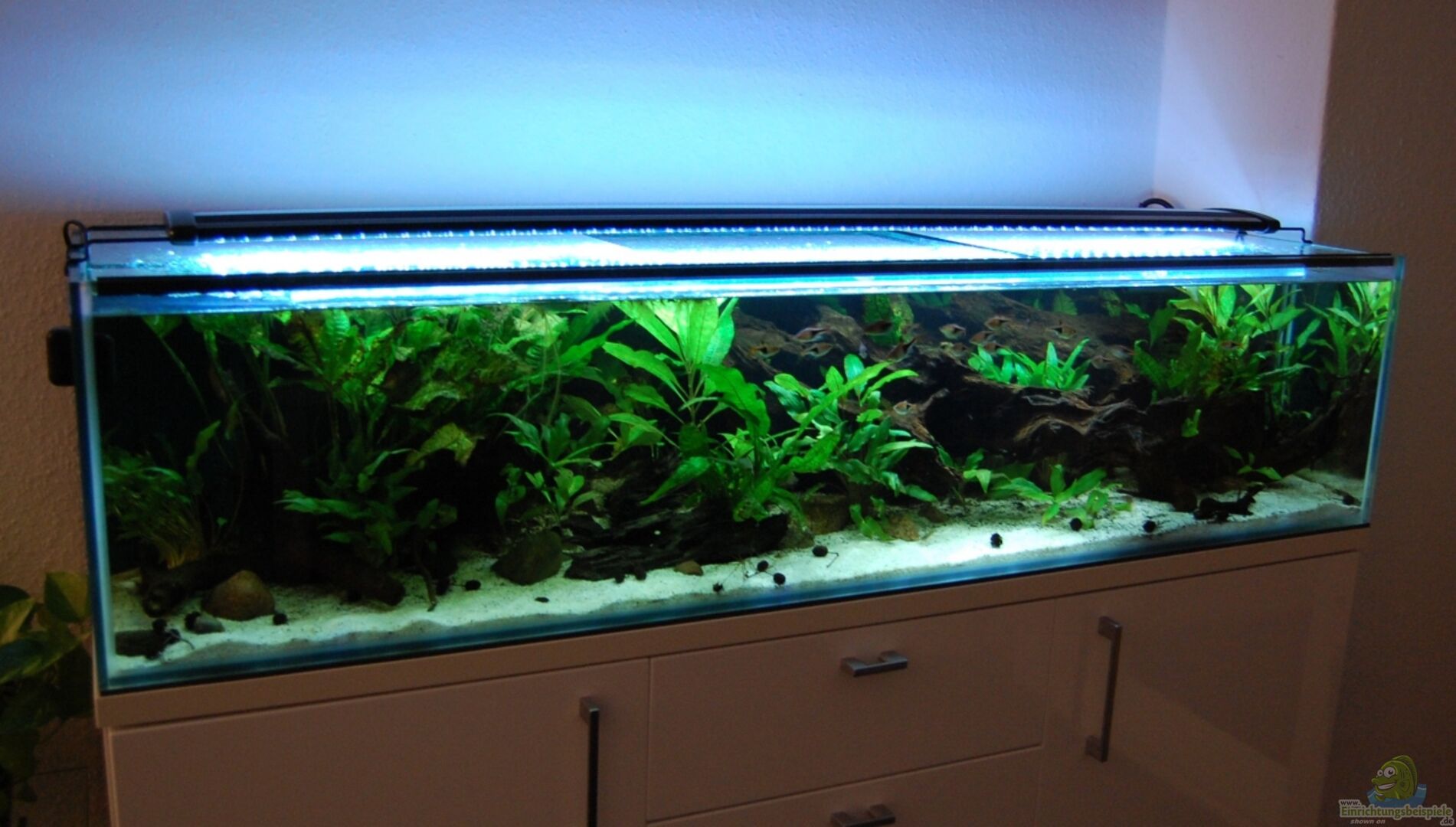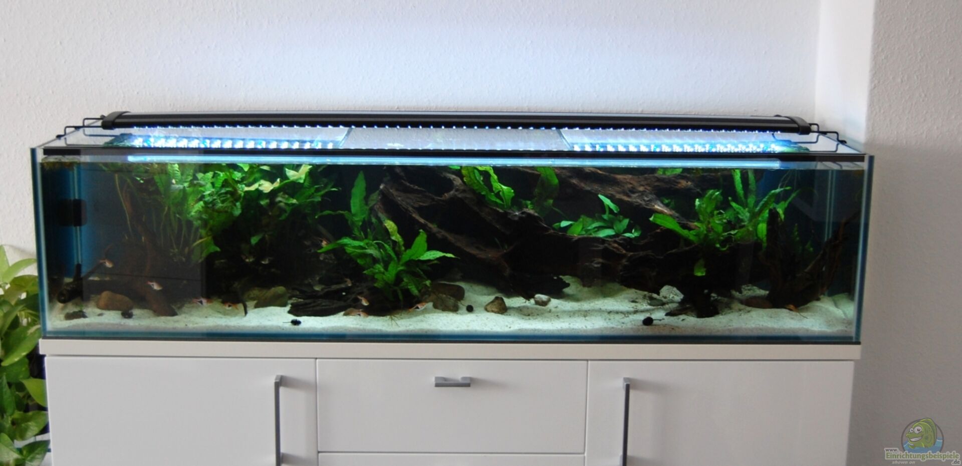 Wir sind umgezogen! Das Aquarium hat natürlich wieder einen Platz als Blickfang bekommen. Geändert hat sich wenig, Arbeit hat der Aquariumumzug dagegen reichlich gemacht. Neu kaufen musste ich mir eine Etime-LED-Leuchte, da meine bereits angeschlagene BeamsWork LED 800 den Umzug leider nicht überstanden hat.