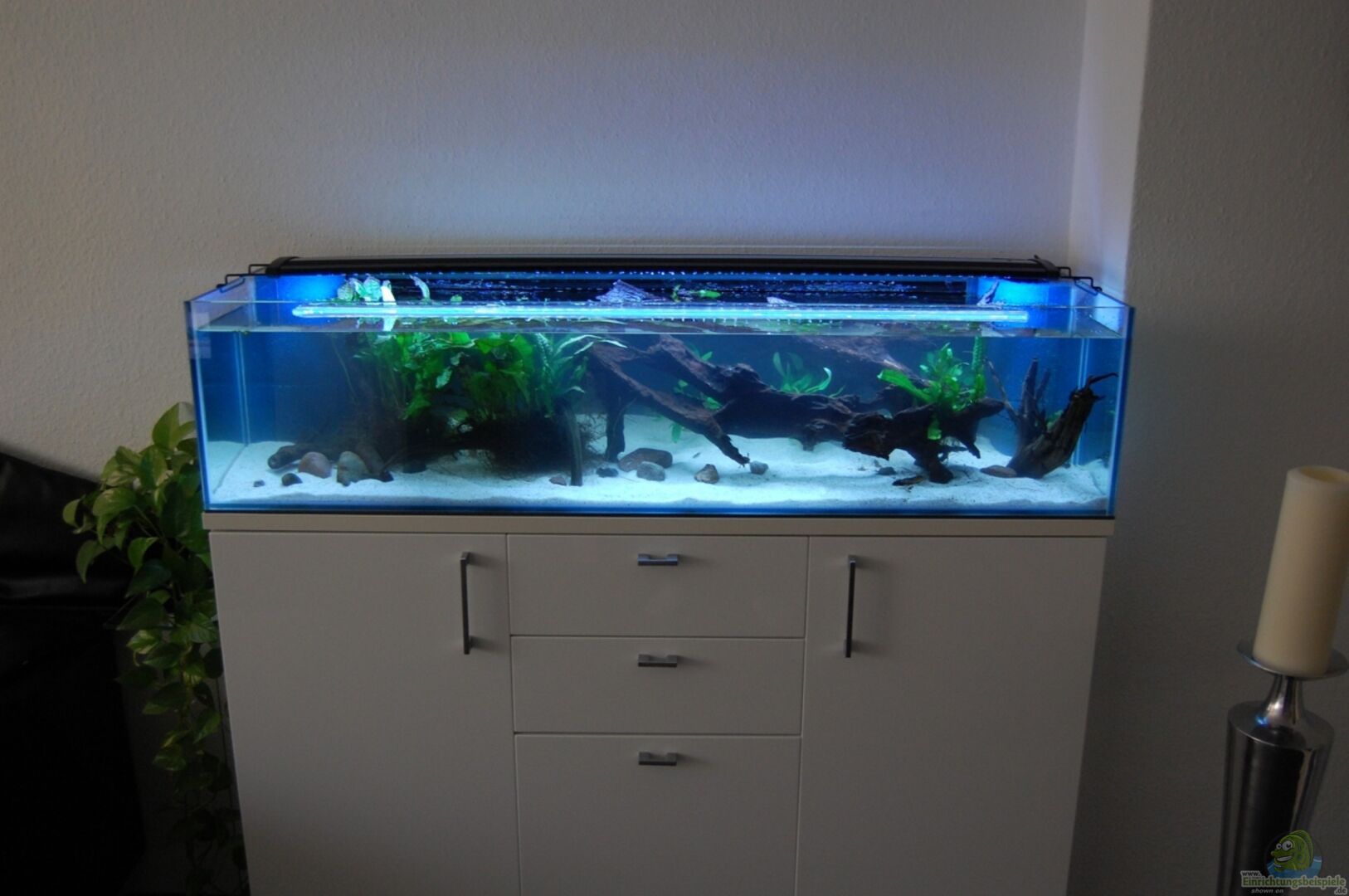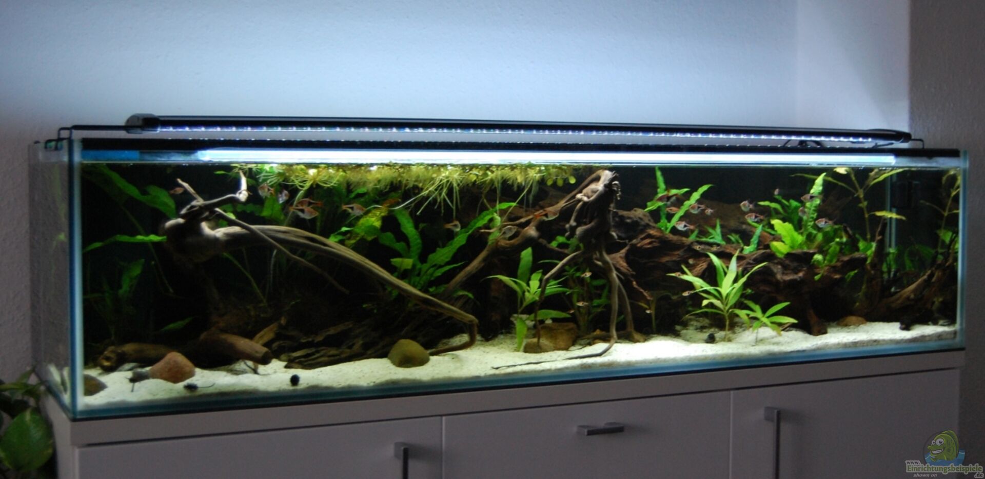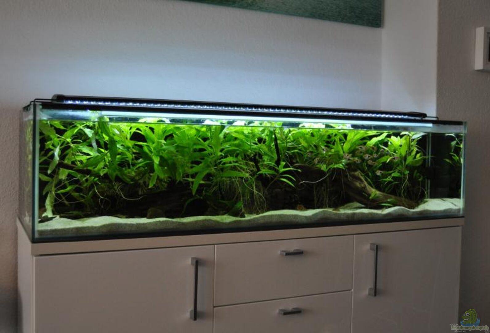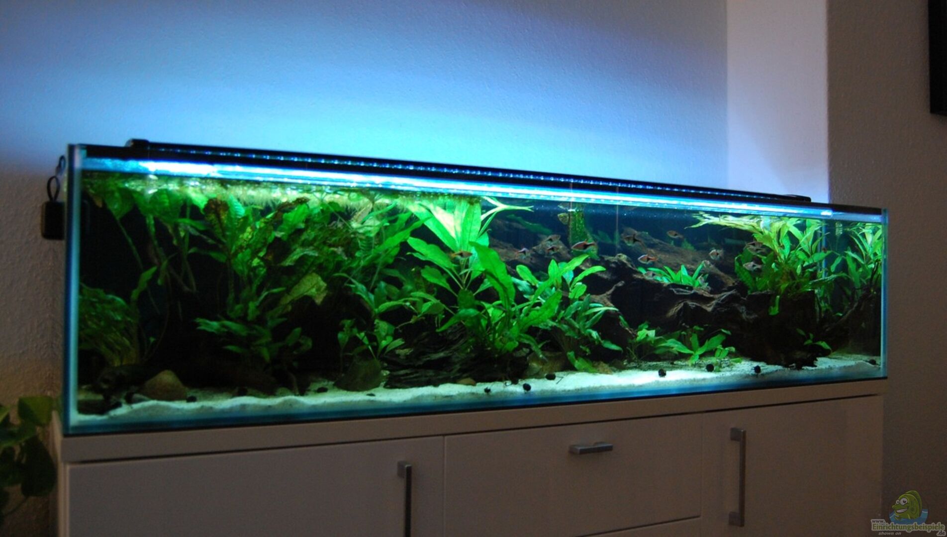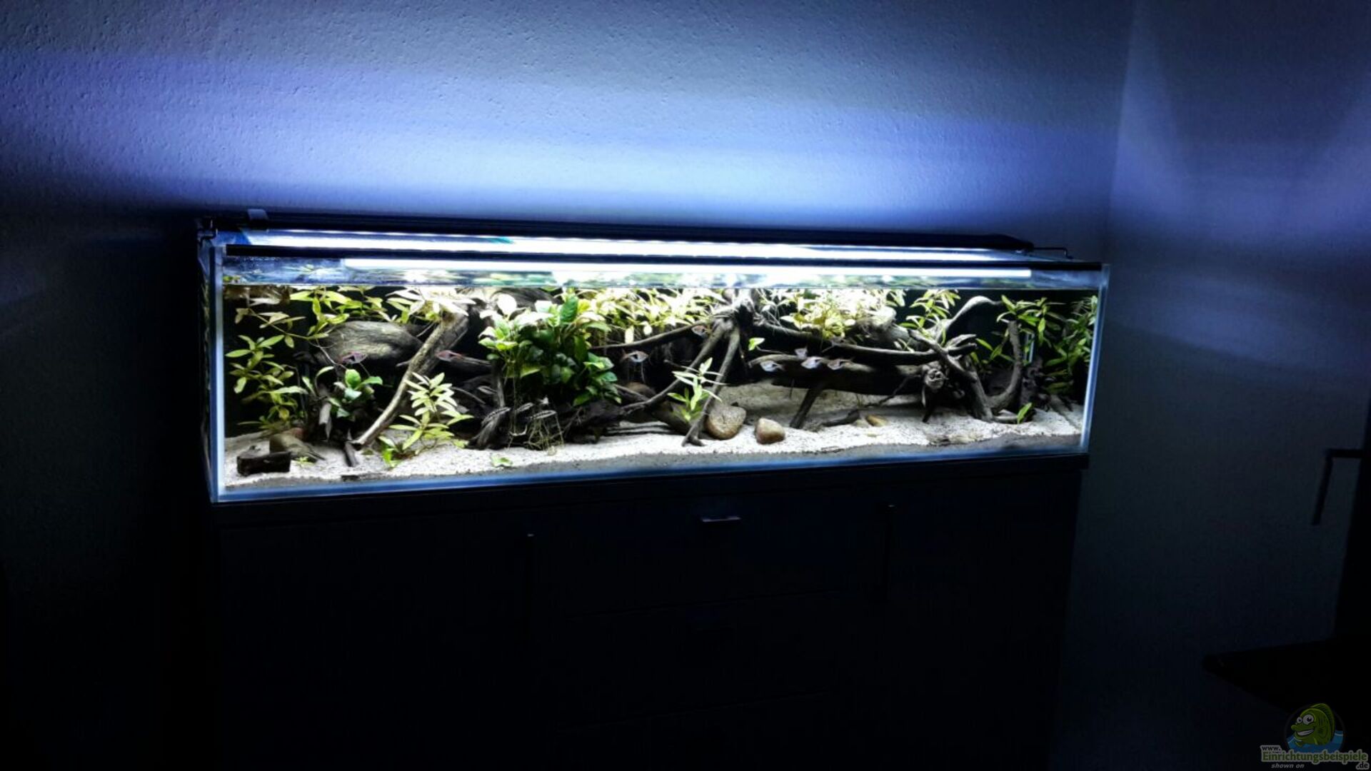 Wir sind umgezogen! Das Aquarium hat natürlich wieder einen Platz als Blickfang bekommen. Geändert hat sich wenig, Arbeit hat der Aquariumumzug dagegen reichlich gemacht. Neu kaufen musste ich mir eine Etime-LED-Leuchte, da meine bereits angeschlagene BeamsWork LED 800 den Umzug leider nicht überstanden hat.