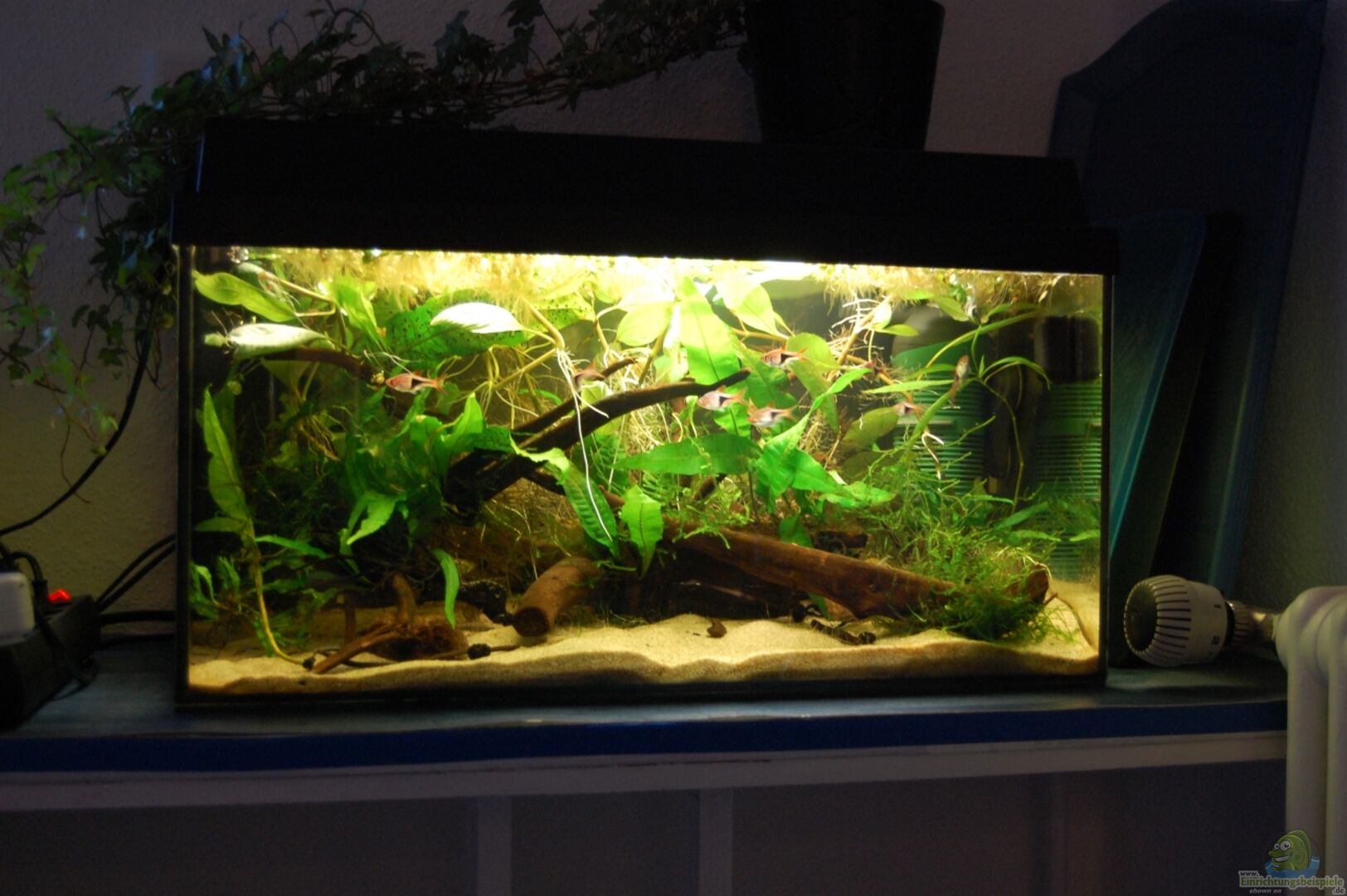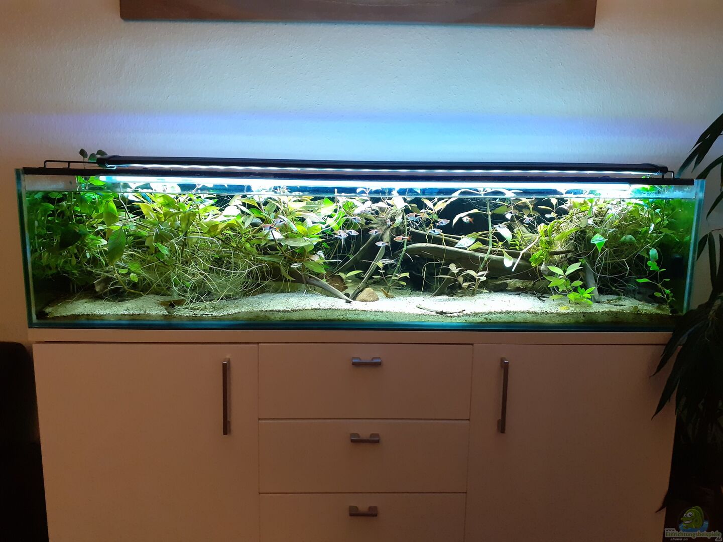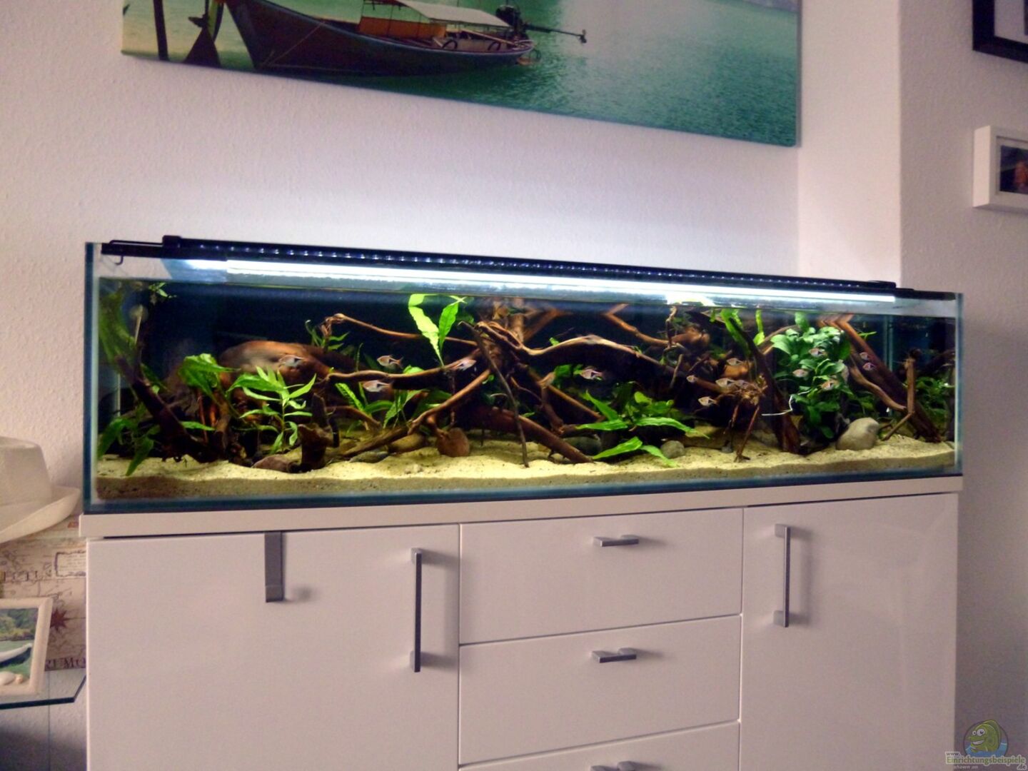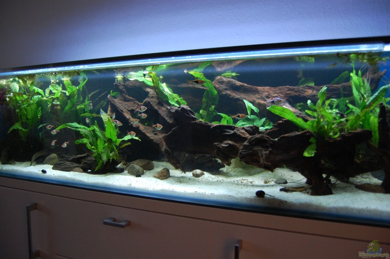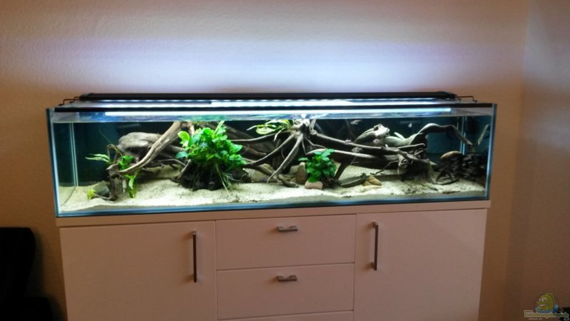 Wir sind umgezogen! Das Aquarium hat natürlich wieder einen Platz als Blickfang bekommen. Geändert hat sich wenig, Arbeit hat der Aquariumumzug dagegen reichlich gemacht. Neu kaufen musste ich mir eine Etime-LED-Leuchte, da meine bereits angeschlagene BeamsWork LED 800 den Umzug leider nicht überstanden hat.