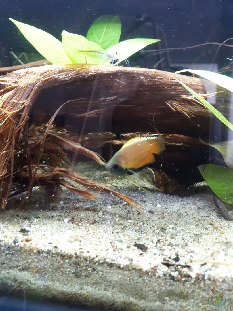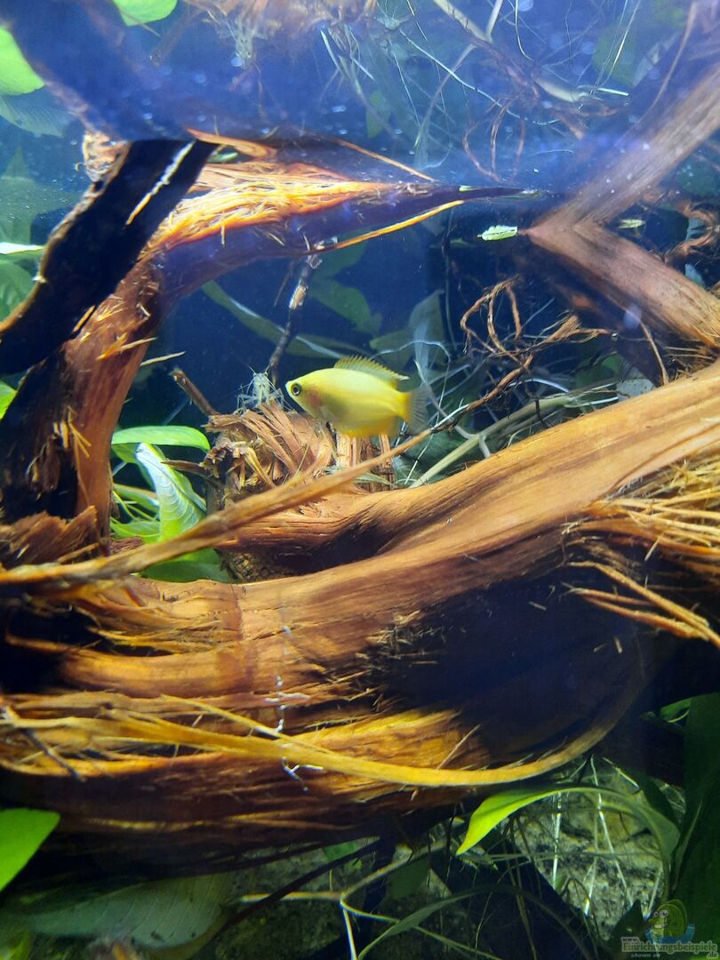 Leider ist der bisherige Besatz im Dezember, kurz vor Weihnachten, verendet. Ursache war eine neu eingesetzte Dragon Wood-Wurzel, die offensichtlich massiv Schadstoffe ins Wasser abgegeben hat. Sämtliche Schachbrettschmerlen und Keilfleckbärblinge haben die gro??e Umgestaltung nicht überlebt. Ich habe nach einiger ??berlegung einen Neustart mit Honigguramis gewagt. Die Tiere sind wunderschön und interessant zu beobachten.