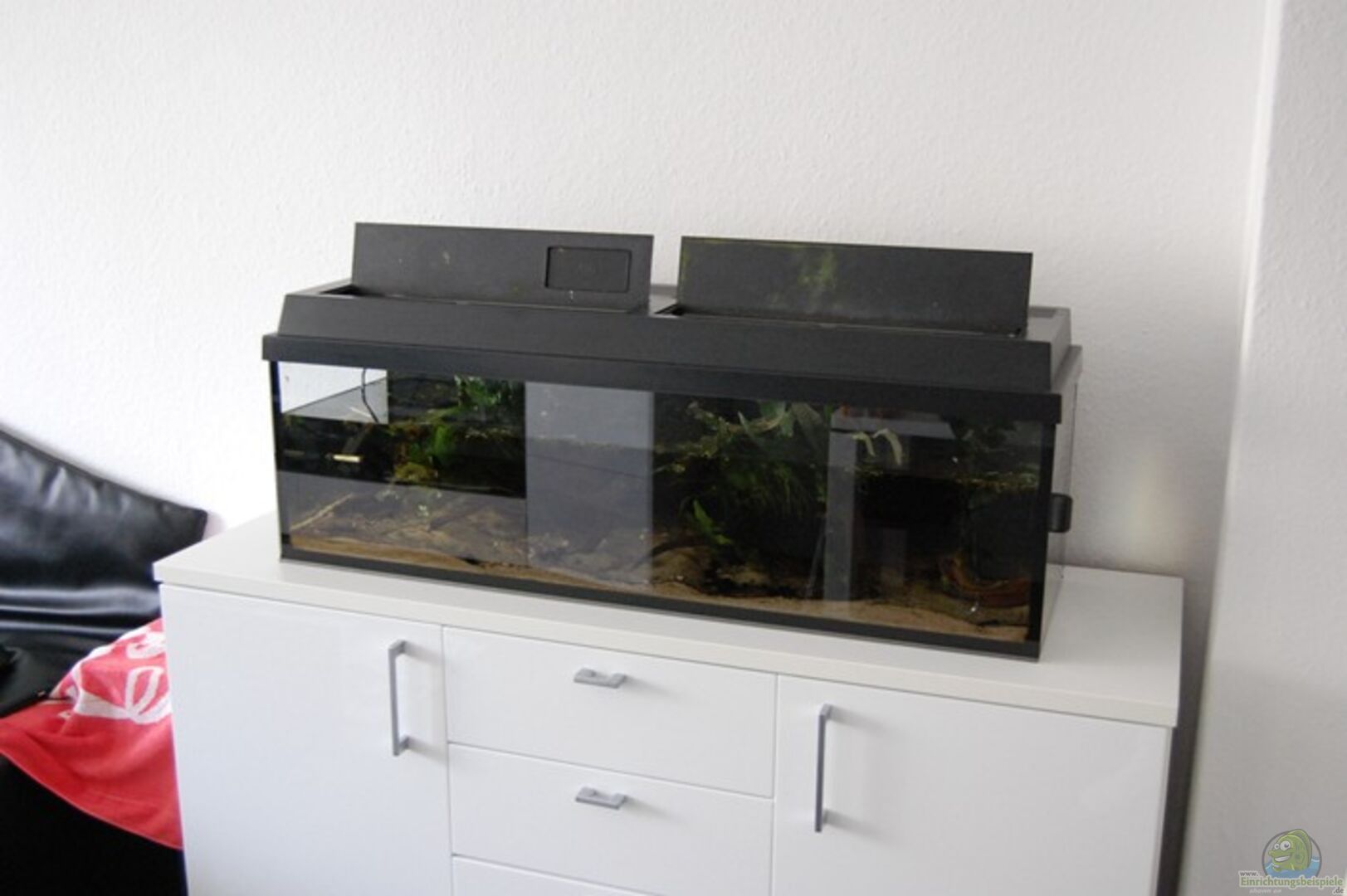 Wieder einmal handelt es sich bei dem Becken um eine Sonderanfertigung, die diesmal passend zum Sideboard gefertigt wurde. Hersteller ist die Firma Aquarienbau Voigt in Werneuchen bei Berlin. Das Becken wurde aus 8mm starkem Floatglas gefertigt und mit transparentem Silikon geklebt. Passgenau dazu habe ich mir eine dreiteilige Glasabdeckung von der Fa. Voigt anfertigen lassen, welche in zwei Kunststoff-E-Profilen auf der gesamten Beckenlänge verschiebbar ist. Als zusätzlichen Service wurden mir ab Werk vier Glasstege für den Hamburger Mattenfilter nach meinen Vorgaben in die Ecken geklebt. Als Rundum-Sorglos-Paket kostete das Becken mich gerade einmal 75 EUR.