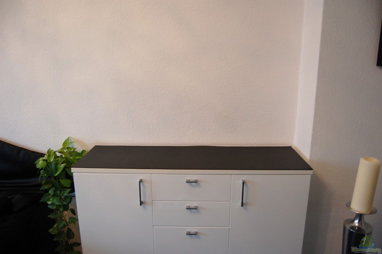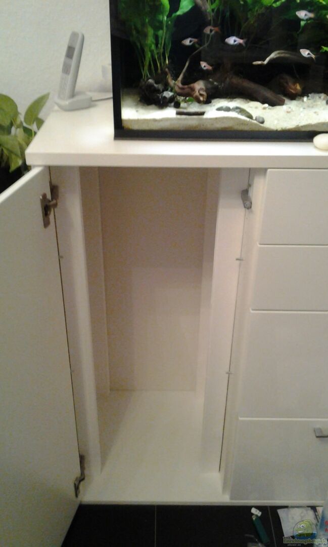 Beim Unterschrank wurde ein hochglanzwei??es Sideboard von Möbel Kraft (Neupreis 255, - EUR) zweckentfremdet. Ausgesucht habe ich den Schrank beim Umzug vor allem nach den Gesichtspunkten der Belastbarkeit, da mein 90 Liter-Becken darauf Platz nehmen sollte. Der Schrank hat 4 cm breite Mittel- und ca. 2, 5 cm breite Seitenwände. Für das 156 Liter-Becken wurde der Schrank wegen des deutlich höheren Gesamtgewichts noch leicht umgestaltet: Die Regalböden wurden als zusätzliche Stütze übereinander senkrecht hinten in den Schrank gestellt, da die Rückwand leider nur aus besserer Pappe besteht. Zudem wurden 8 Kanthölzer in den Schrank als zusätzliche Stützen integriert.