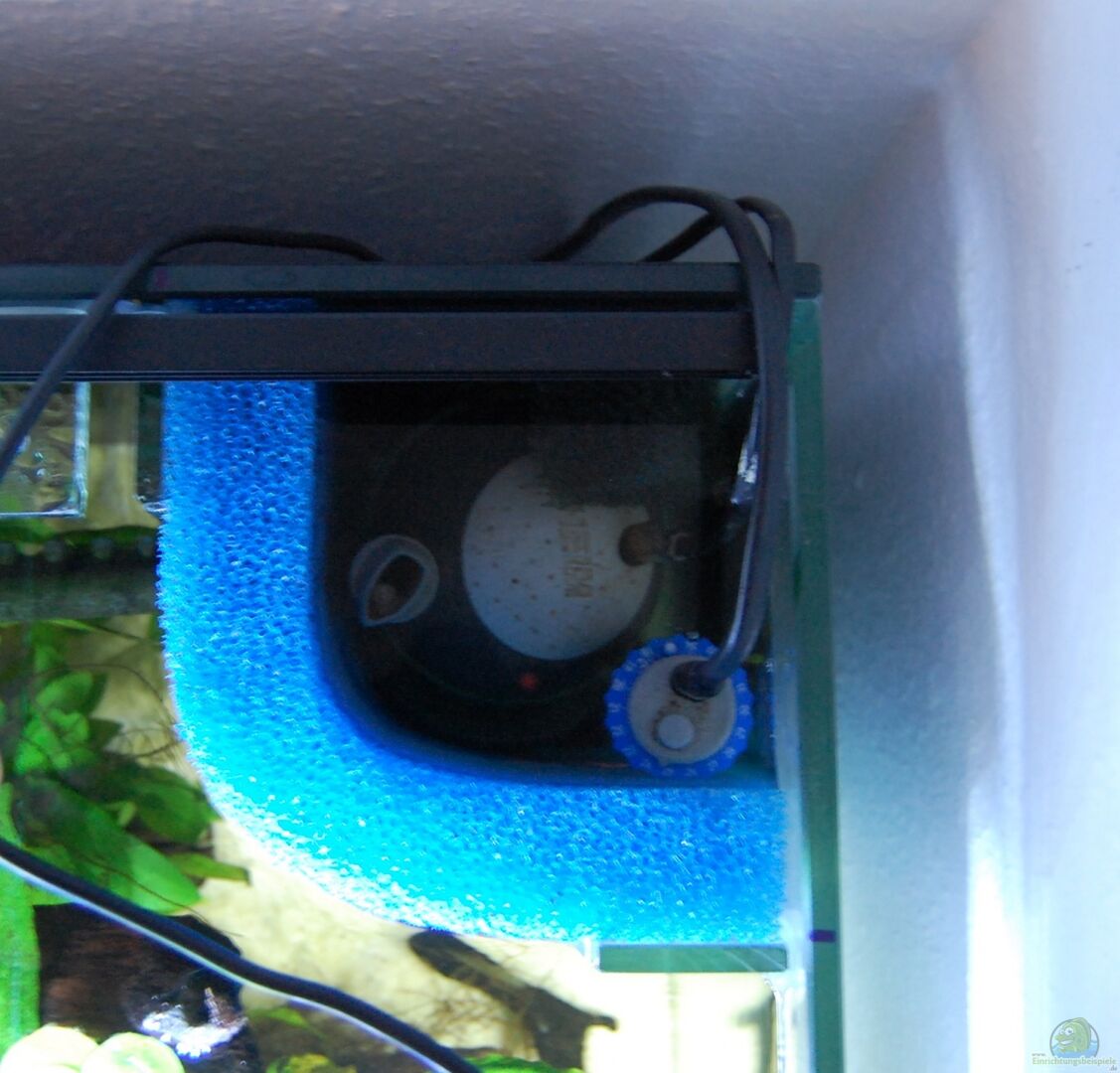 Filterung erfolgt über zwei Eck-HMF, Mattengrö??e jeweils 20, 5 x 29, 5cm, betrieben durch eine Minizimmerbrunnenpumpe (links) und einen Aquaball 130 (rechts). Beide Pumpen sind auf niedrige Leistung gedrosselt.