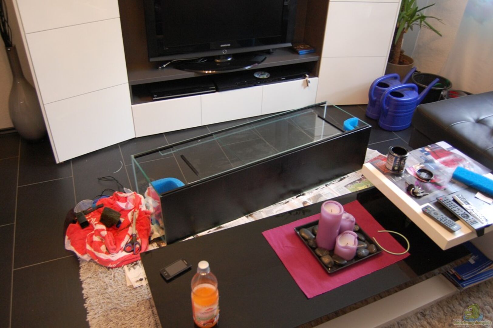 - Becken abgeholt, Rückwand lackiert, HMF zugeschnitten, Becken befüllt und provisorisch eingerichtet, eingelaufene Filter aus Vorgänger-Becken wurden in Betrieb genommen