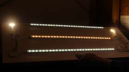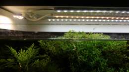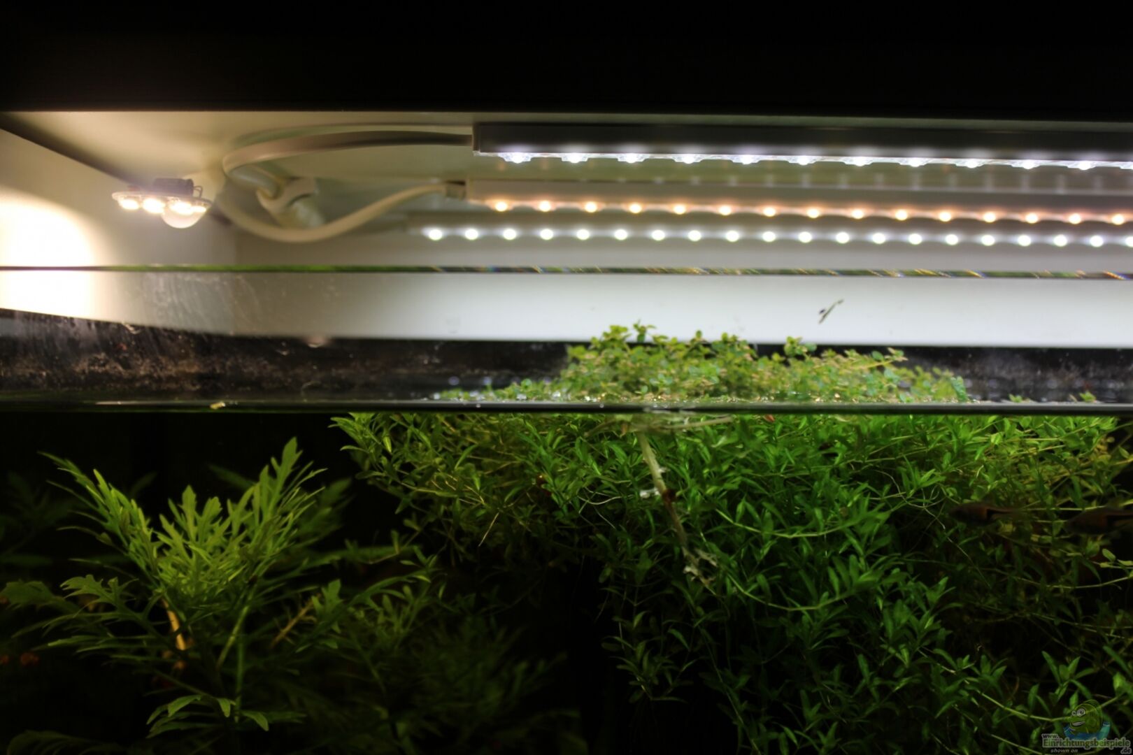 Für die Abdeckung haben wir einen mit PVC-Platten beklebten Holzrahmen auf die Hintere und die seitliches Glasplatten gesetzt. Als tatsächliche Abdeckung dient ein Regalbrett, an dessen unterseite ebenfalls PVC geklebt ist, worauf wir dann die LEDs festgeschraubt haben. Es sitzt so im Regal, dass zwischen dem Rahmen und dem Brett nur wenige Millimeter Abstand bleiben. Um WW und andere Arbeiten auszuführen, hänge ich das Regalbrett über dem Becken einfach 30cm höher ein.