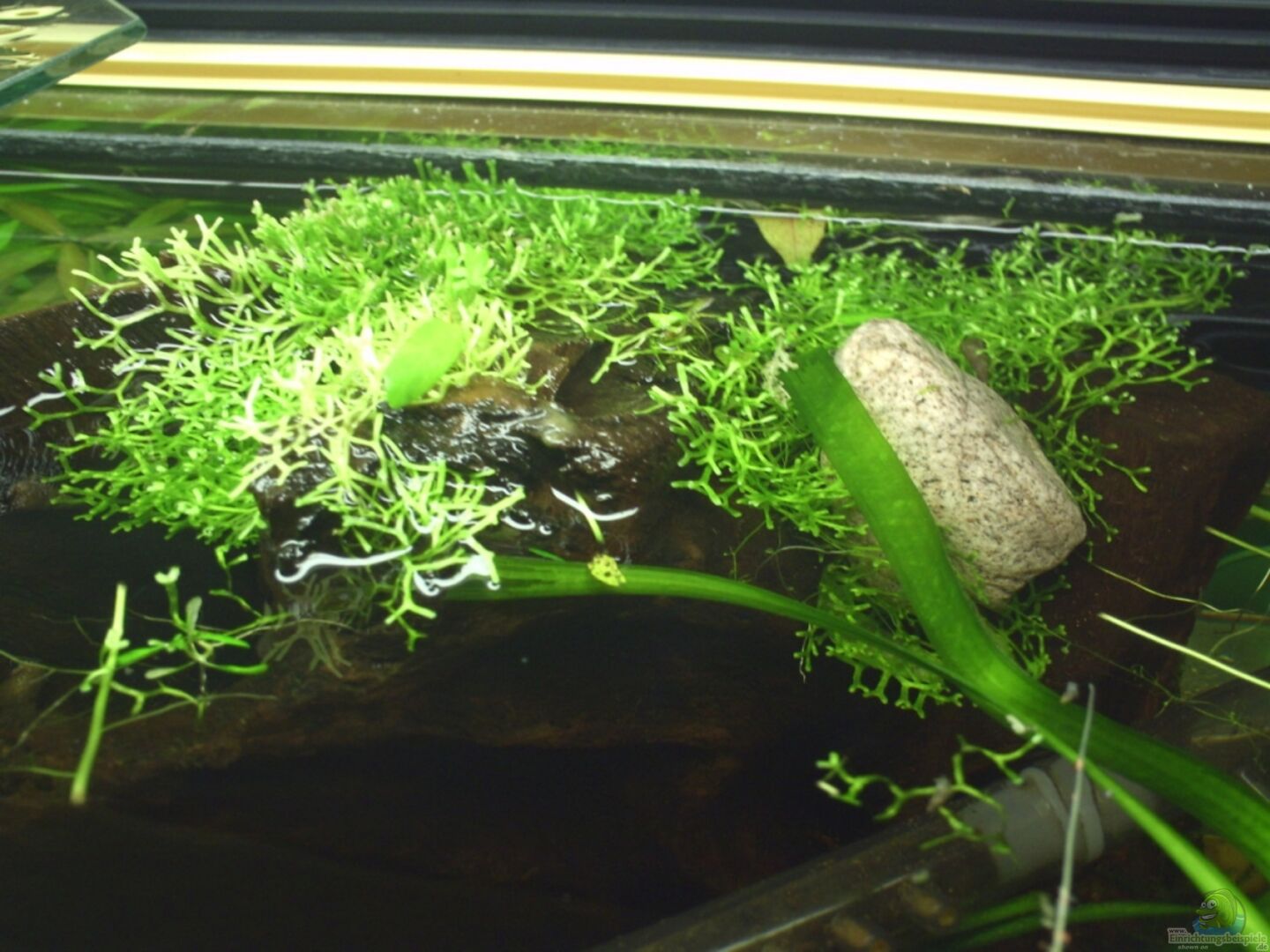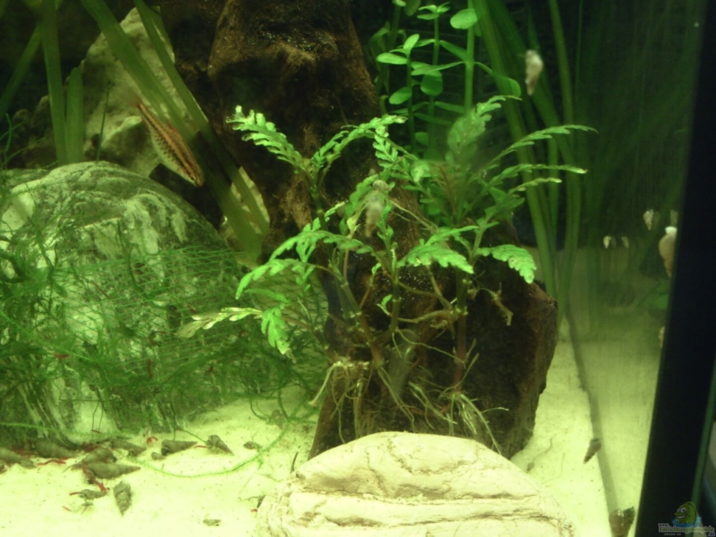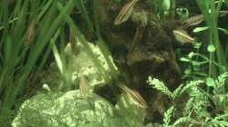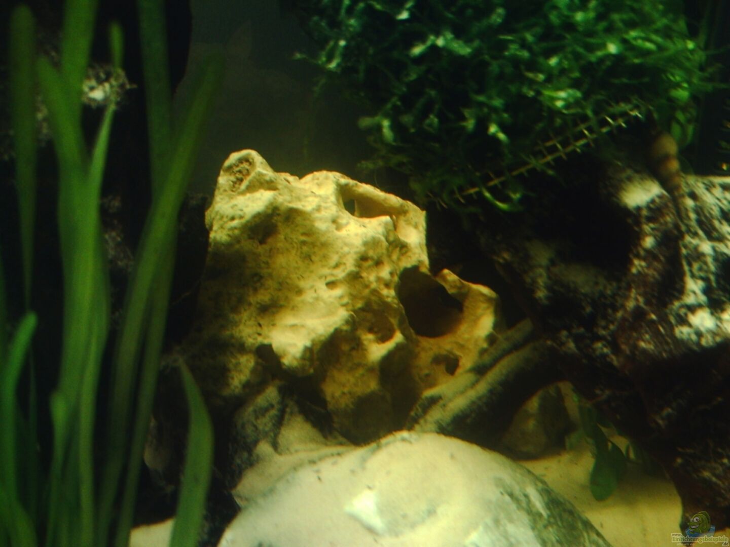 - Ca. 5-8 kg Steine, welche Links im Becken in mehreren Schichten gestapelt sind, um so Höhlen für die geplanten Dornaugen zu bilden, und noch weitere, teilweise zur Stabilisierung der Wurzel, sind im Becken verteilt.