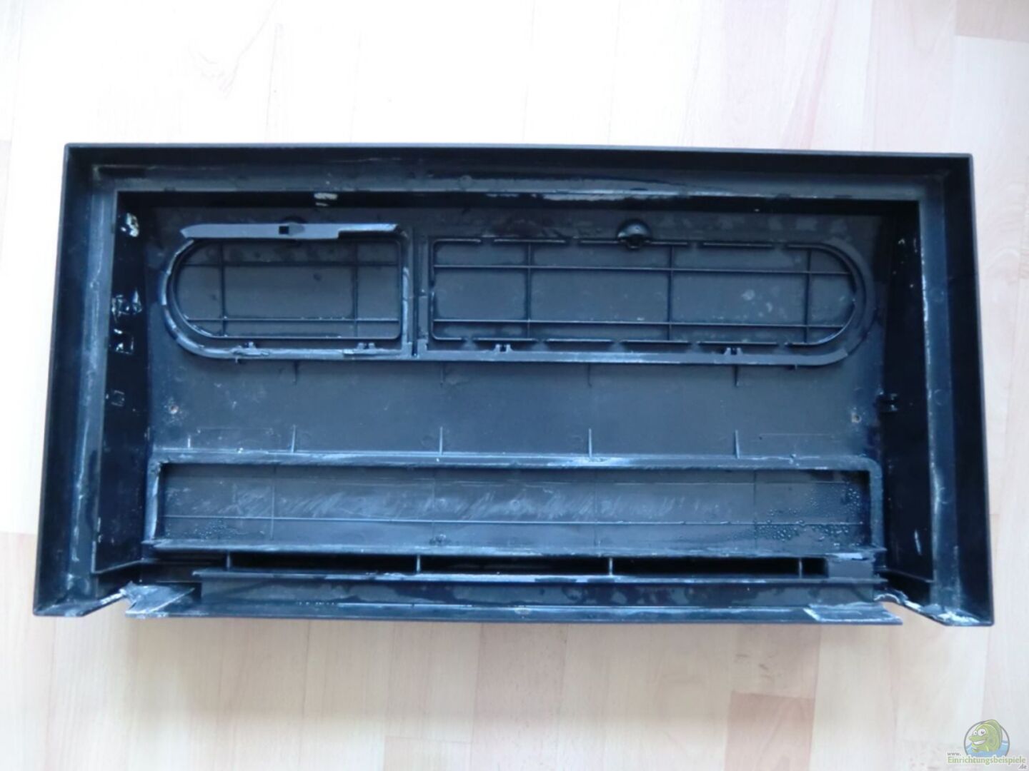 Unten ist noch eine Blende montiert, so das bei einem herrausnehmen der Filtermatte kein Sand in die Technikecke fällt.