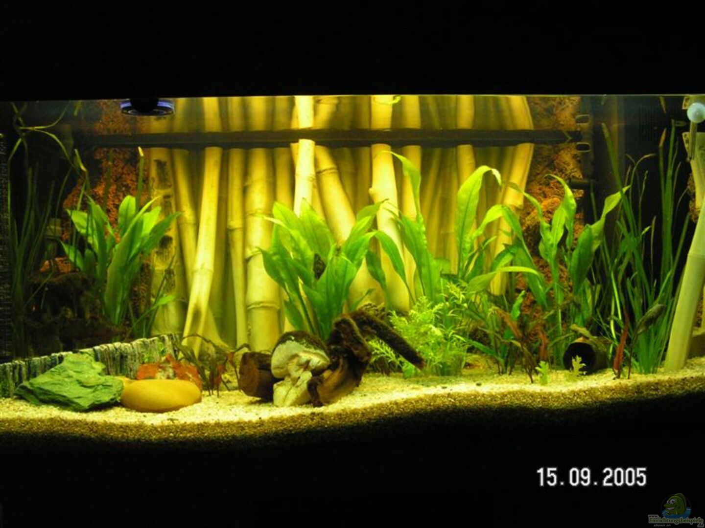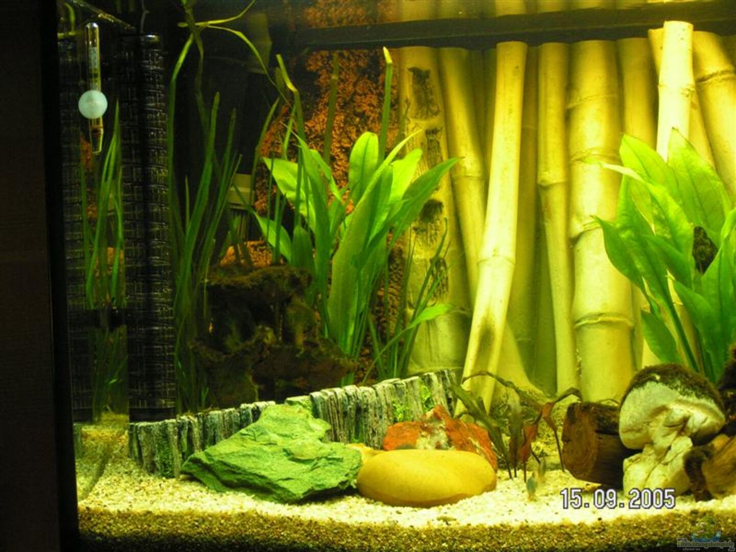 3D-Rückwand Bambusstangen mit etwas Fels, die Fische können zwischen und hinter den Bambusstangen schwimmen