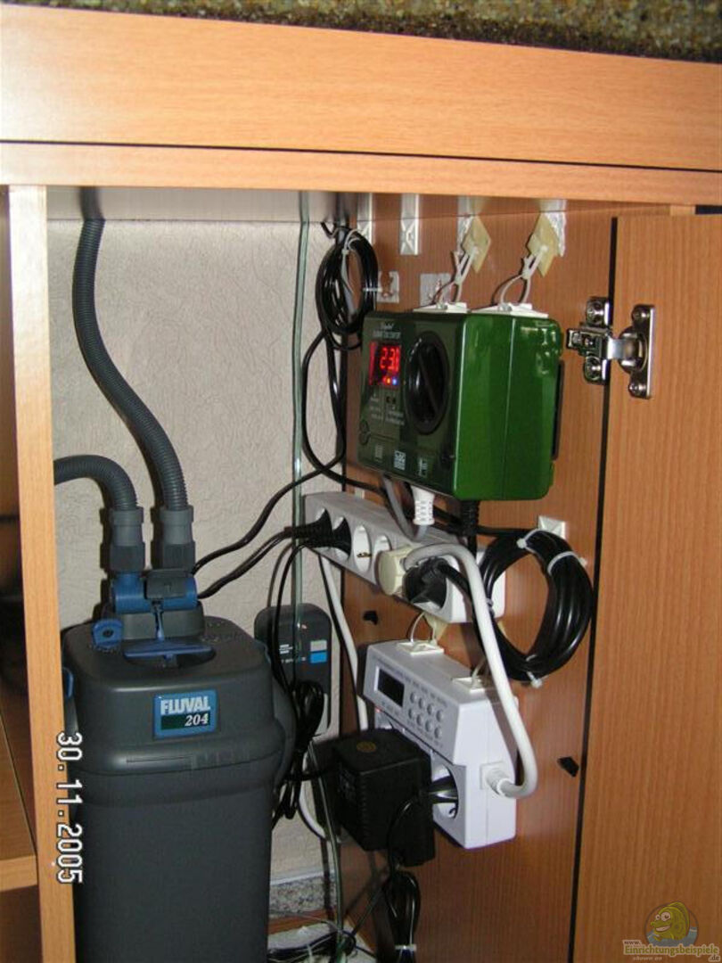 300w Stabheizer von Juwel, Bodenfluter und Stabheizer werden mi Dennerle Duomat 1200 Comfort gesteuert, 23gradC Tagtemperatu mit Nachtabsenkung -1, 5gradC und Sommerschaltung für den Bodenfluter