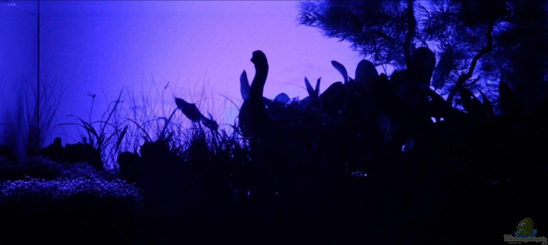 Besonderheit ist die um 3cm agbesetzte Aquariumrückwand, die eine Hintergrundbeleuchtung und somit verschiedene Sonnenuntergangs bzw. -aufgangsszenarien ermöglicht.
