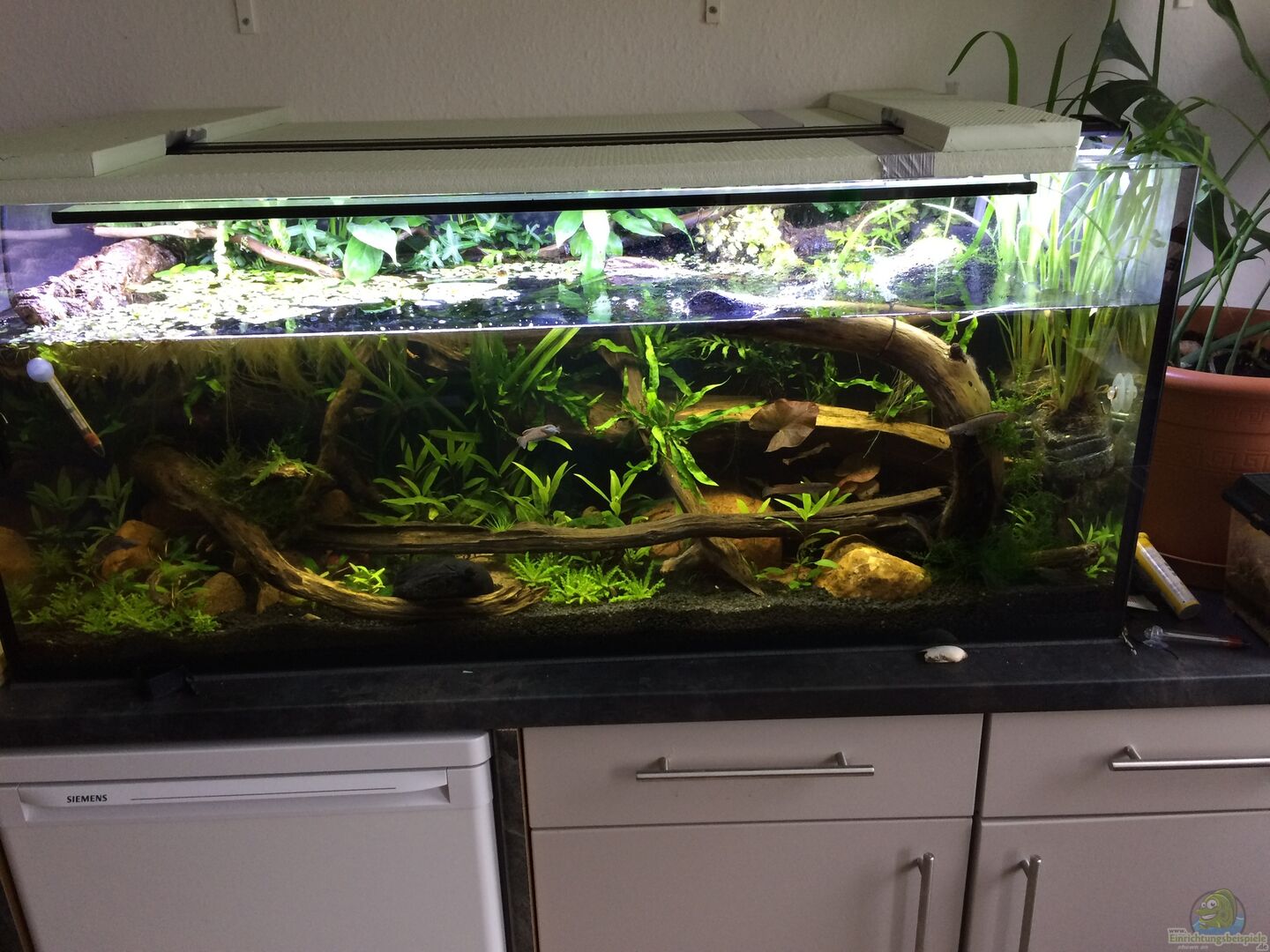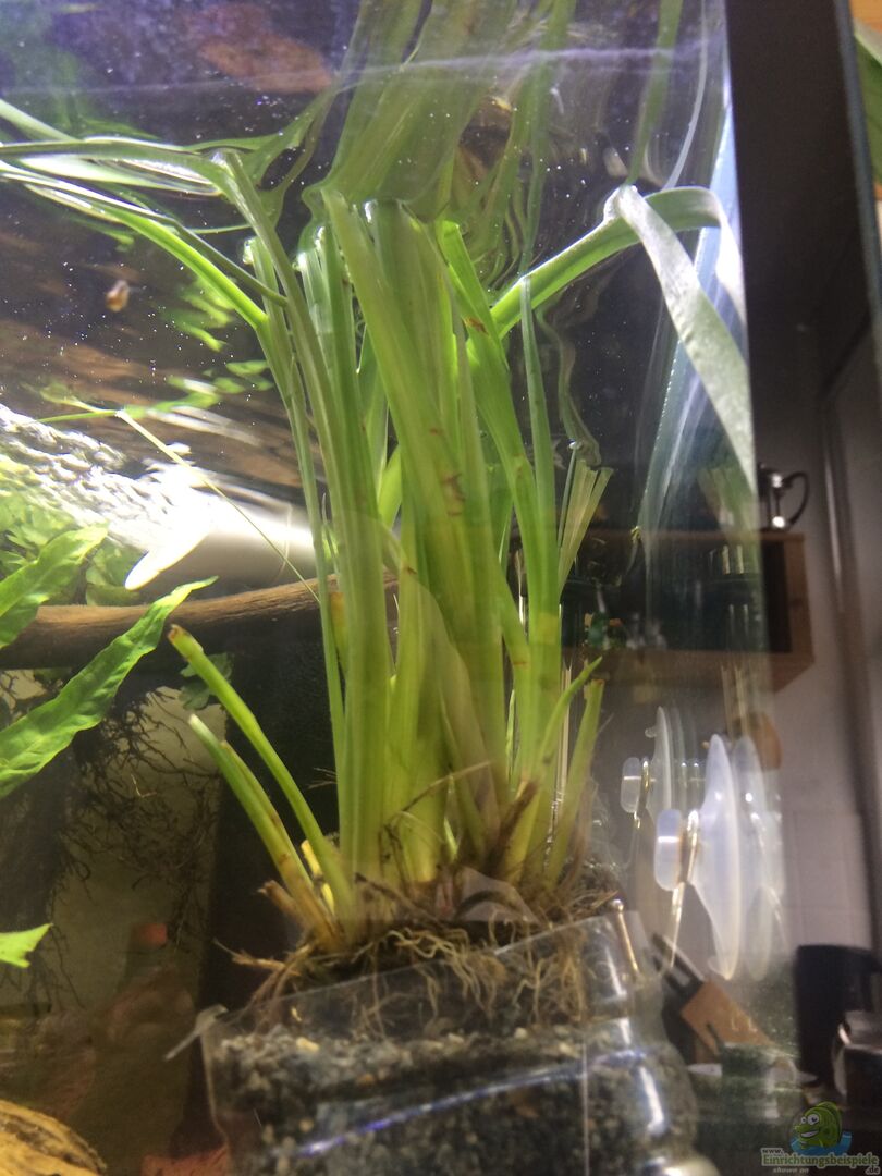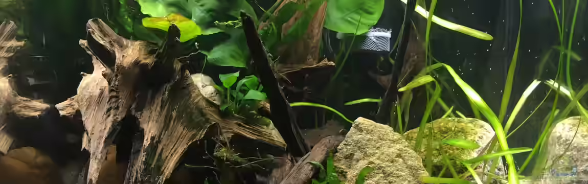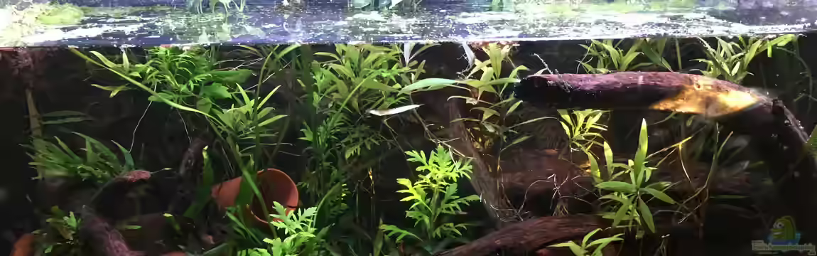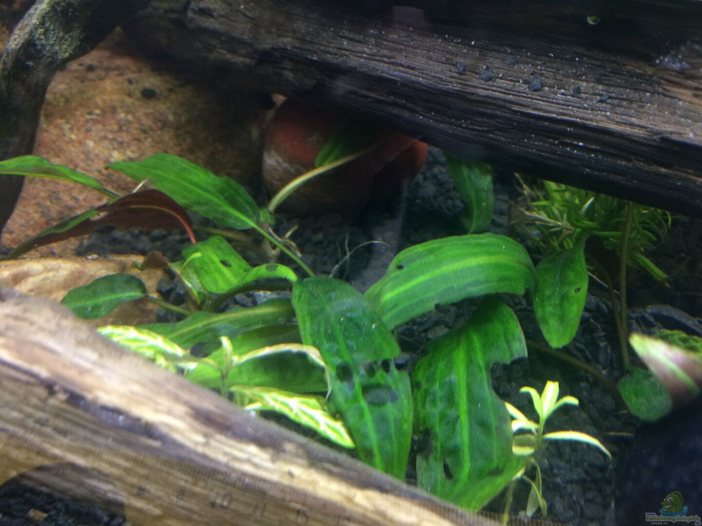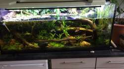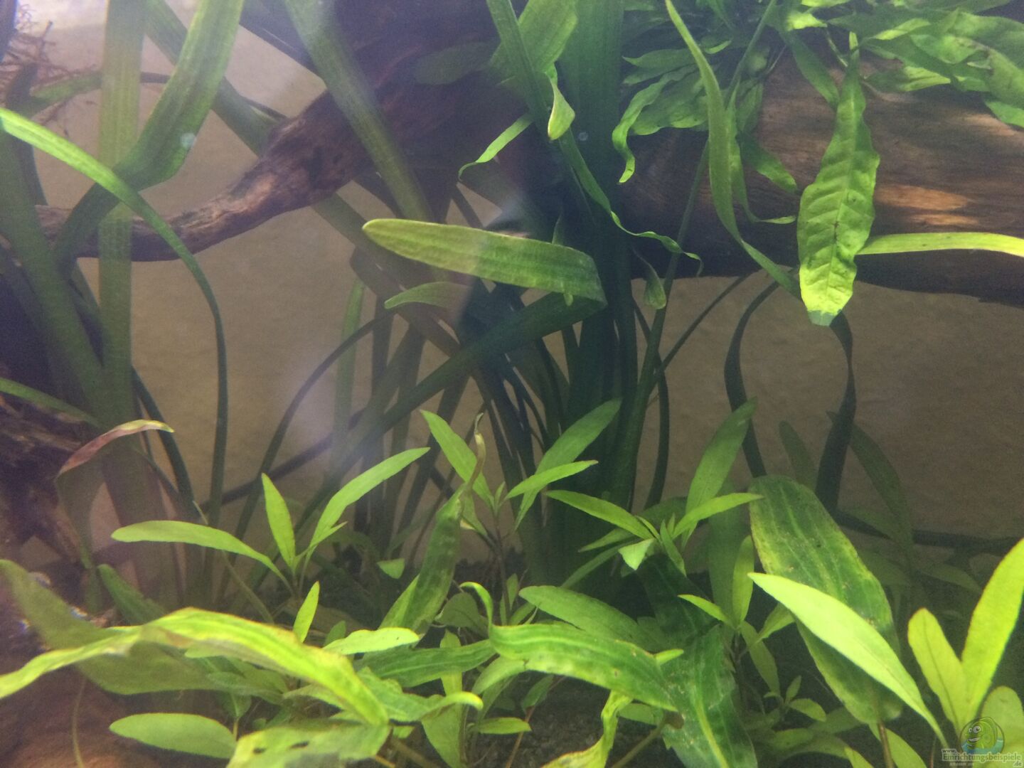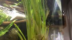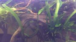 Ich hab ja lang nichts geschrieben und daher hat sich das Becken auch sehr verändert. Die Sagittaria hat sich in dem Becken nicht gut gemacht und ich habe sie durch Vallisnerien (Vallisneria spiralis???) ersetzt, die wesentlich besser klar kommen und mir persönlich auch besser gefallen. Der Boden ist flächendeckend von Cryptocoryne affinis erobert worden. Die bilden, im Gegensatz zu meinen anderen Becken, hier eine Art dichten, niedrigen Rasen. Ansonsten läuft das Becken sehr gut, nur habe ich ??rger mit schwarzen Cyanobakterien an den Hölzern. Hier bin ich noch am herumdoktern und hoffe es irgendwie noch zu schaffen. Die Absaugerei nervt.