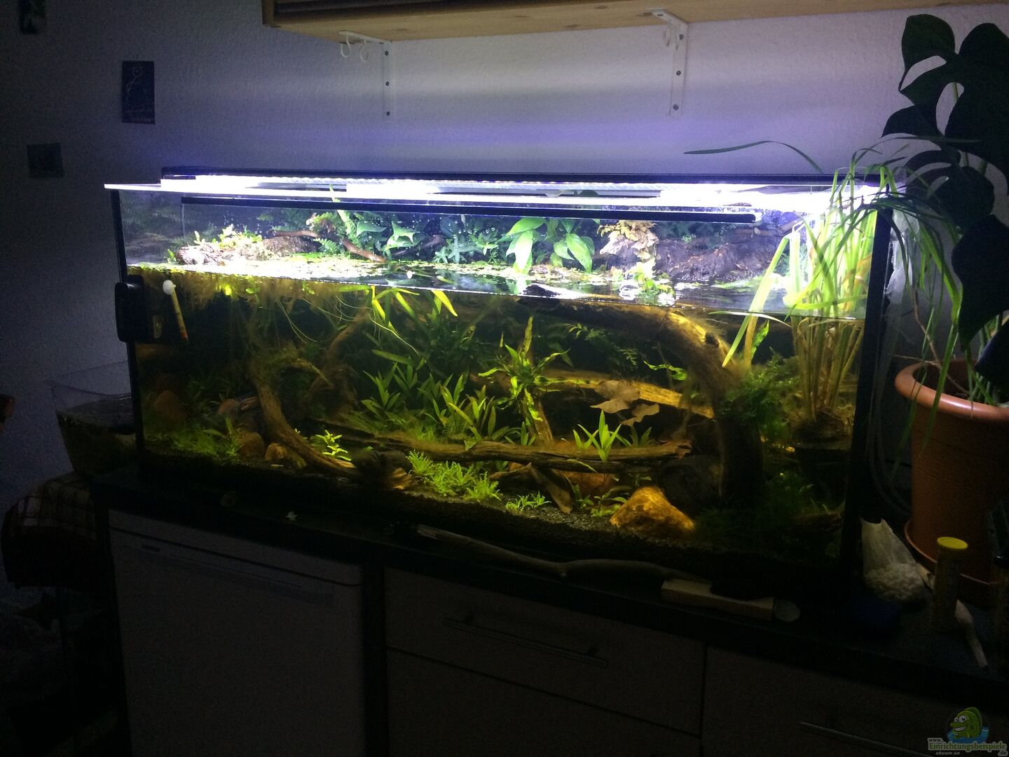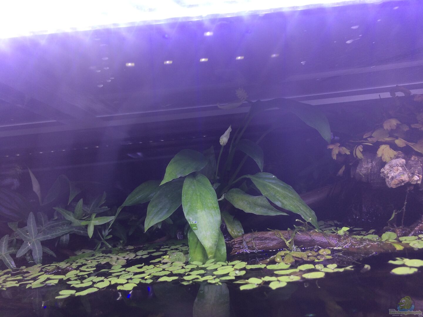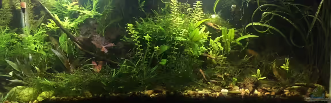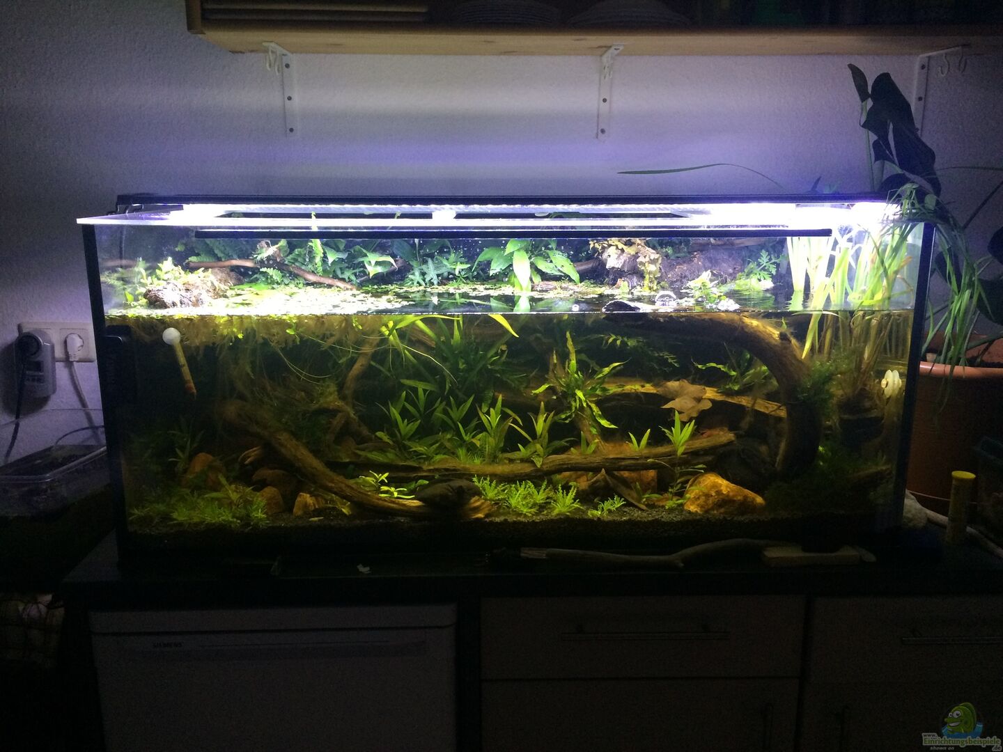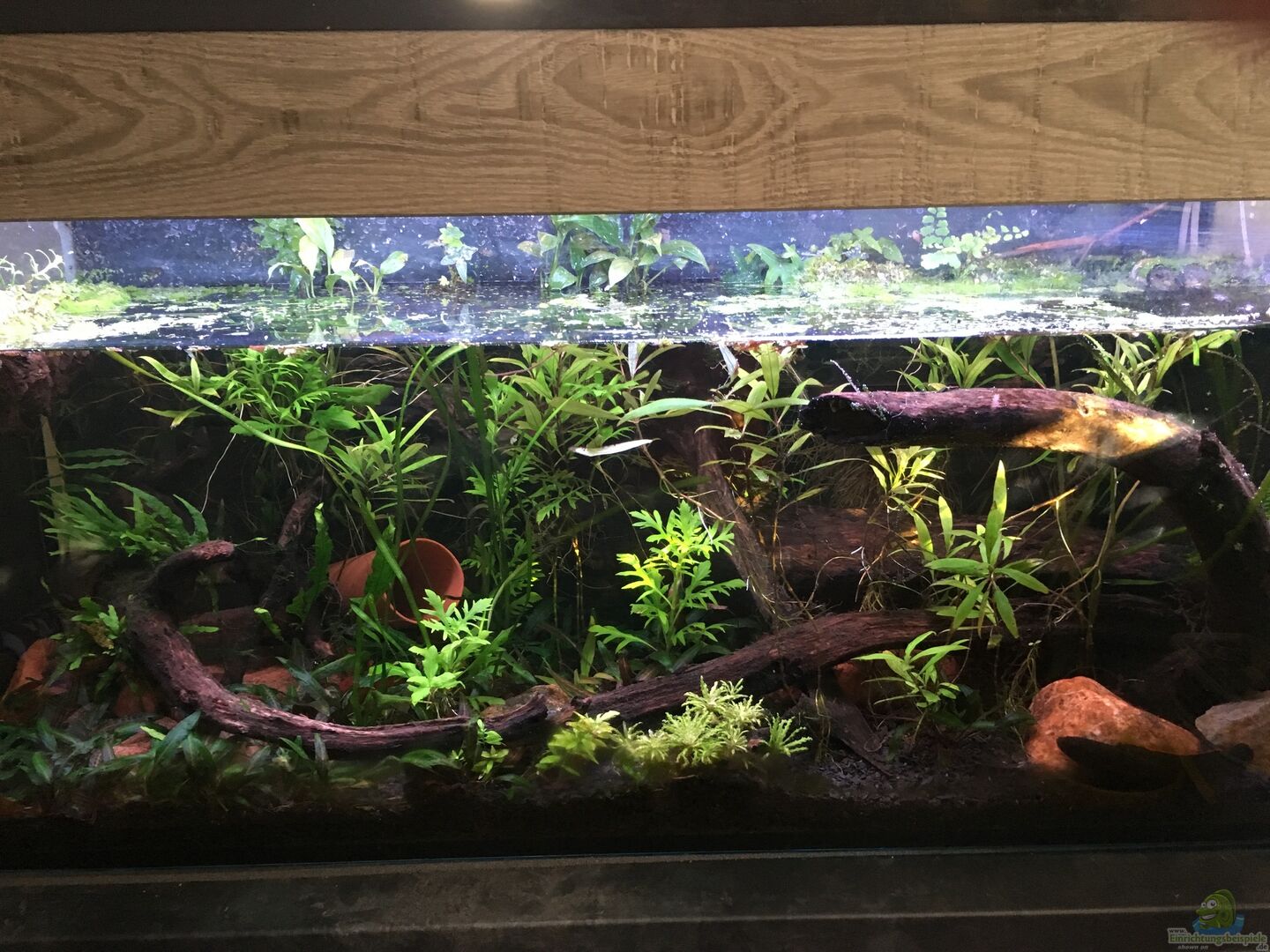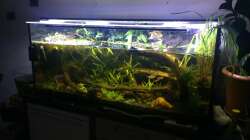 Ich hab ja lang nichts geschrieben und daher hat sich das Becken auch sehr verändert. Die Sagittaria hat sich in dem Becken nicht gut gemacht und ich habe sie durch Vallisnerien (Vallisneria spiralis???) ersetzt, die wesentlich besser klar kommen und mir persönlich auch besser gefallen. Der Boden ist flächendeckend von Cryptocoryne affinis erobert worden. Die bilden, im Gegensatz zu meinen anderen Becken, hier eine Art dichten, niedrigen Rasen. Ansonsten läuft das Becken sehr gut, nur habe ich ??rger mit schwarzen Cyanobakterien an den Hölzern. Hier bin ich noch am herumdoktern und hoffe es irgendwie noch zu schaffen. Die Absaugerei nervt.