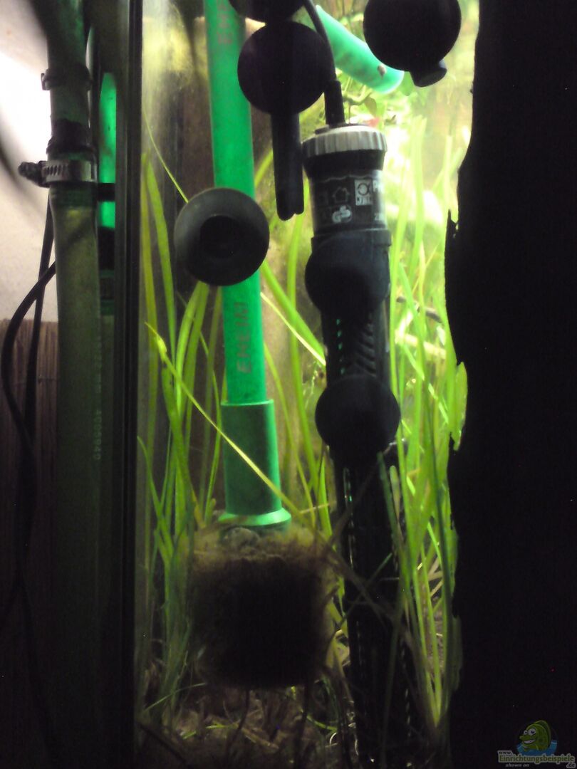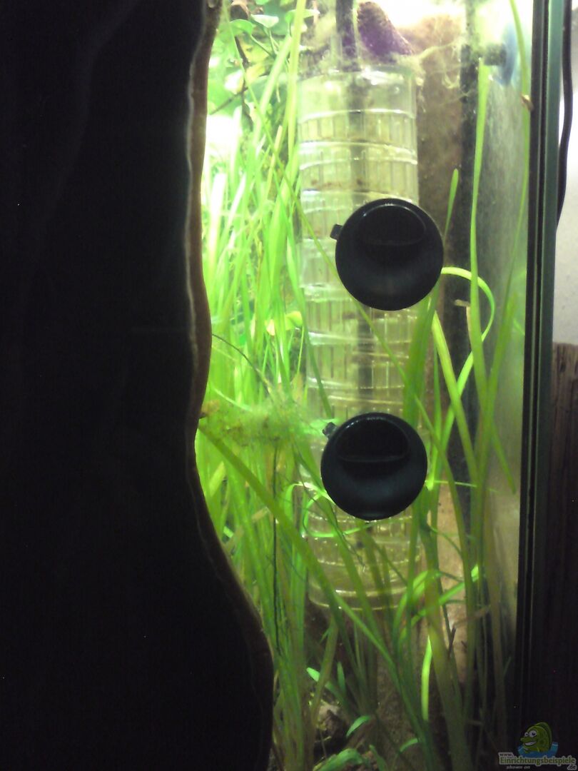 Ein auf ca. 1/3 der Leistung gedrosselten Eheim professionel 2 2026 Au??enfilter. Ansaugschlitze unten mit Filterpatrone "garnelensicher" gemacht. Dieses gewährleistet auch noch eine optimale Vorfilterung. Filterfläche wird in Zukunft noch erweitert.