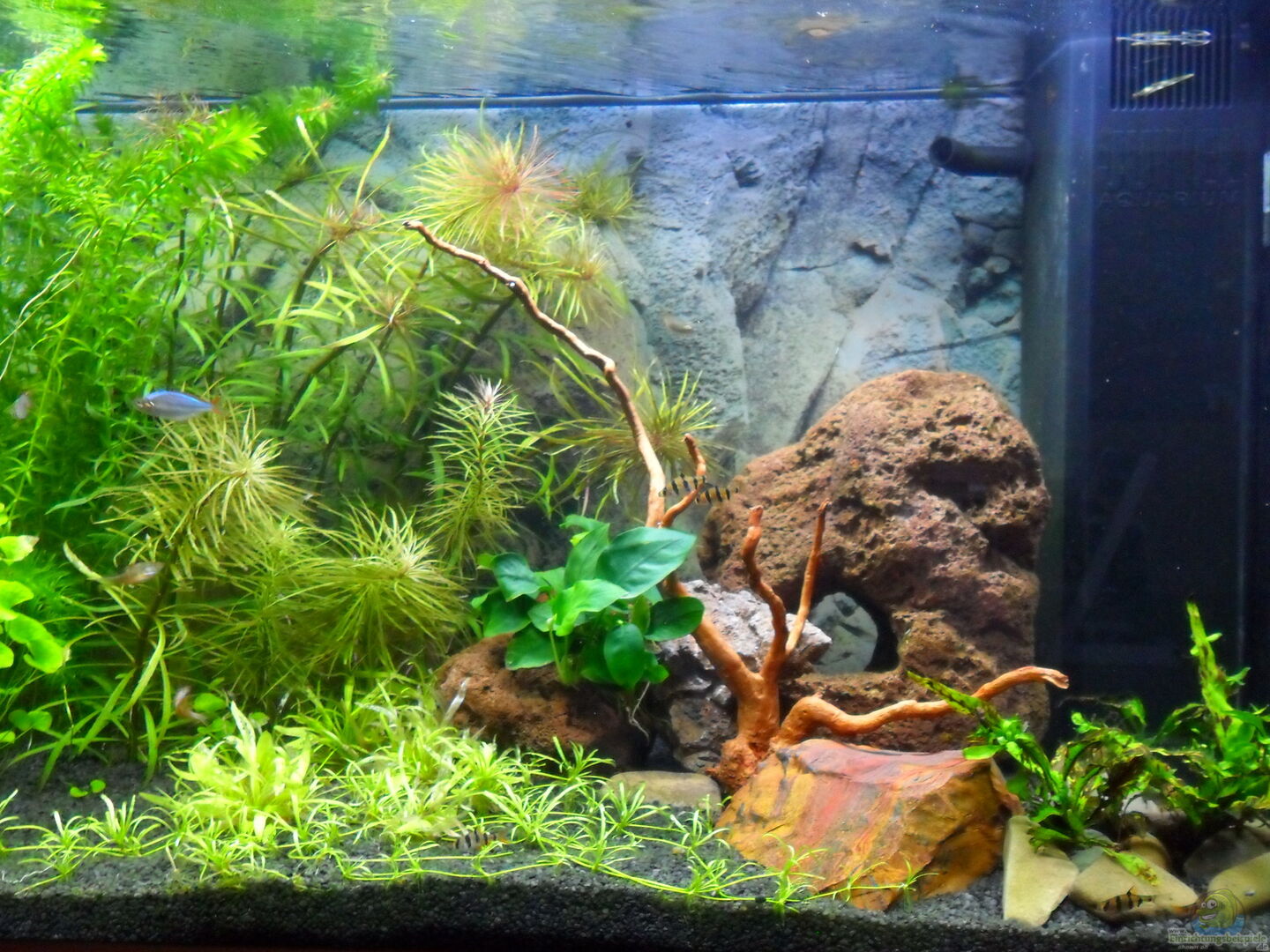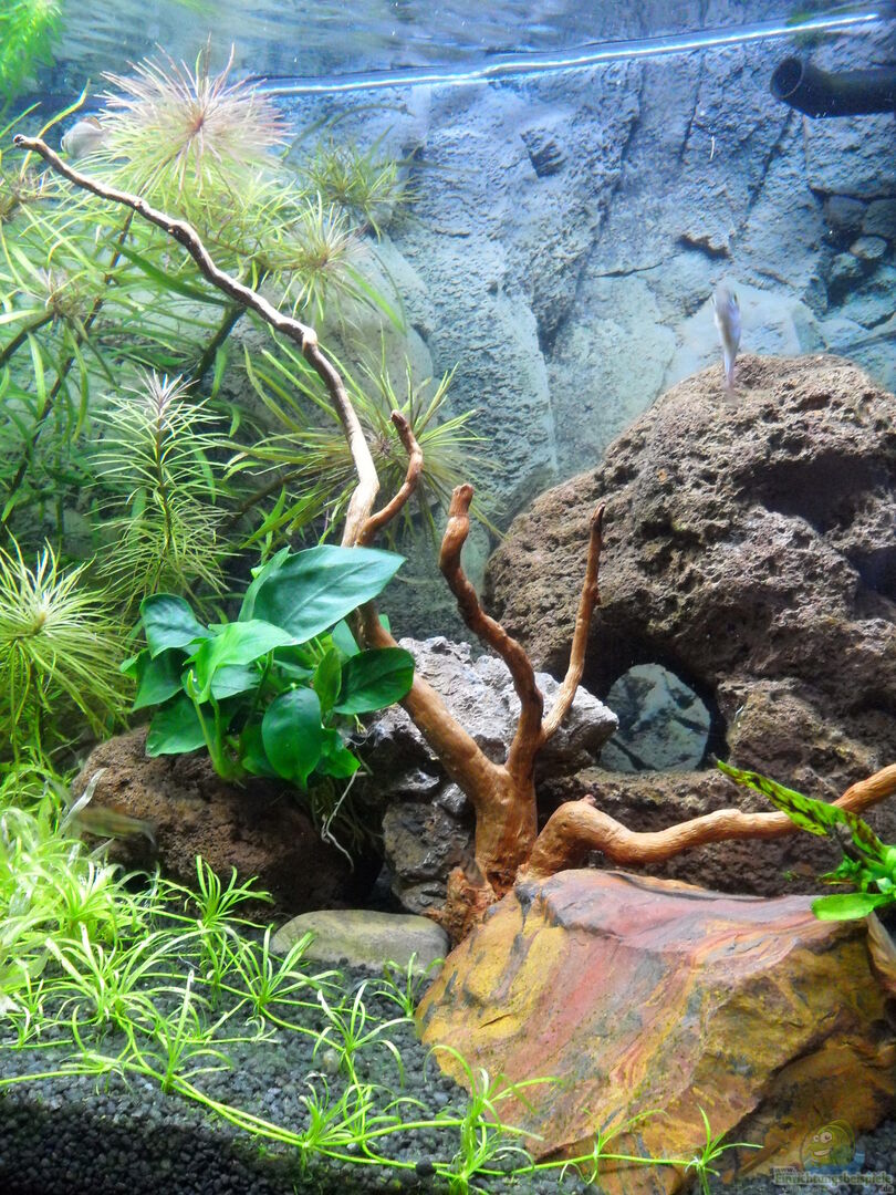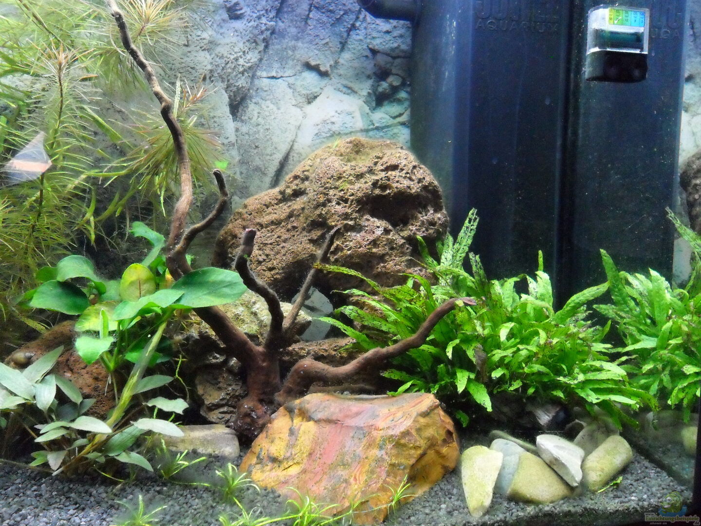 Bei der Einrichtung wird sich von selbst noch einiges ändern, sobald die Pflanzen besser gewachsen sind. Vielleicht könntest du noch mehr Wurzeln einbringen oder die Steine anders anordnen, so dass mehr Struktur, also unterschiedliche Beckenbereiche mit Sichtbarrieren, entsteht. Die Steine sehen im Moment auch noch recht unnatürlich angeordnet aus. Da darfst du noch experimentieren und schaun, wie es am besten funktioniert.
