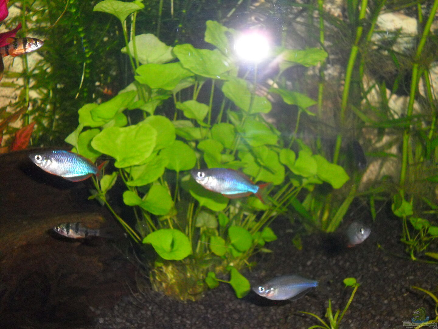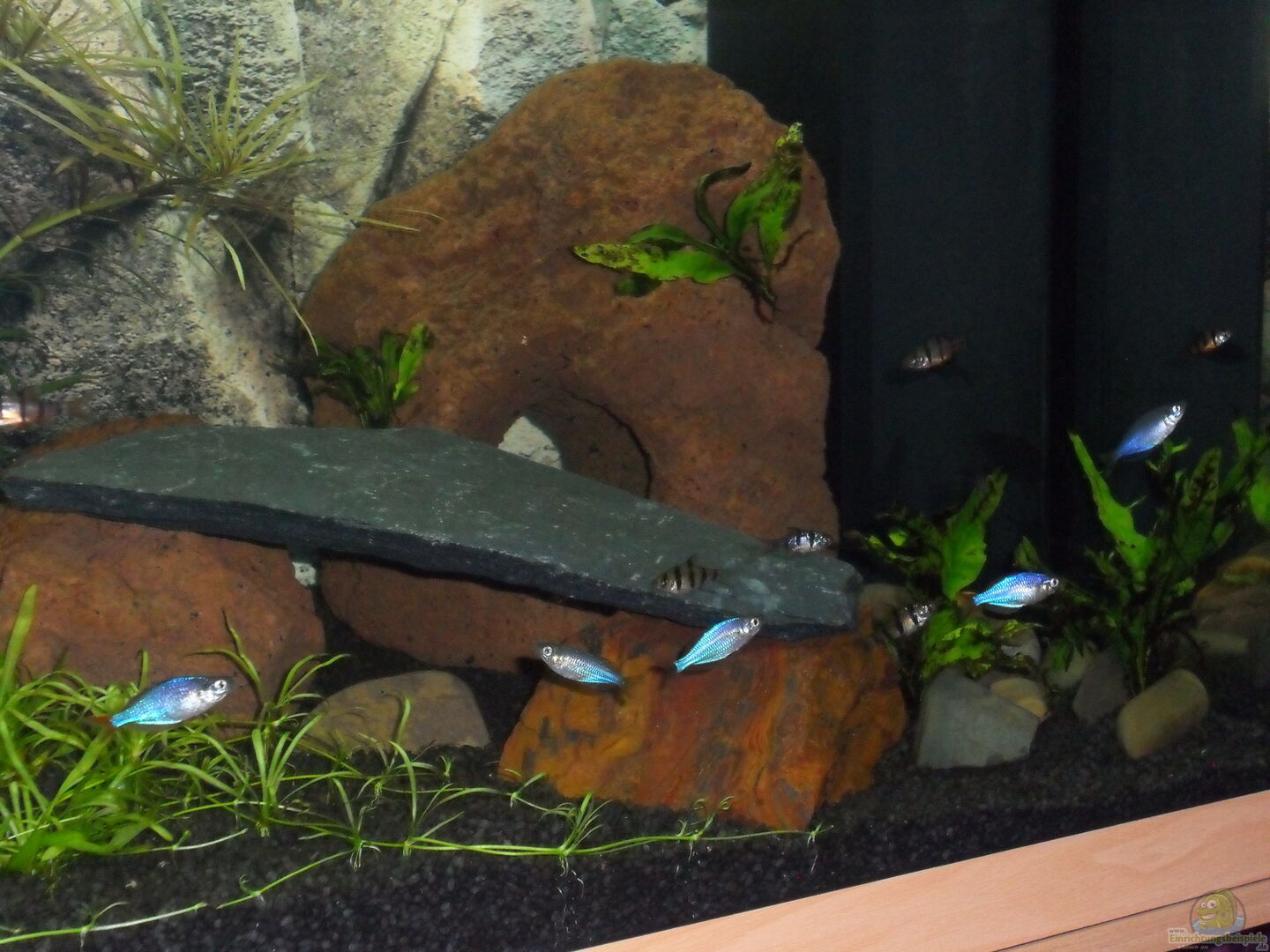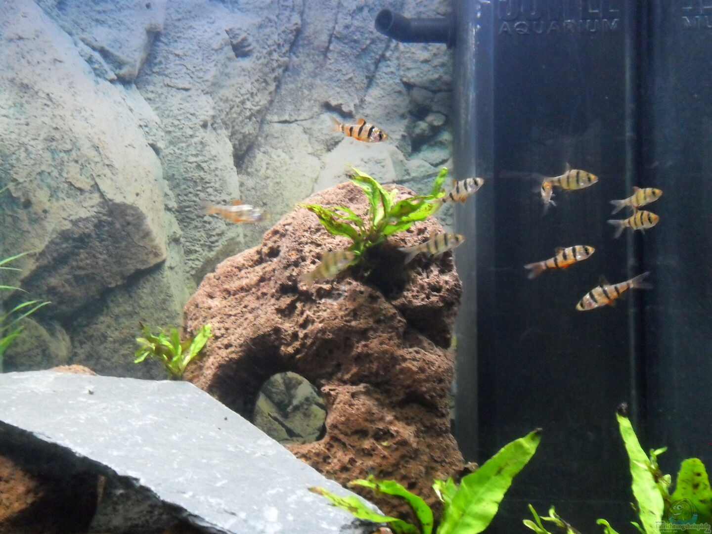 Bei der Einrichtung wird sich von selbst noch einiges ändern, sobald die Pflanzen besser gewachsen sind. Vielleicht könntest du noch mehr Wurzeln einbringen oder die Steine anders anordnen, so dass mehr Struktur, also unterschiedliche Beckenbereiche mit Sichtbarrieren, entsteht. Die Steine sehen im Moment auch noch recht unnatürlich angeordnet aus. Da darfst du noch experimentieren und schaun, wie es am besten funktioniert.