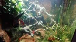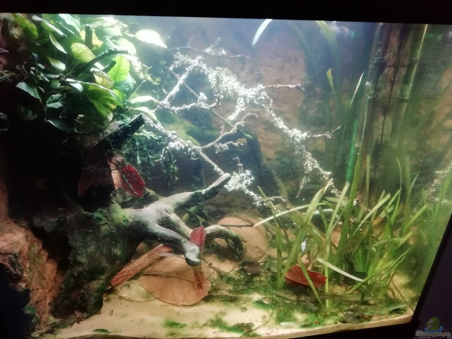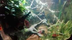 Die Eingewöhnung läuft noch, ist teilweise aktiv am schwimmen, dabei bewegt Er sich durch komplette Wassersäule. Dann sieht man Ihn wieder einen halben Tag gar nicht, weil er sich unter die Wurzel verzogen hat.