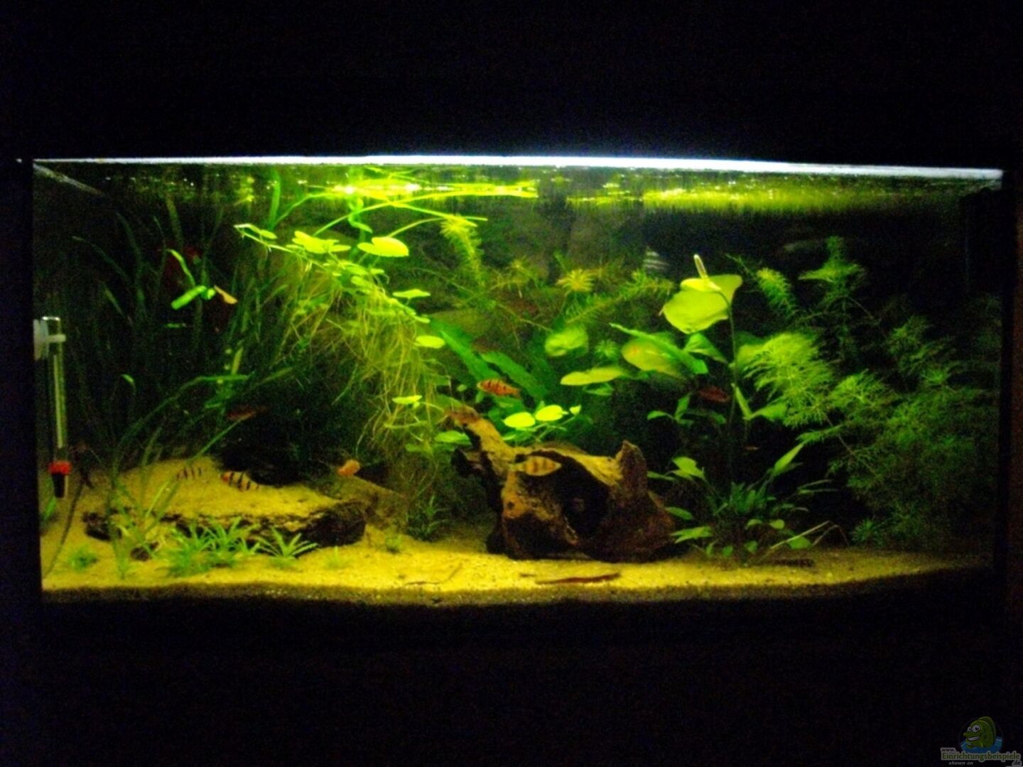 Dornaugenbesatz. ??berraschung: Die Dornaugen erweisen sich alles andere als rein dämmerungs-/nachtaktiv. -Sie schwimmen munter und rotzefrech tagsüber im Becken umher, kraxeln auf Blätter, wühlen sich durch feinfiedriche Pflanzen und lassen sich nicht mal durch meine Gärtnerarbeiten aus der Ruhe bringen :-)