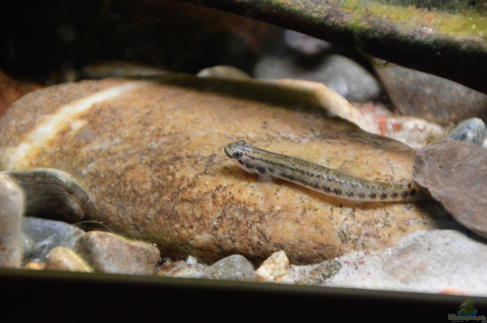 10.01.2017 Eigentlich hatte ich gar nicht mehr damit gerechnet, aber heute hing plötzlich eine kleine Rhinogobius an der Scheibe (eine Miniaturausgabe der Elter mit knapp über einem Zentimeter Länge). Keine Minute später entdecke ich noch eine zweite kleine Grundel zwischen den Steinen.