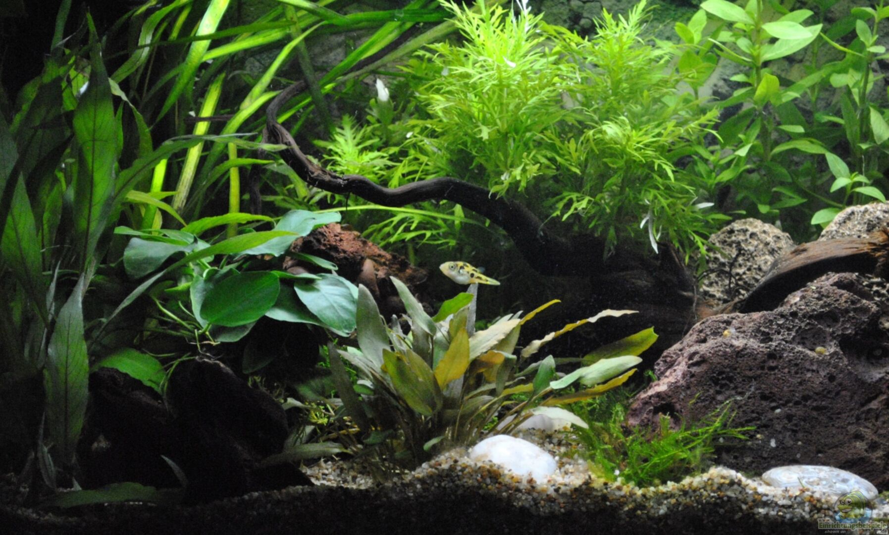 Bei diesem Aquarium handelt es sich um ein Komplettset vom Typ MP Aquastar 60. Ursprünglich als Quarantänebecken für das Ucayaliaquarium gedacht wurde es nun doch eingerichtet und zu einem Artaquarium für zwei Zwergkugelfische umfunktioniert. Um einen möglich naturgetreuen Lebensraum für die in Südindien beheimateten Süsswasserkugelfische zu schaffen wurde auf eine reichliche Bepflanzung (möglichst aus dem südasiatischer Raum) - hier spielt vor allem eine dichte Randbepflanzung sowie Moos eine wichtige Rolle - geachtet. Zudem wurden noch einige Dekorationsgegenstände wie eine Moorkienholz und eine bepflanzte Mangrovenwurzel sowie eine Kokosnusshöhle zur Bereichung eingesetzt.