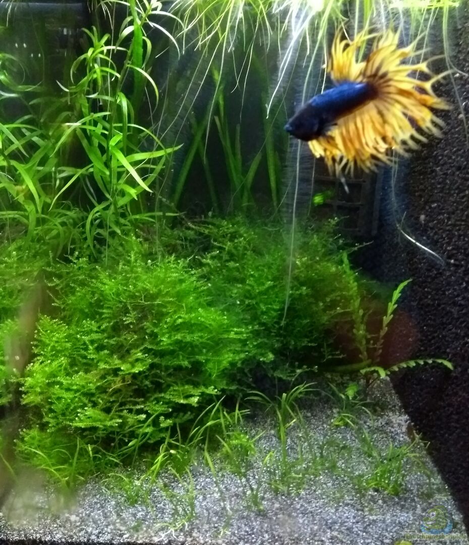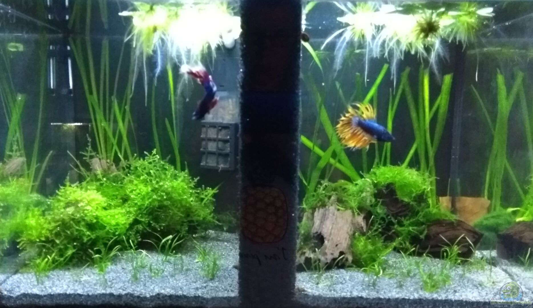 Auf Dauer hat es sich als Problematisch herausgestellt das Becken mit der Filtermatte zu trennen und nur einen Filter zu verwenden. Die Wasserqualität hat nach längerem doch recht gelitten. Darum wurde die Filtermatte entfernt und das Becken wird auch nur noch mit einem Betta besetzt, da ich das Gefühl habe, das die Fische für etwas mehr Platz dankbar sind.