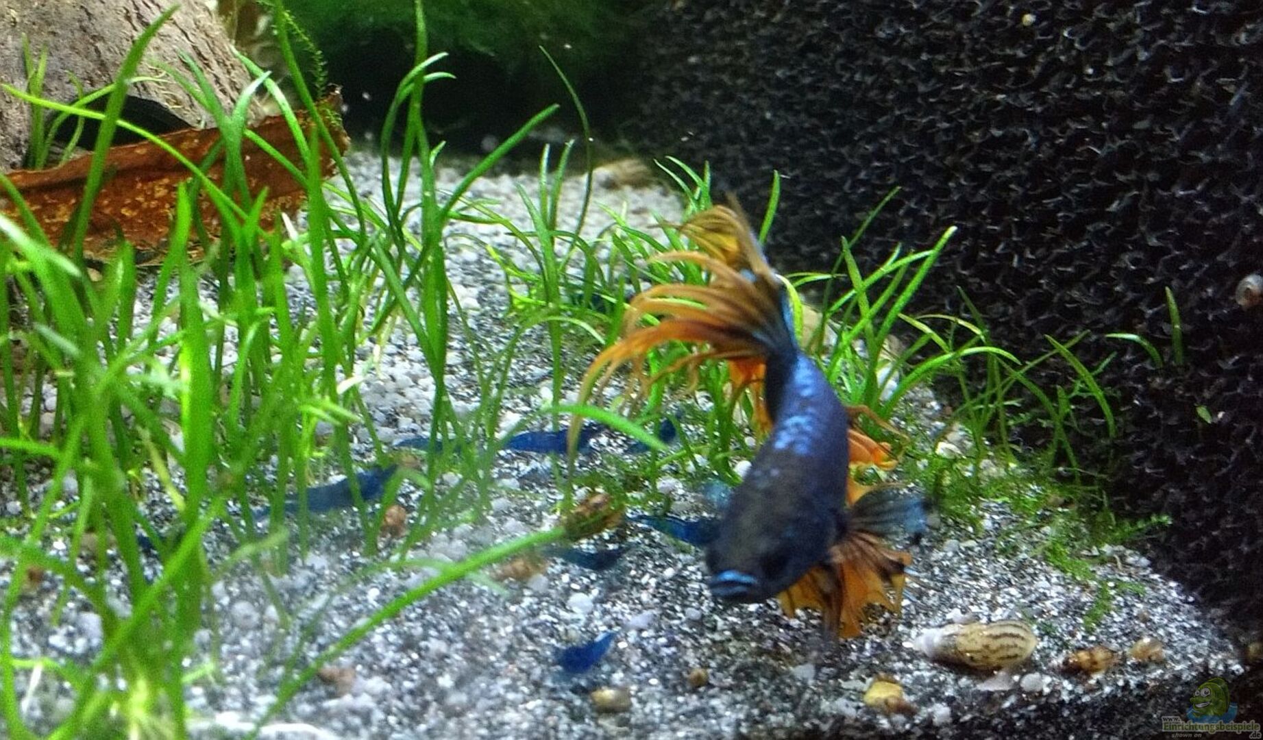 Keine Algenprobleme mehr. Das Becken hat sich inzwischen stabilisiert. Ein Bild von King und den Garnelen eingestellt. Betta splendens und Garnelen kann gut gehen - muss aber nicht. Hier hat sich der Betta an die Garnelen gewöhnt. Als wir King bekommen haben, hat er alle Garnelen zum fressen gern gehabt. Da er hier täglich Lebend- oder Frostfutter bekommt - scheint es ihm inzwischen zu Mühsam zu sein die Garnelen zu jagen. ;)