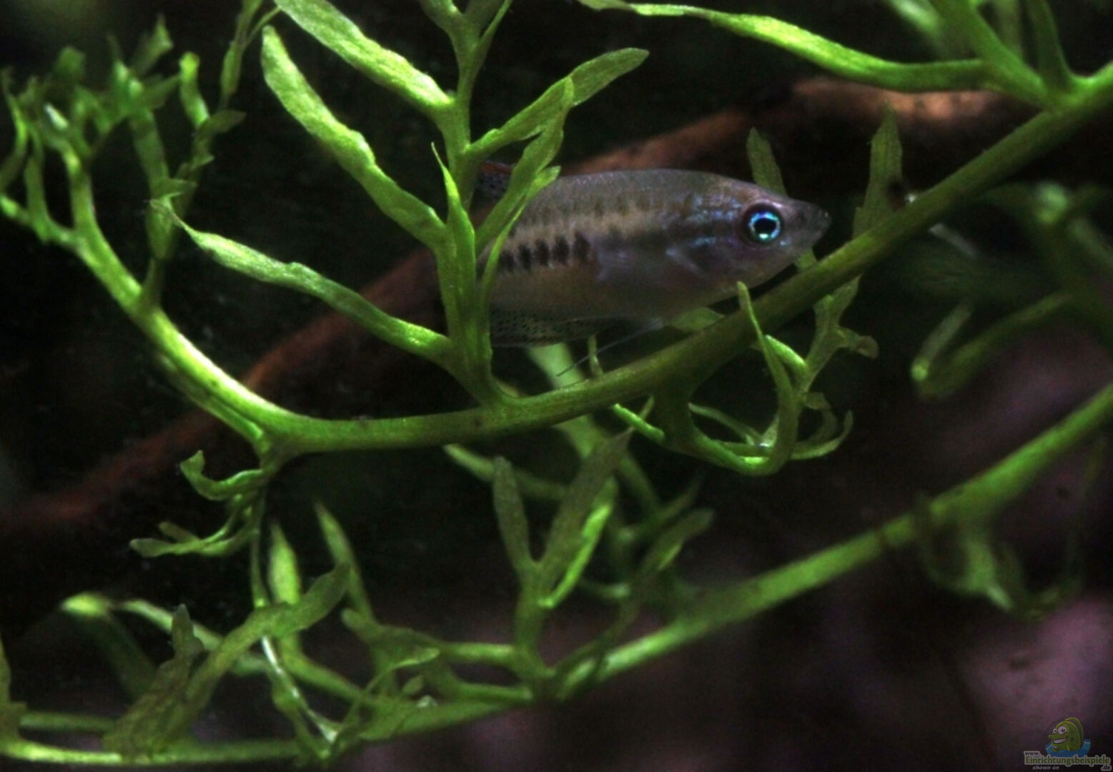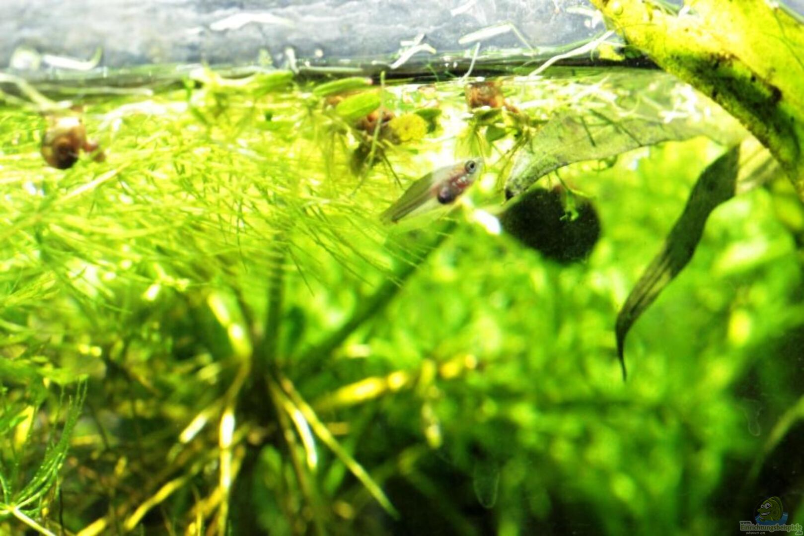 Trichopsis pumila agradece una cubierta vegetal densa, en un principio optamos por una combinación de plantas flotantes, (Ceratopteris cornuta, Salvinia natans, Riccia fluitans) junto con Cryptocorynes de hoja alta que queden flotando en superficie, las propias de su habitat ( C albida y C balansae ) .