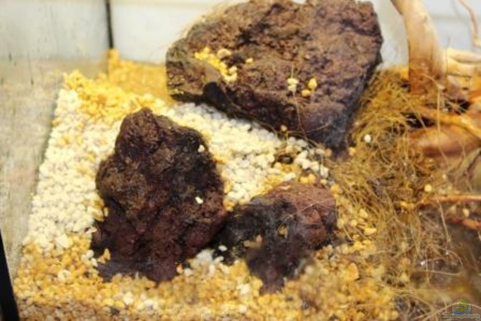 Dadas las dimensiones del acuario, poca profundidad 30 cm, unida a mi poca habilidad para el bricologe, no se contruye ninguna pared posterior. En su lugar se contruyen dos grandes solidos que se situan en los laterales del acuario. La construcción se realiza uniendo las rocas y raices con espuma expandible de poliuretano. Quedando sellados todos los espacios interiores. La fibra de coco se adhiere sobre la espuma cuando esta todavia está humeda. Para ajustarnos mejor a las dimensiones del acuario, toda la construcción se realiza en un molde de madera con las medidas exactas de la urna.