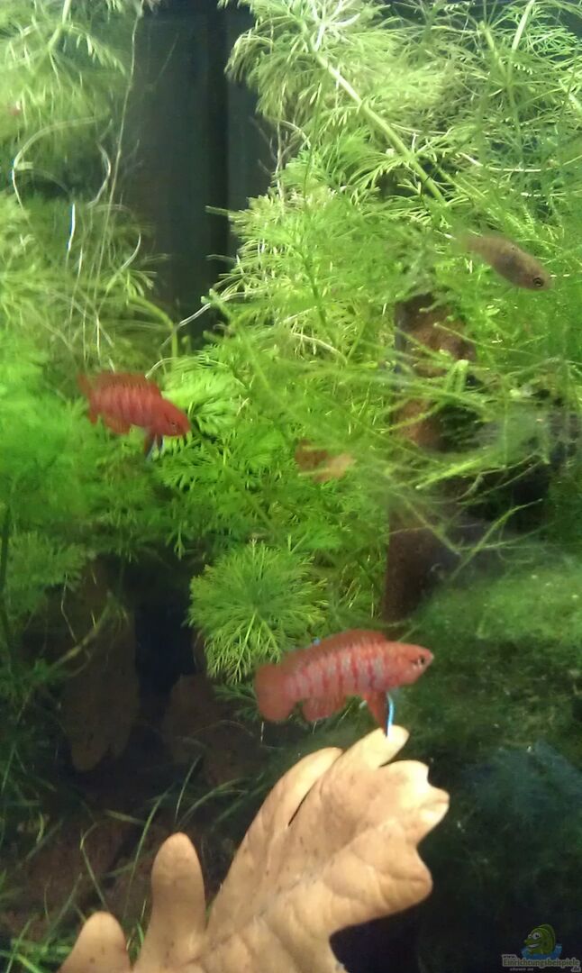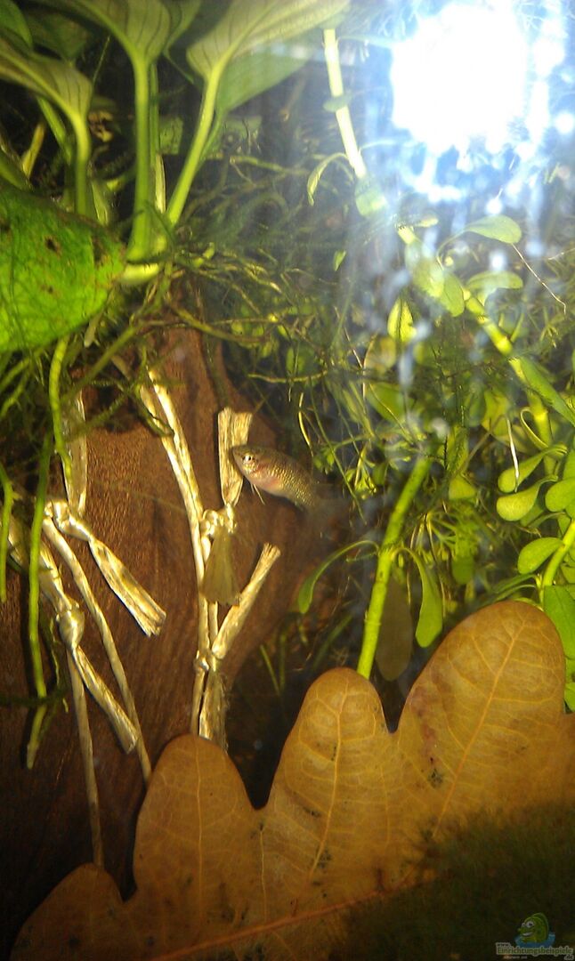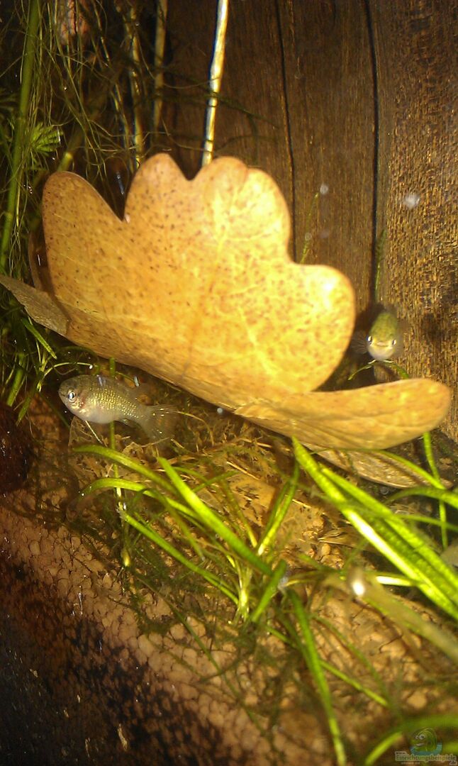 Ursprünglich war das Becken für Garnelen gedacht, jedoch hatte ich mit diesen irgendwie kein Glück, sodass Dario Dario einzogen. Durch die räumliche Trennung durch die Wurzel klappt das mit den 2 Männchen ganz gut und sie leben friedlich jeder auf einer Seite.