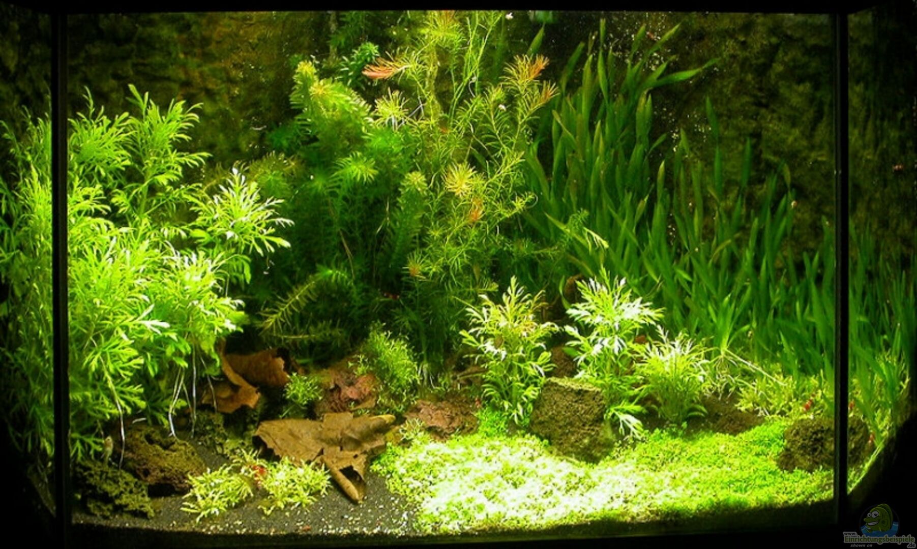 Dieses Becken ist eine sehr langfristige Planung gewesen und sollte als Naturbecken für Crystal Red Garnelen aufgebaut werden. Leider habe ich nach der Befüllung mit Wasser (Weihnachten 2006) fast nur Pech mit dem Becken gehabt. Algen in jeglicher Form und Farbe und zu allem ??berfluss starb fast die gesamte Garnelenpopulation im April 2007 (sie bewohnten das Becken seit Ende Februar 2007). Ich konnte eigentlich jeden Tag ein bis zwei tote rausholen. Habe daraufhin jeden zweiten Tag einen kleinen Wasserwechsel gemacht, aber auch das hat nicht geholfen. Mittlerweile denke ich, dass das sogar die Ursache war, da ich nicht immer das Wasser aus der Leitung habe ablaufen lassen.
