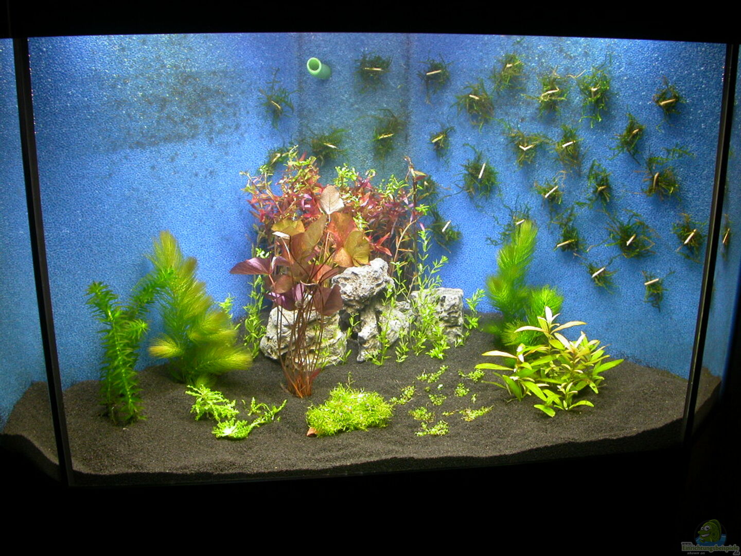 Dann mit Schaumstoffrückwänden und einem Hamburger Mattenfilter neu gestartet. Auch der Bodengrund ist neu. Diesmal von Dennerle Garnelenkies, weil ich damit gute Erfahrungen in meinem Nanocube gemacht habe.