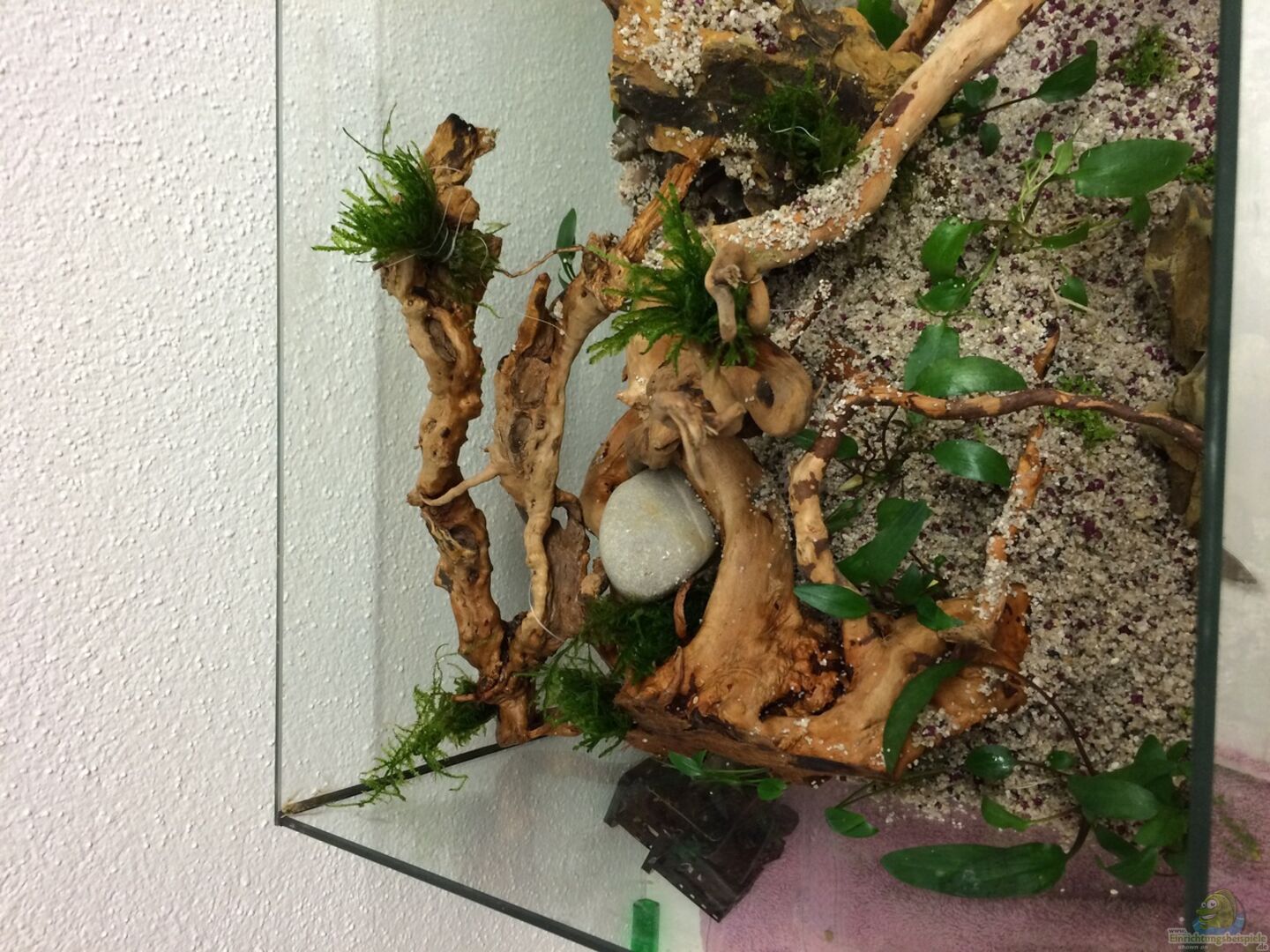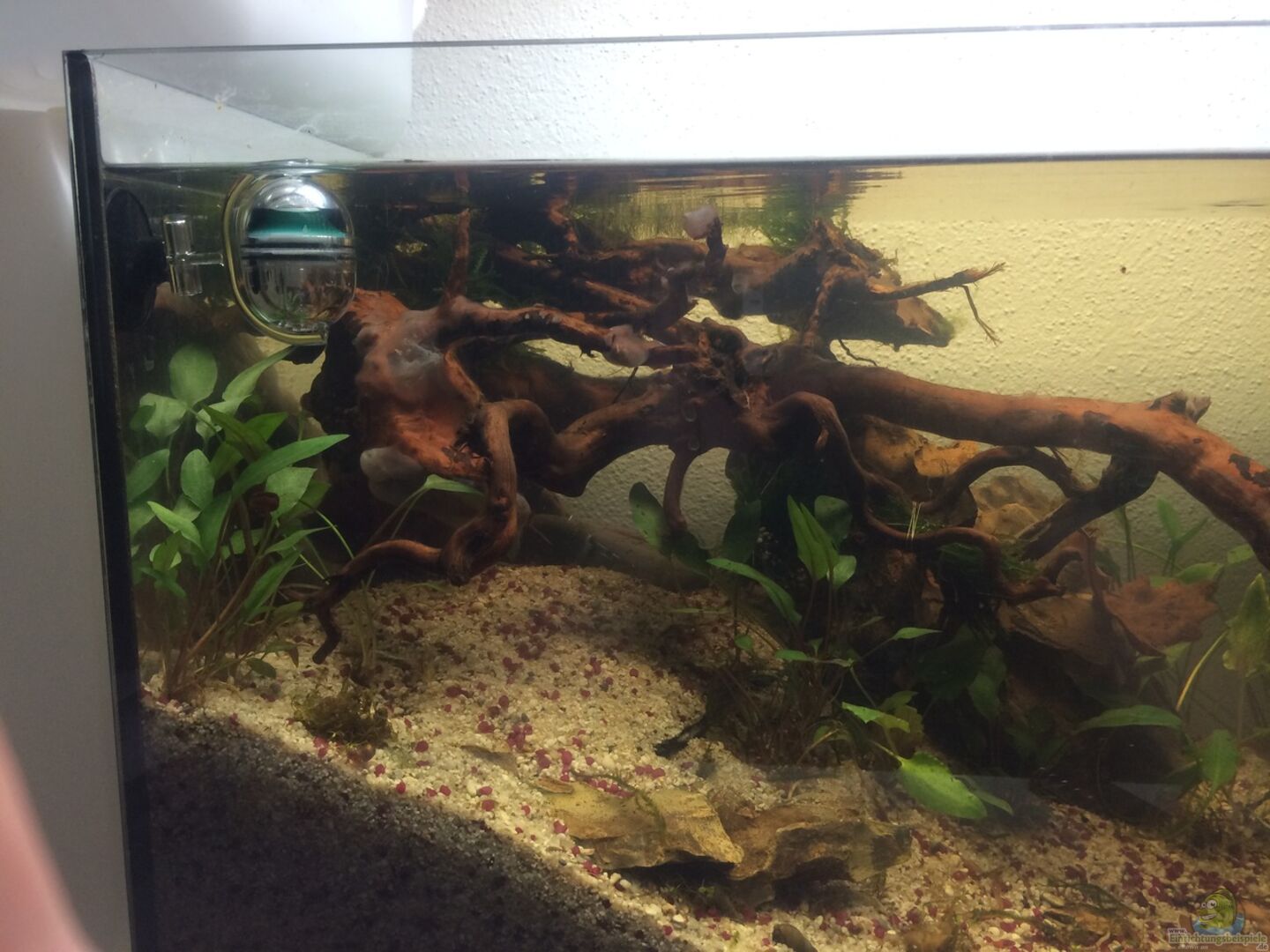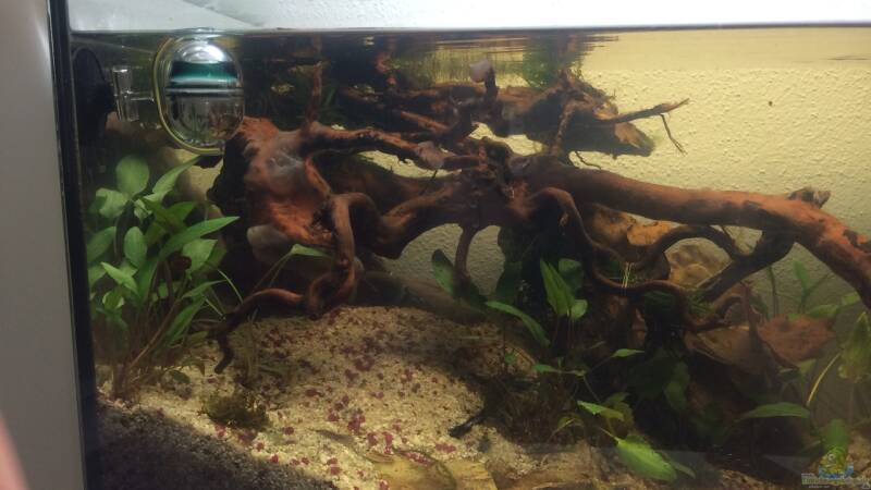 ??ber einen "selbergebauten" Eckmattenfilter mit einer Mattenstärke von 5 cm und PPI 30. Der Filter wird mit dem Circulator 500 von "Aquael" betrieben.