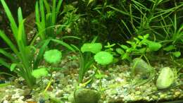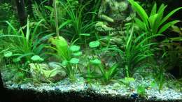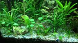 Kies hell Körnung 4mm, nach hinten ansteigend. Leider ist er ein klein wenig mit blauen und roten Kieseln durchsetzt, keine Ahnung was die Vorbesitzerin da getrieben hat. Ich muss zugeben, ich habe das Becken im laufenden Betrieb übernommen und war auch ein blutiger Anfänger. Heute bereu ich es dass ich den Kies nicht durchgewaschen und störende Steinchen entfernt habe aber nun ist es mal so.
