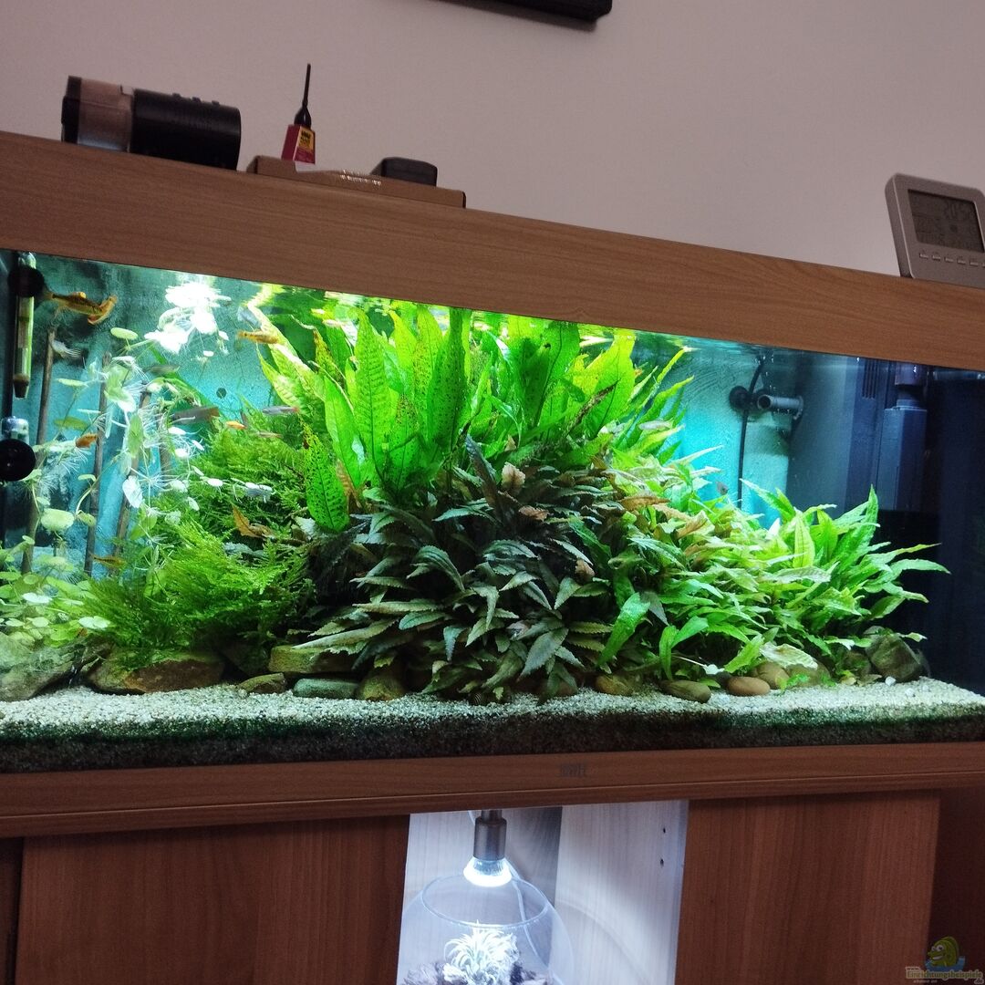 Es handelt sich um ein handelsübliches 180 Liter Juwel Aquarium. Der Temperaturbereich der Pflanzen und Tiere die in diesem Aquarium leben, liegt zwischen 20 Grad Celsius und 23 Grad Celsius. Das bedeutet das durch die Abwärme des Filters, des Skimmers und der Beleuchtung auf eine Beheizung verzichtet werden kann. Sozusagen fährt das Becken Zimmertemperatur. Ein eingebauter Heizstab fungiert lediglich als Sicherung um die Temperaturen aufrecht zu erhalten, falls die Temperatur der Wohnung durch unvorhergesehene Gründe wie zum Beispiel dem Ausfall der Heizung kühler sein sollten. Die Strömung des Filters wird schräg auf die Frontscheibe gelenkt und dort gebrochen, da der Bioflow M eine starke Strömung mit sich bringt. Durch die Anordnung des Filter Auslasses, der Dekoration und Pflanzen befinden sich im Becken somit starke Strömungen wie auch recht ruhige strömungsarme Bereiche, im Bezug auf die Strömung unter Wasser als auch bei der Oberflächenströmung. Der Tierbesatz besteht nur aus Tieren und Pflanzen der asiatischen Gefilde.