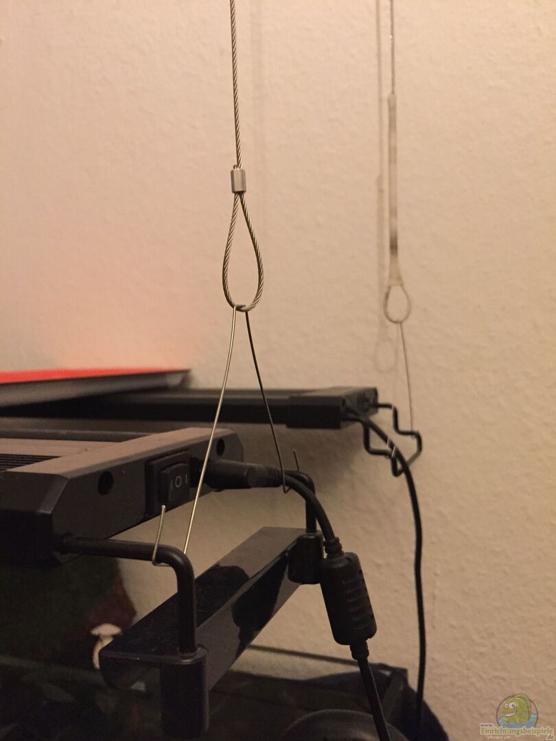 Nicrew Lampe auch "geflogen" Eigenbaukonstruktion an Stahlseil und Stellaufnahmen zur Justierung.