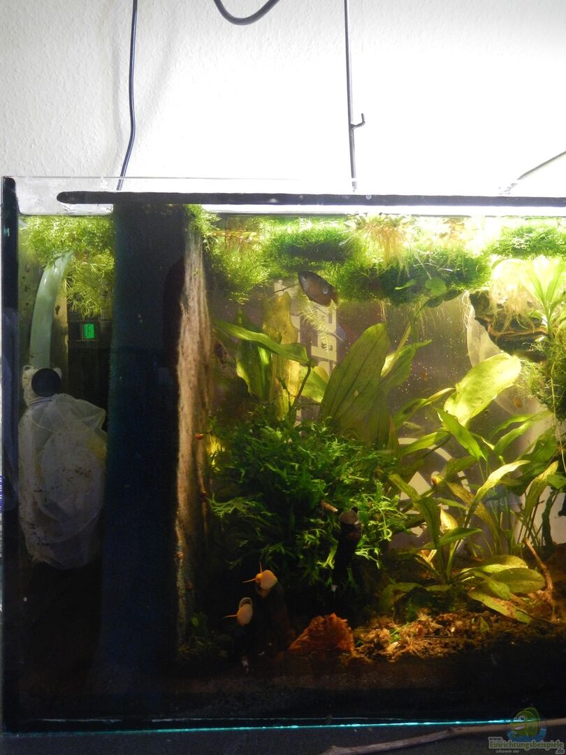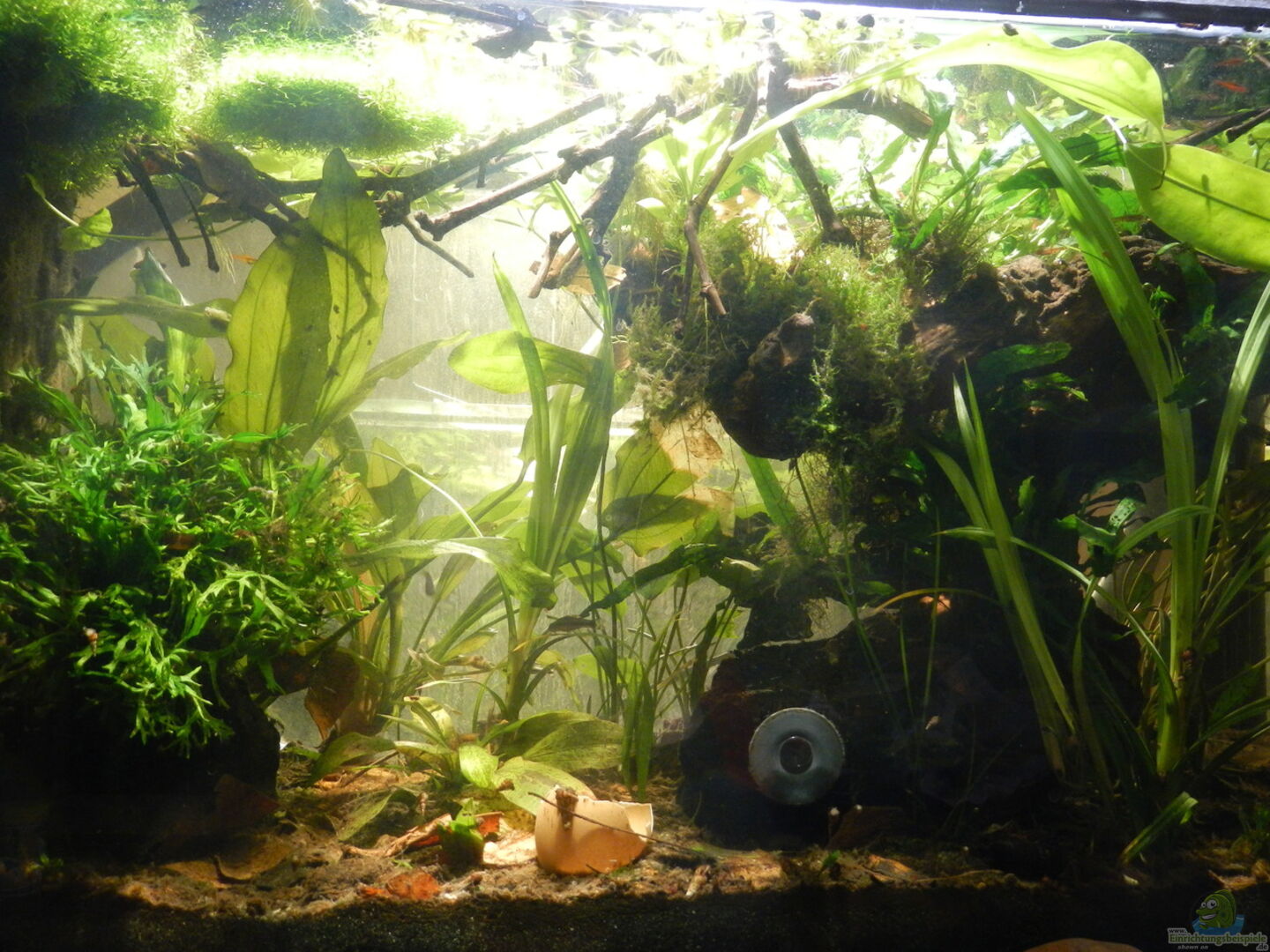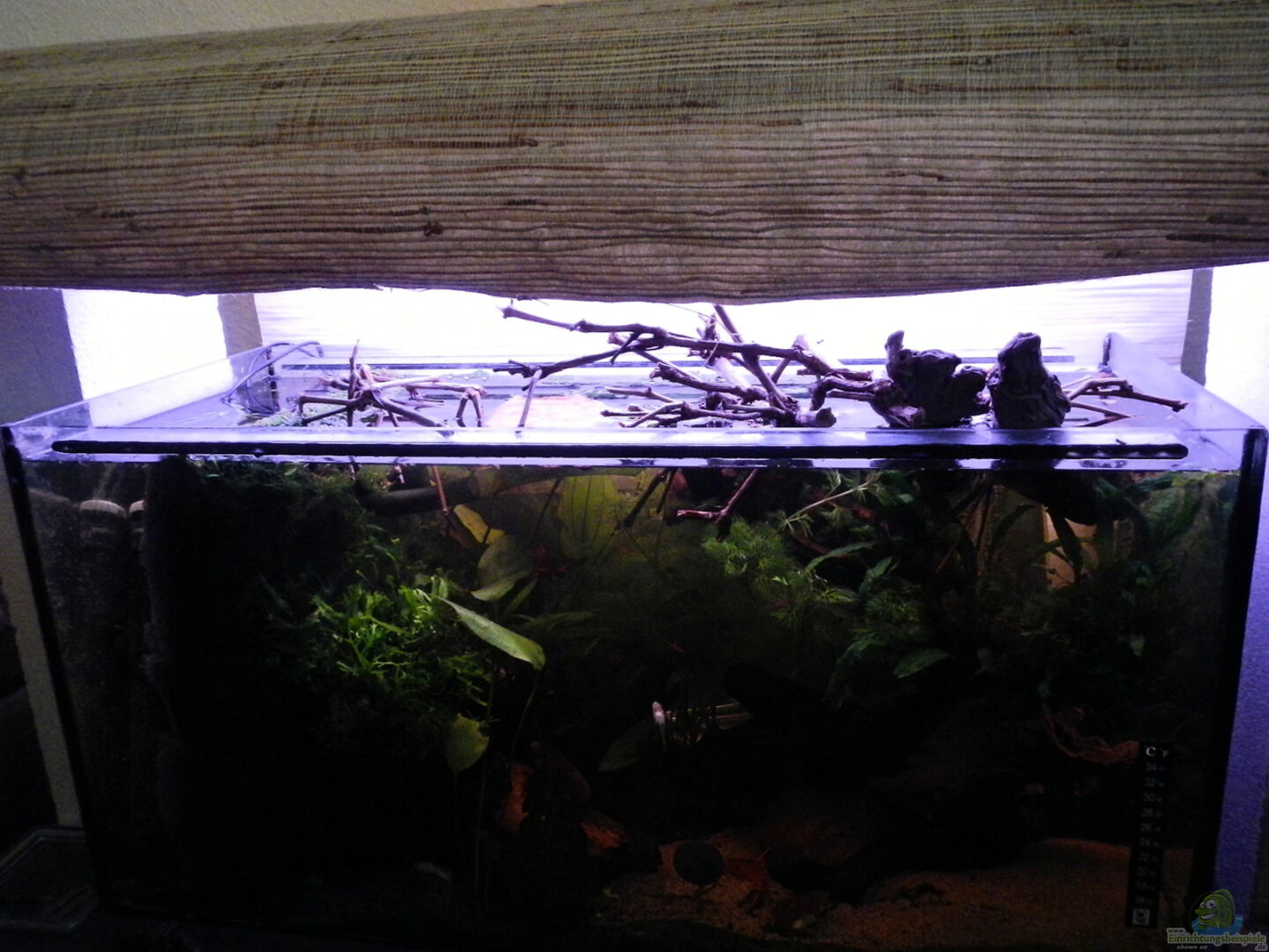 2 Moorkien-Wurzeln. Ich habe gelesen, dass sich die Tiere zur Paarungszeit in den wurzeldurchsetzten oder pflanzenüberhangenen Uferzonen Reviere abstecken. Habe mit Ästen von unserem Wein (Echter Wein) das Becken in Reviere unterteilt. Ich hoffe, die Guramis sehen das auch so.